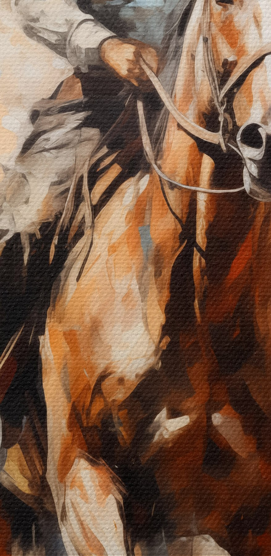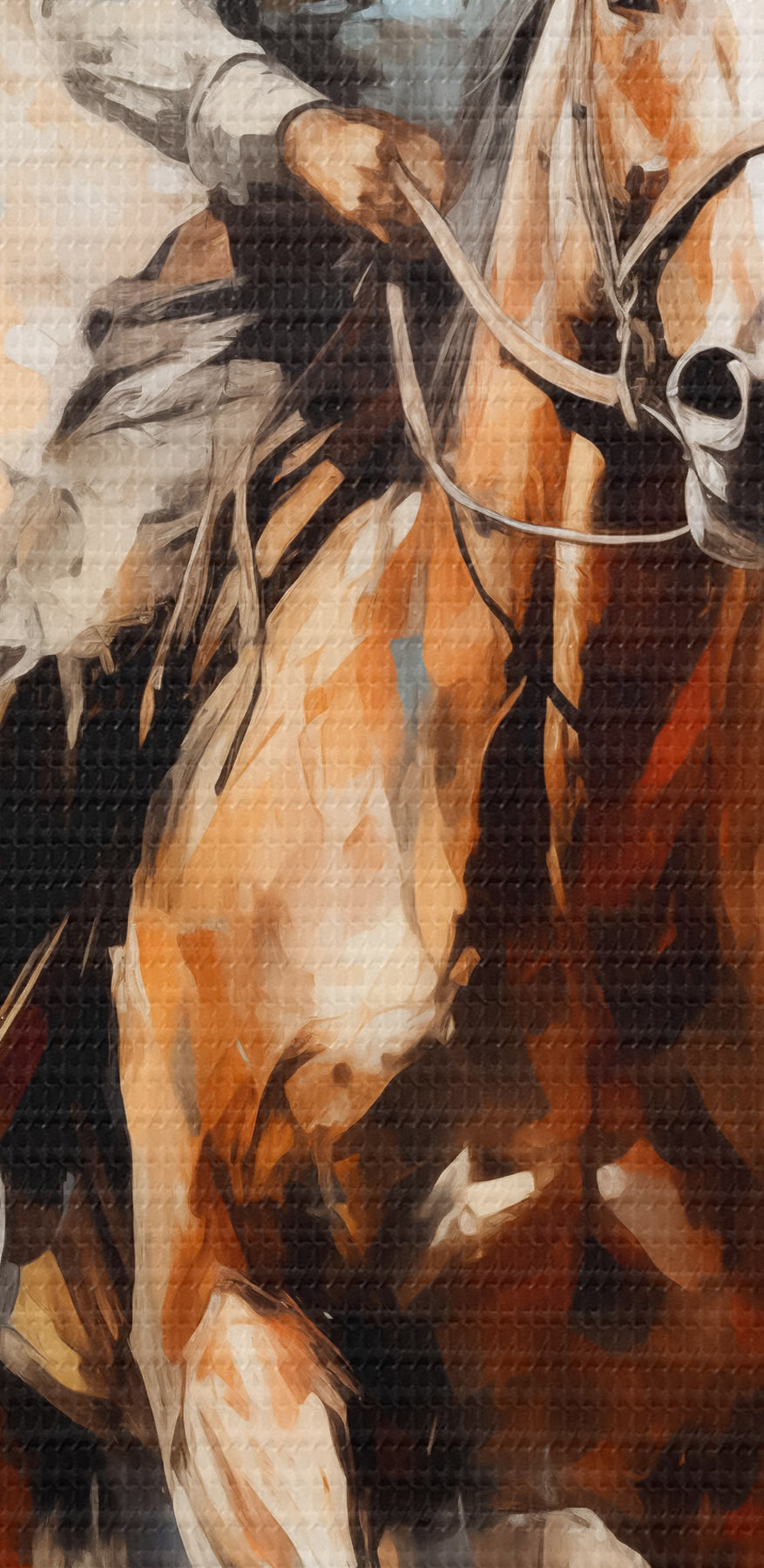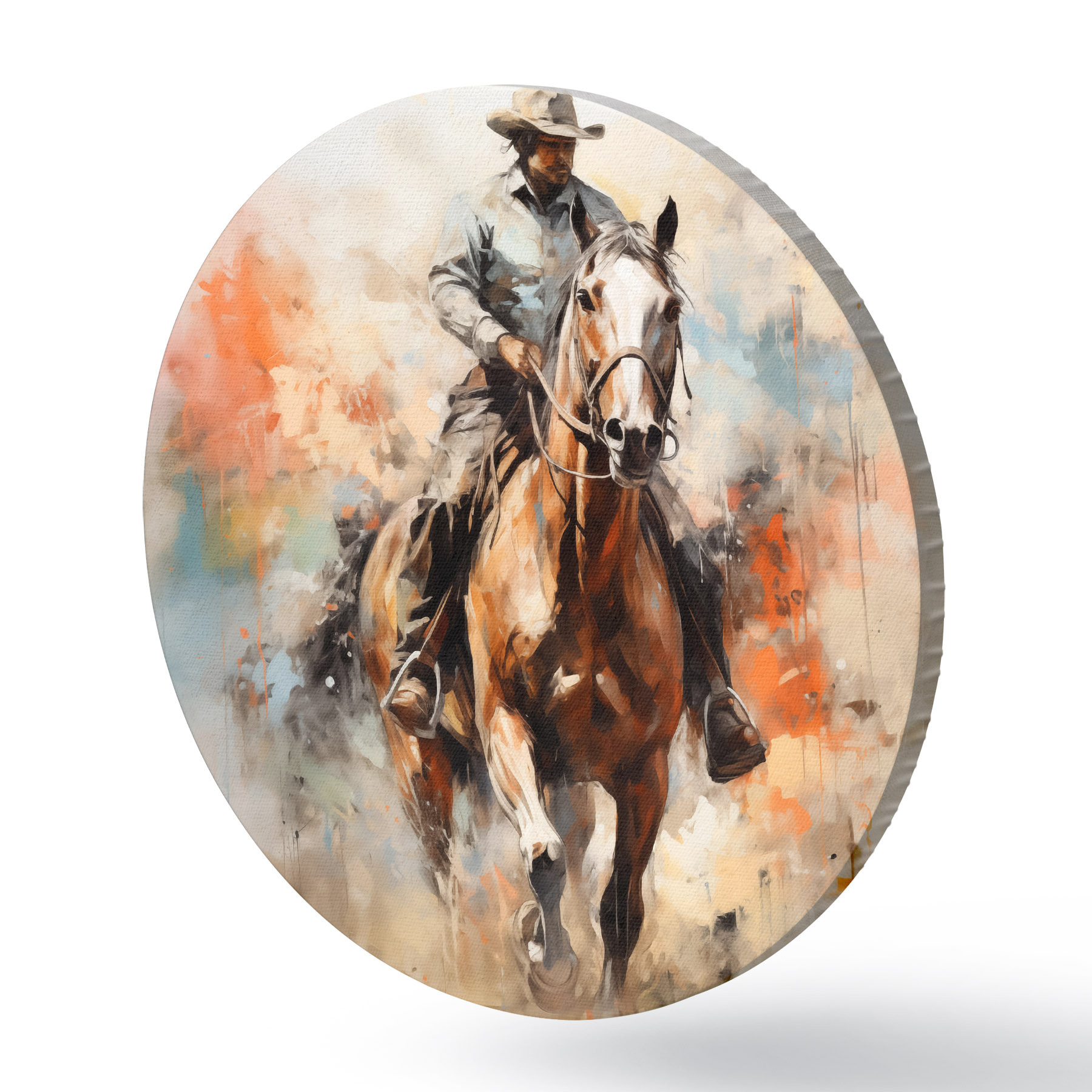 Nuotrauka Raitelis kaubojus su skrybėle šokinėja ant rudo arklio aliejumi tapyto abstraktaus meno paveikslo Nr r39181
