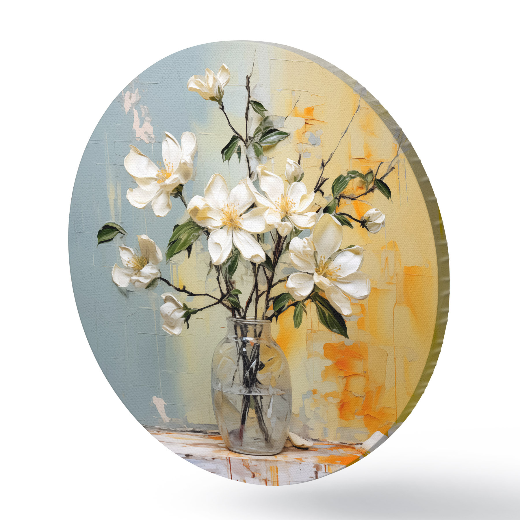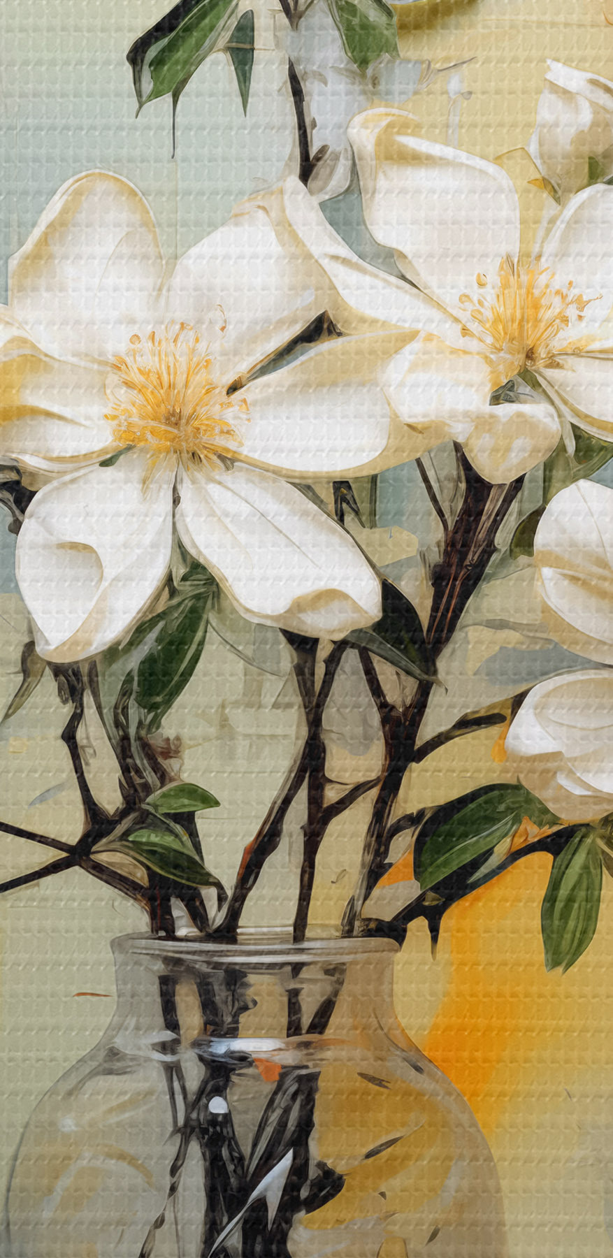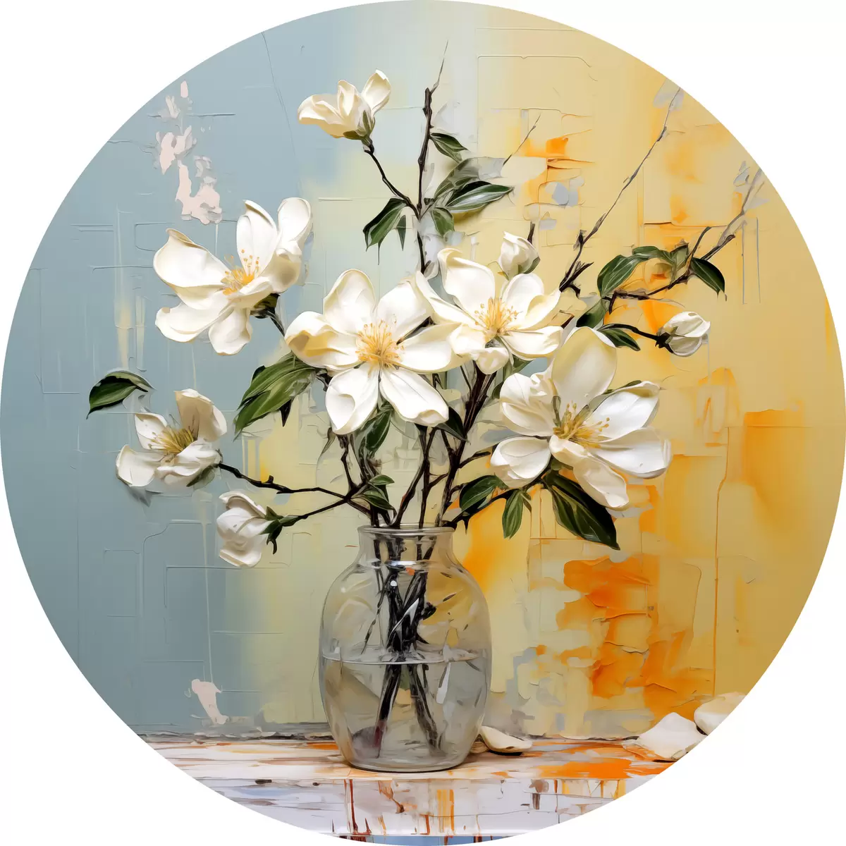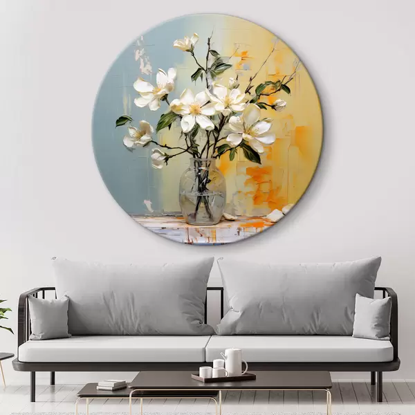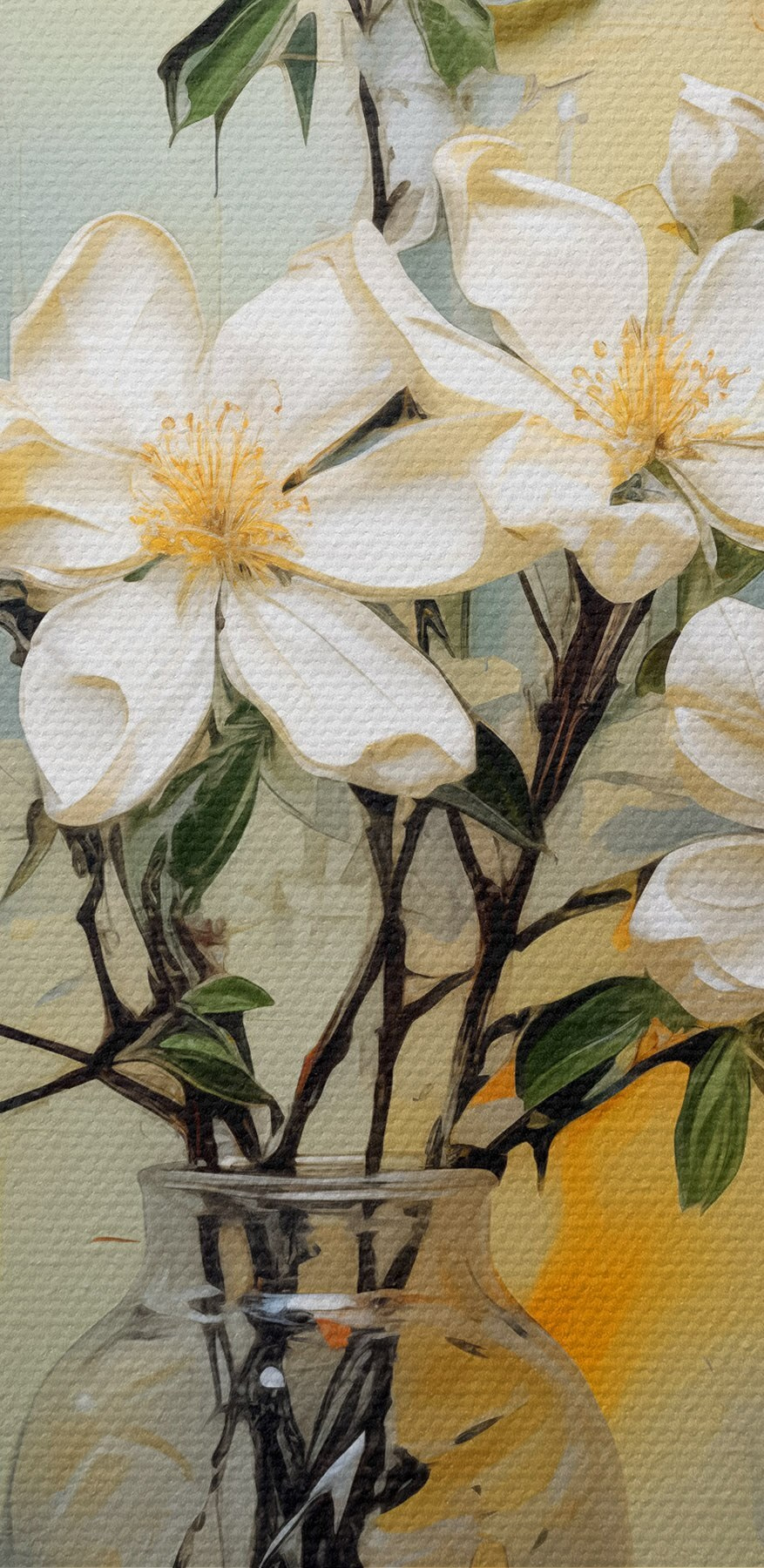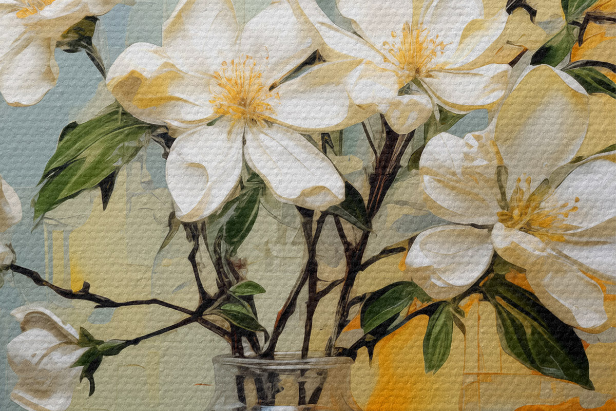 Nuotrauka Šakelės su baltais jazminų žiedais stiklinėje vazoje aliejinis paveikslas abstraktus menas, mėlynos ir geltonos spalvos Nr r39183