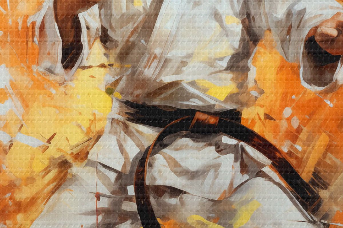 Nuotrauka Karateka baltu kostiumu su juodu diržu aliejinis paveikslas abstraktus menas, oranžinės ir juodos spalvos Nr r39185