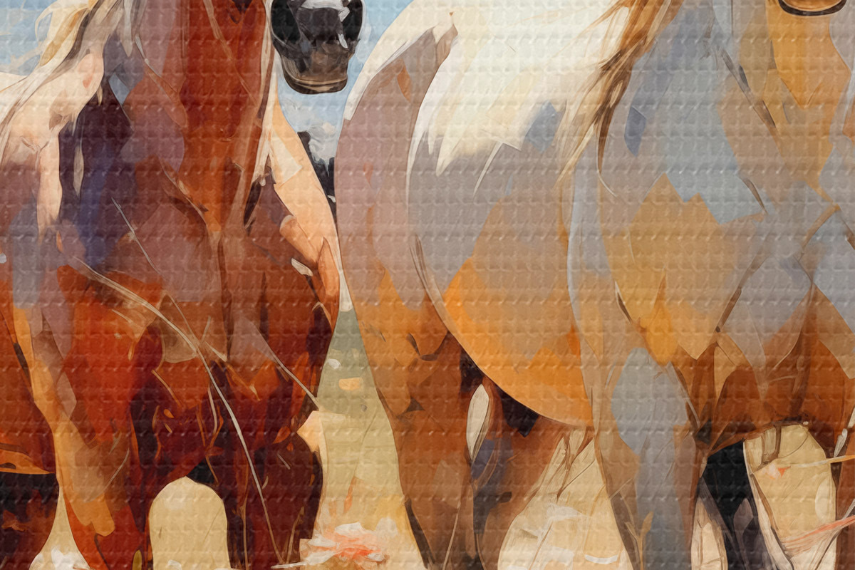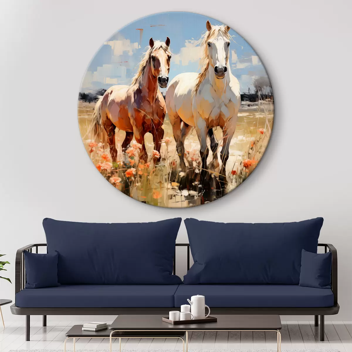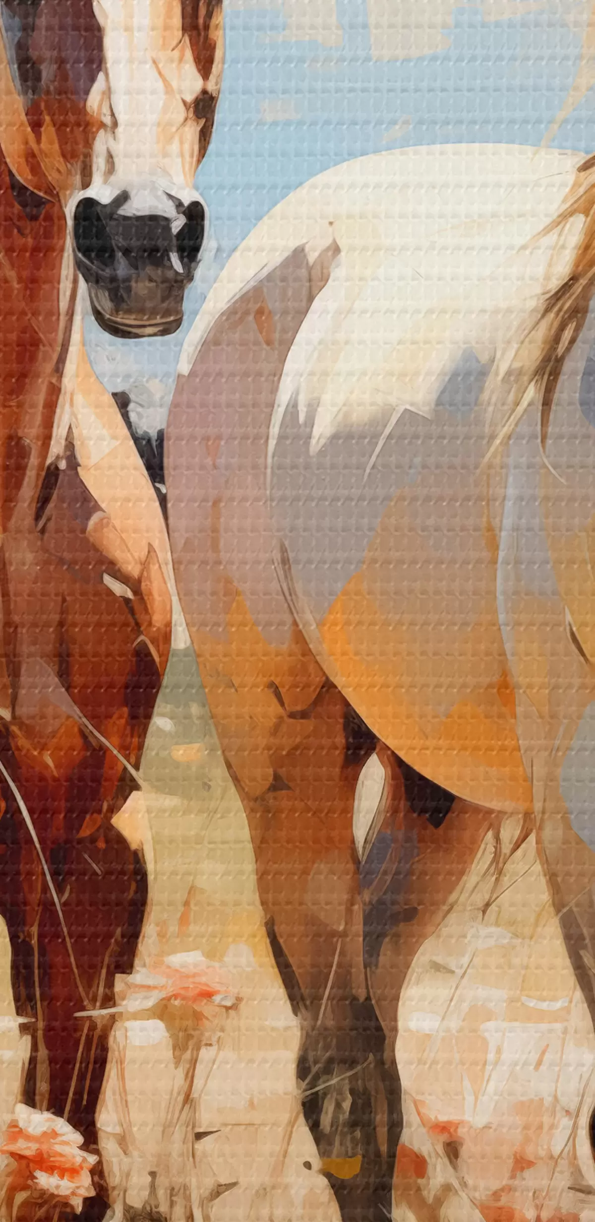 Nuotrauka Baltos ir rudos spalvos arkliai ganosi pievoje tarp lauko gėlių, tapybos abstrakčiąja aliejumi Nr r39187
