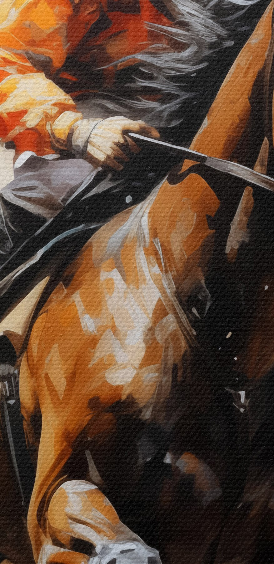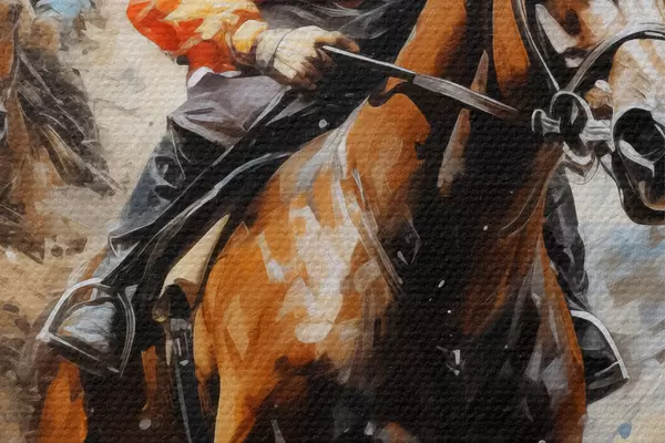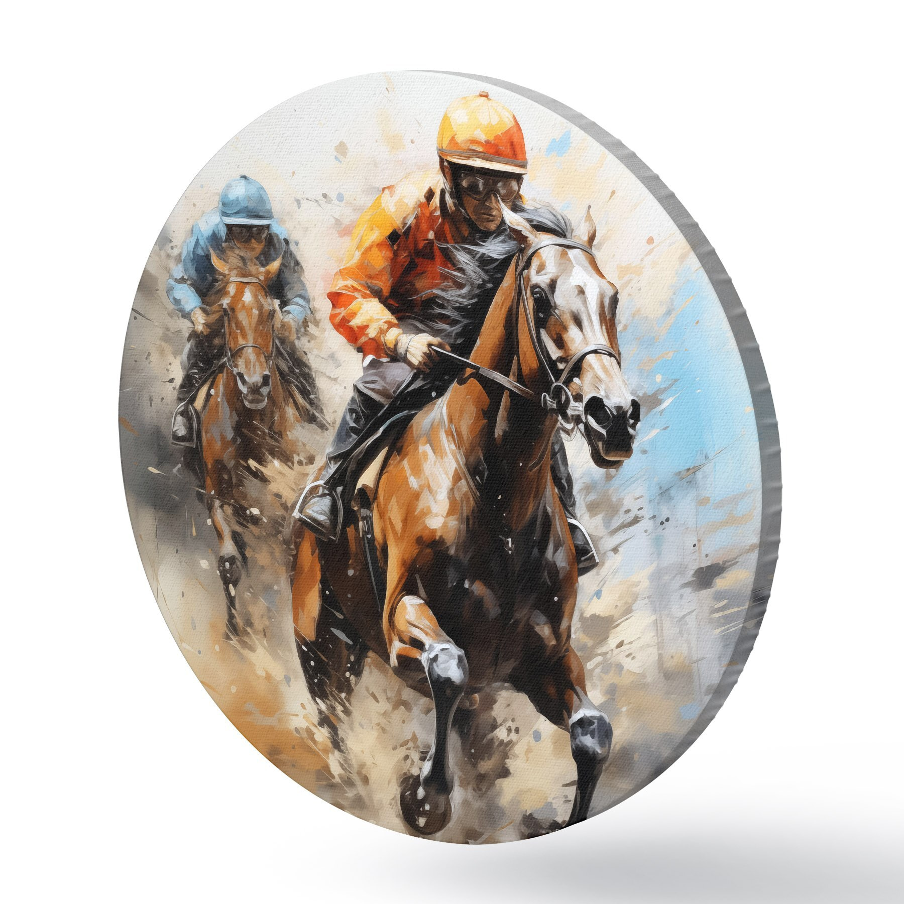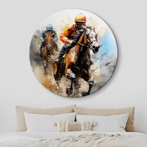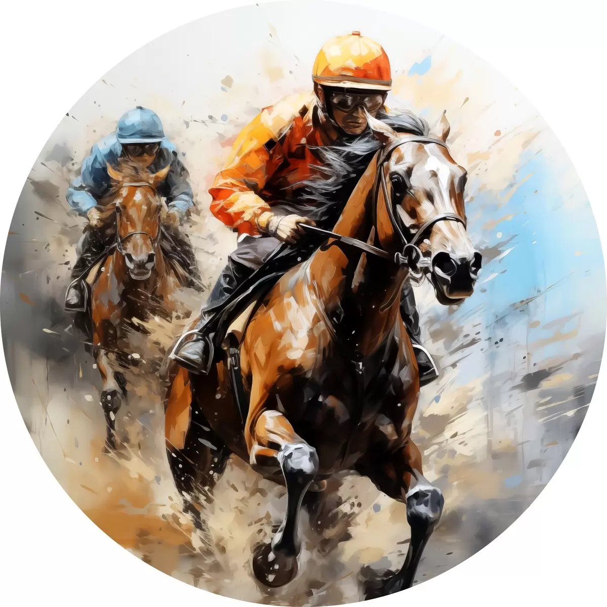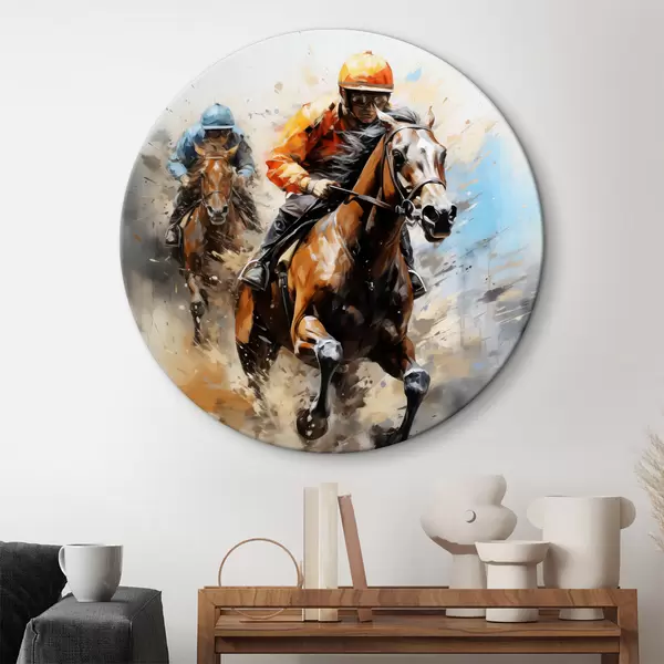 Nuotrauka Raiteliai, šuoliuojantys ant žirgų hipodrome, žmonės, aliejinė tapyba, mėlyna, oranžinė, ruda spalva Nr r39190