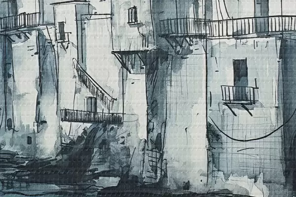 Nuotrauka Akvarelinis miesto eskizas ant vandens mėlynomis spalvomis Nr r39323