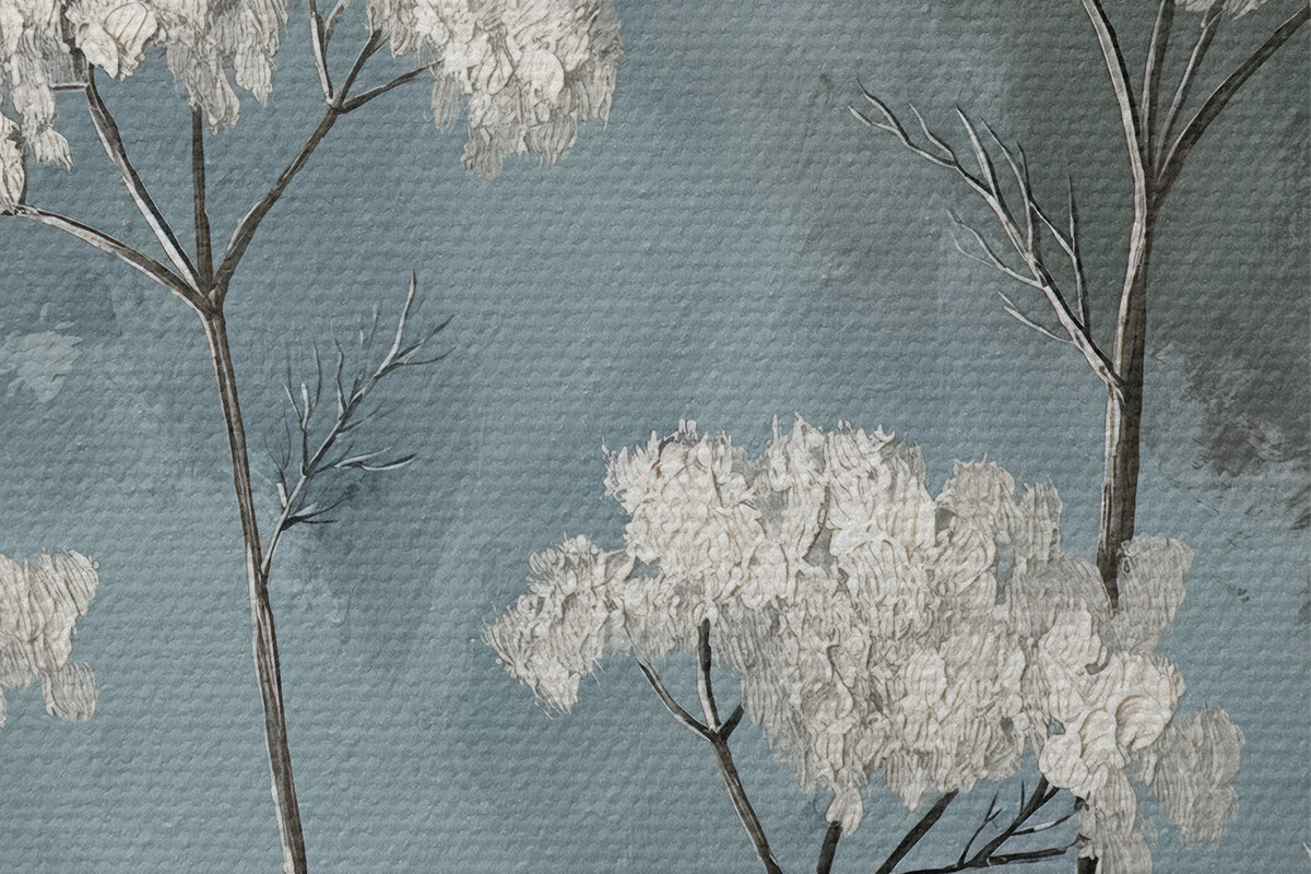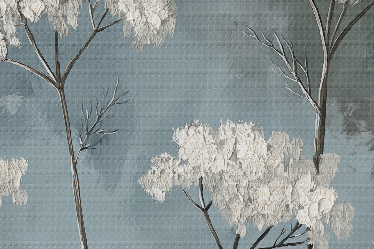 Nuotrauka aliejinė tapyba iš švelnių baltų gėlių mėlyname fone Nr r39325