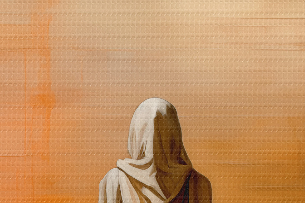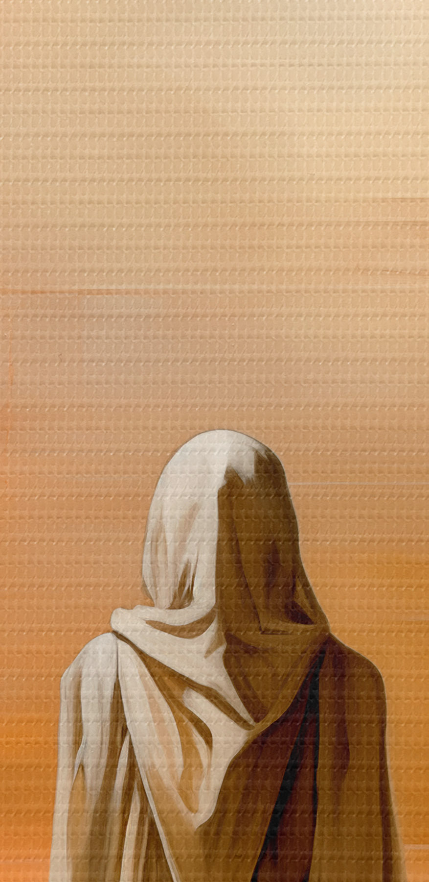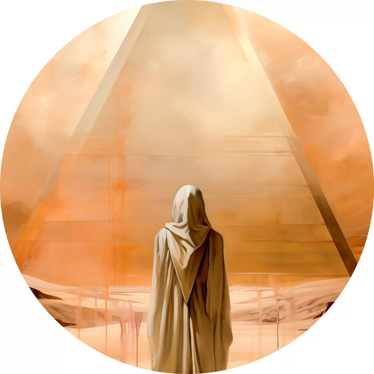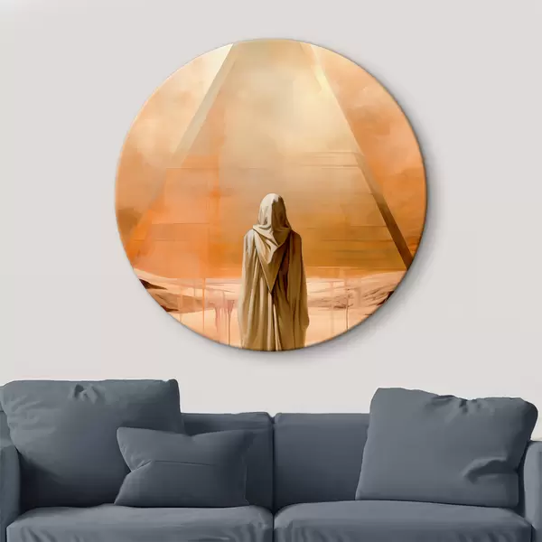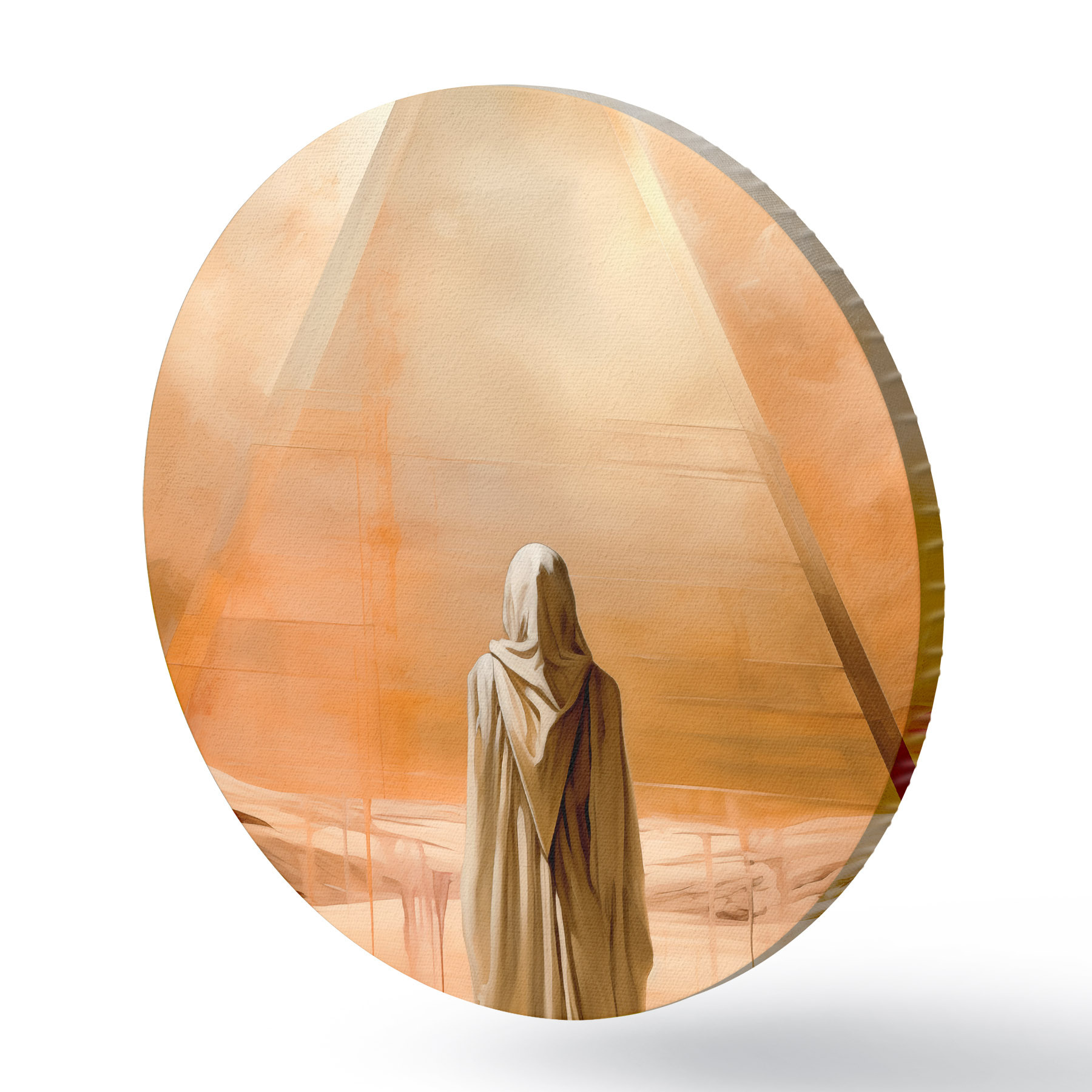 Nuotrauka Vyro baltu apsiaustu su gobtuvu siluetas piramidės fone dykumoje Nr r39329