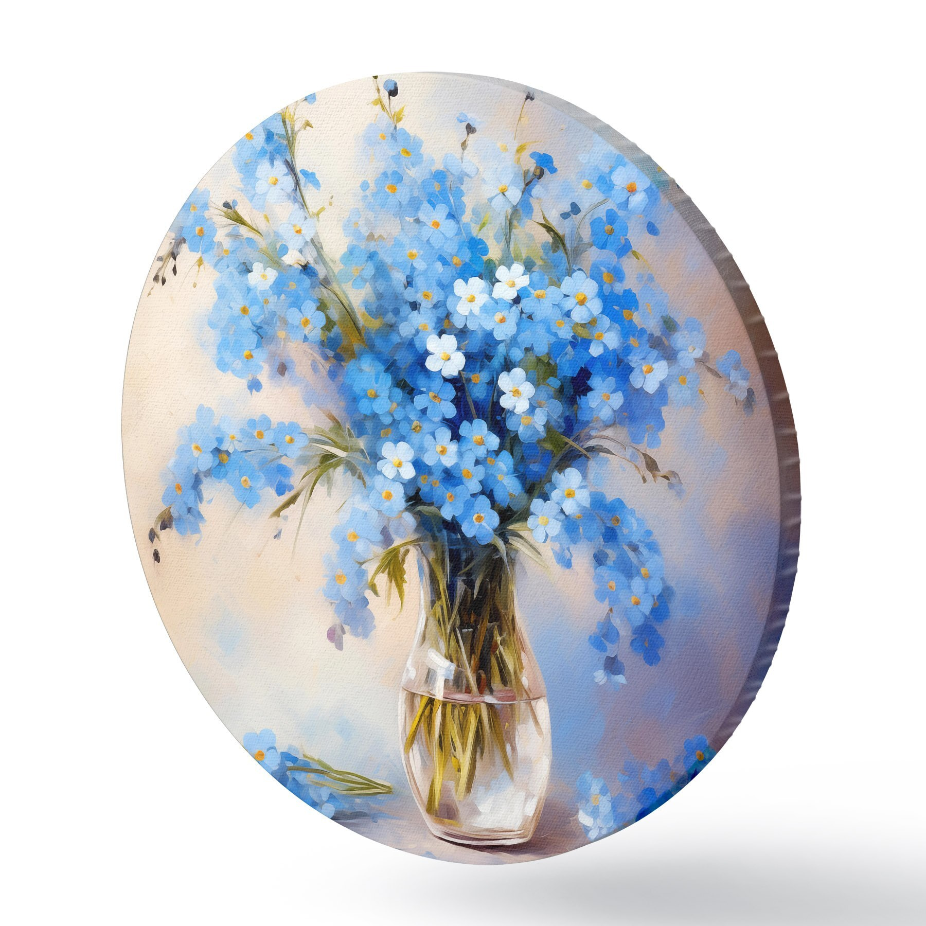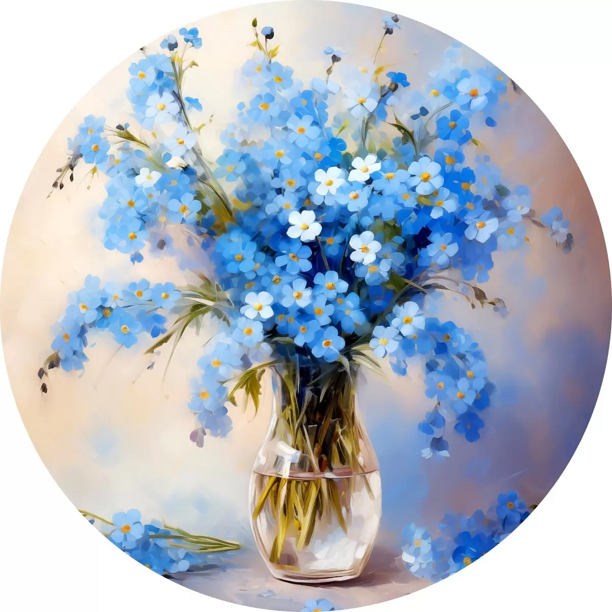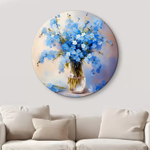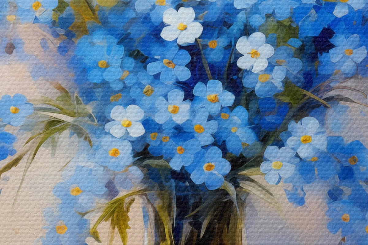 Nuotrauka Mėlynų lauko gėlių puokštė stikliniame dekanterio aliejiniame paveiksle Nr r39331