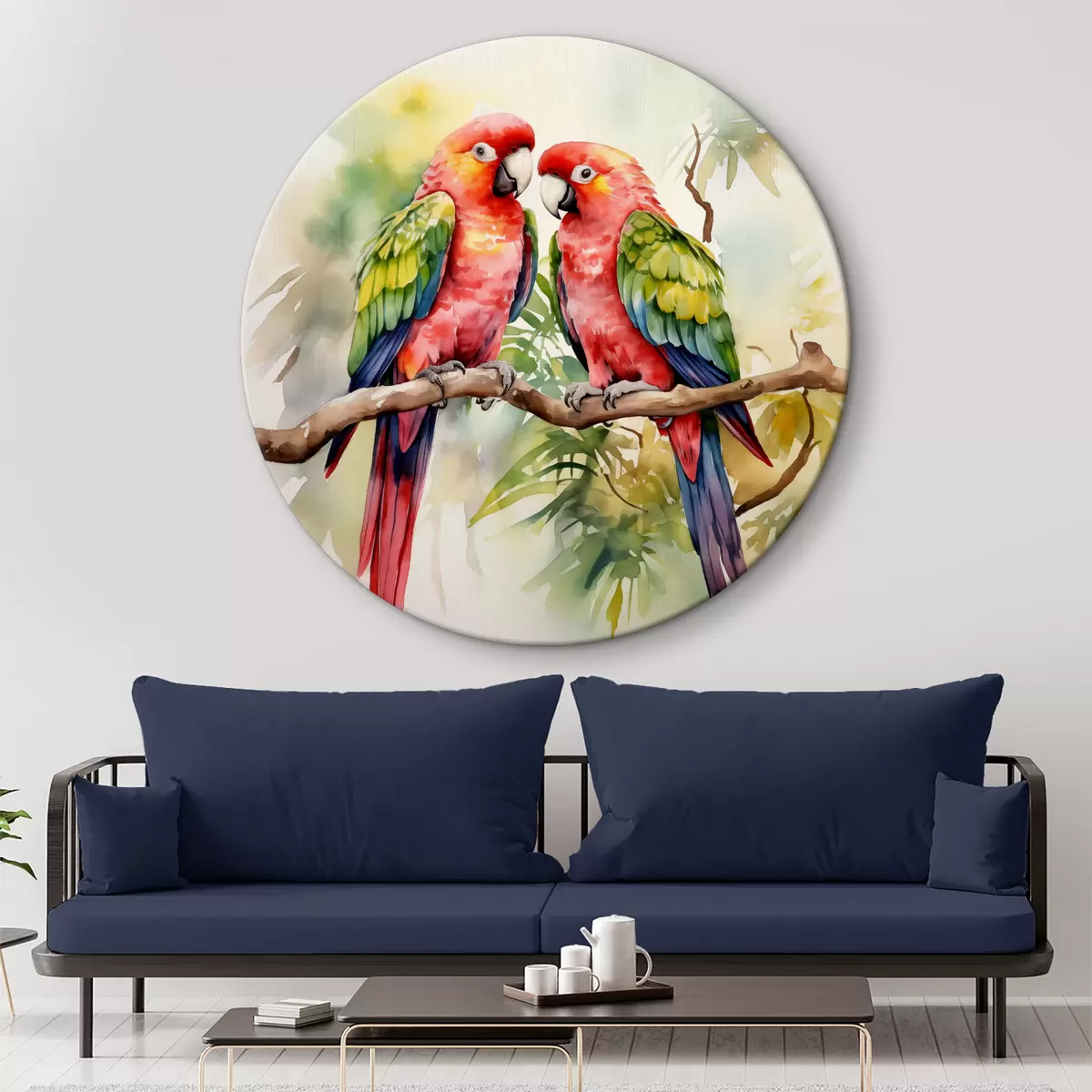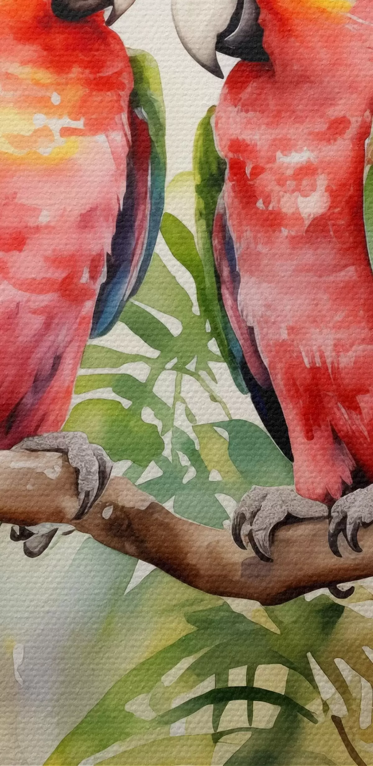 Nuotrauka Dvi ryškios aros papūgos, sėdinčios ant vienos šakos, akvarelė Nr r39333