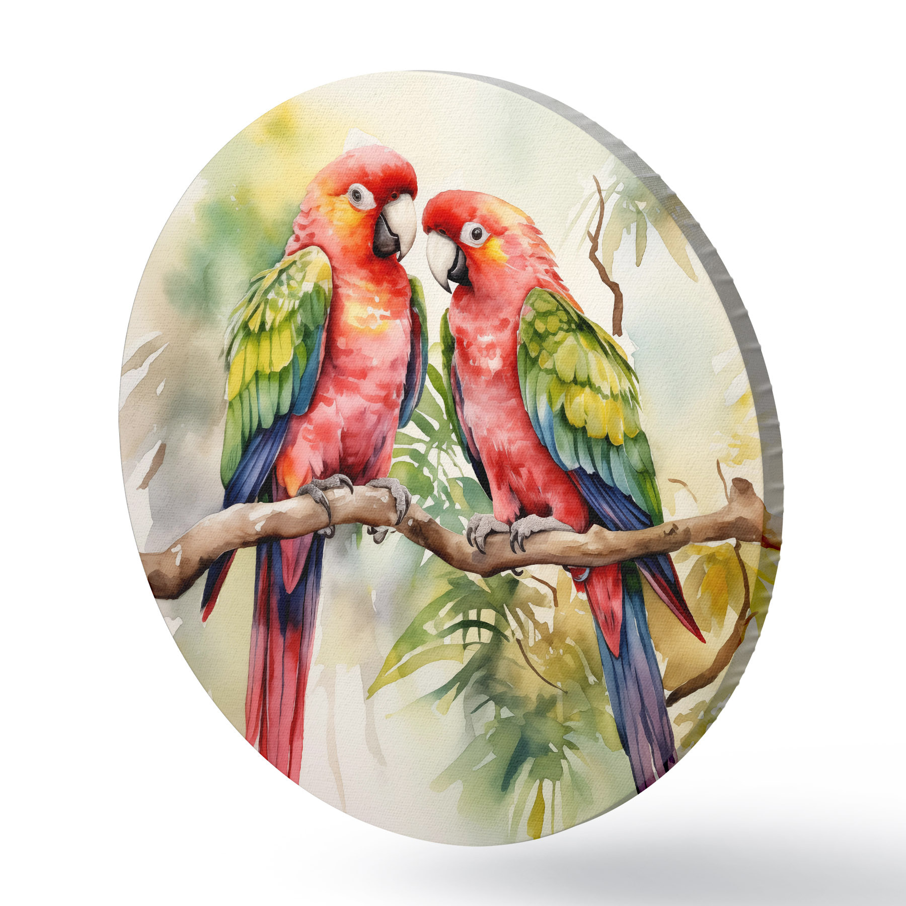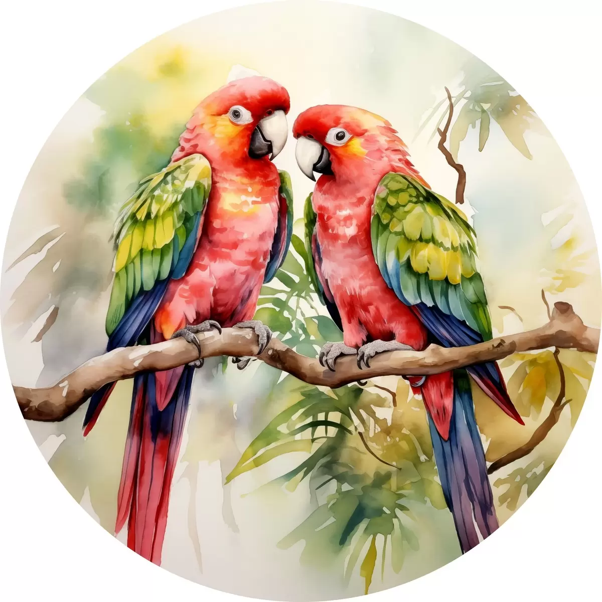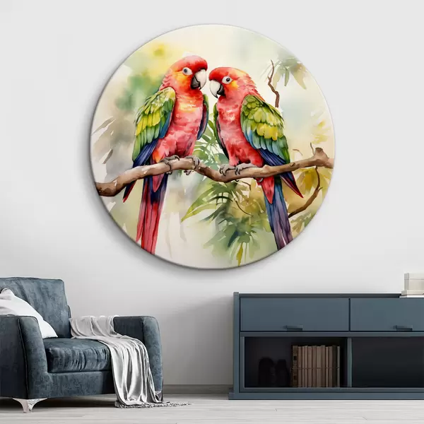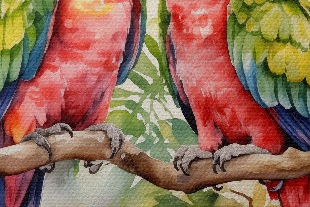 Nuotrauka Dvi ryškios aros papūgos, sėdinčios ant vienos šakos, akvarelė Nr r39333