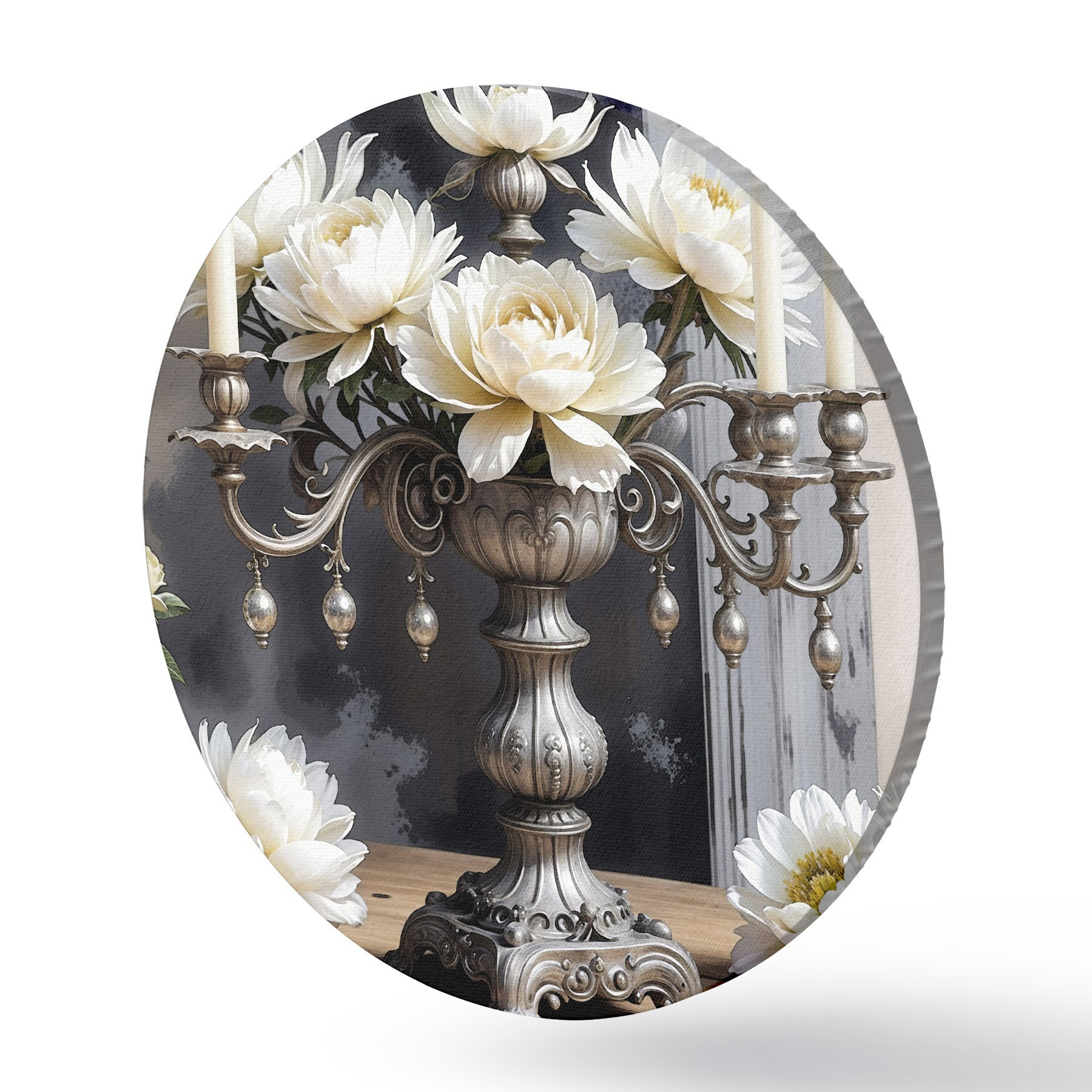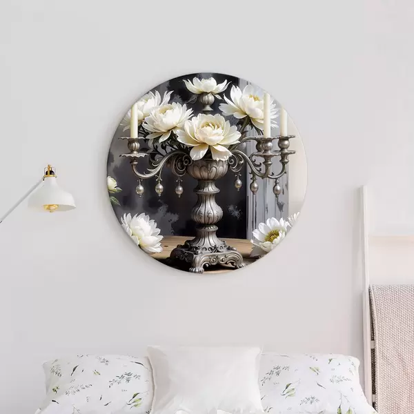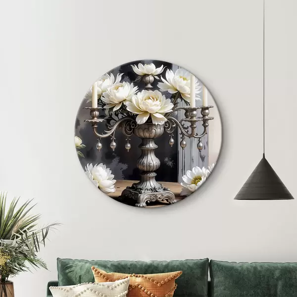 Nuotrauka Didelių baltų jurginų gėlių puokštė puošnioje sidabrinėje vazoje, apsupta uždegtų žvakių ant medinio stalo Nr r39384