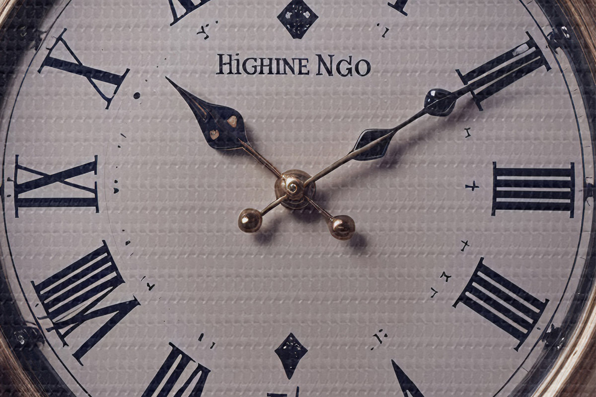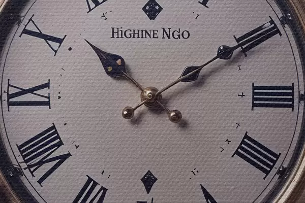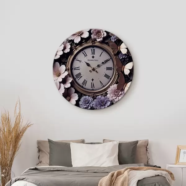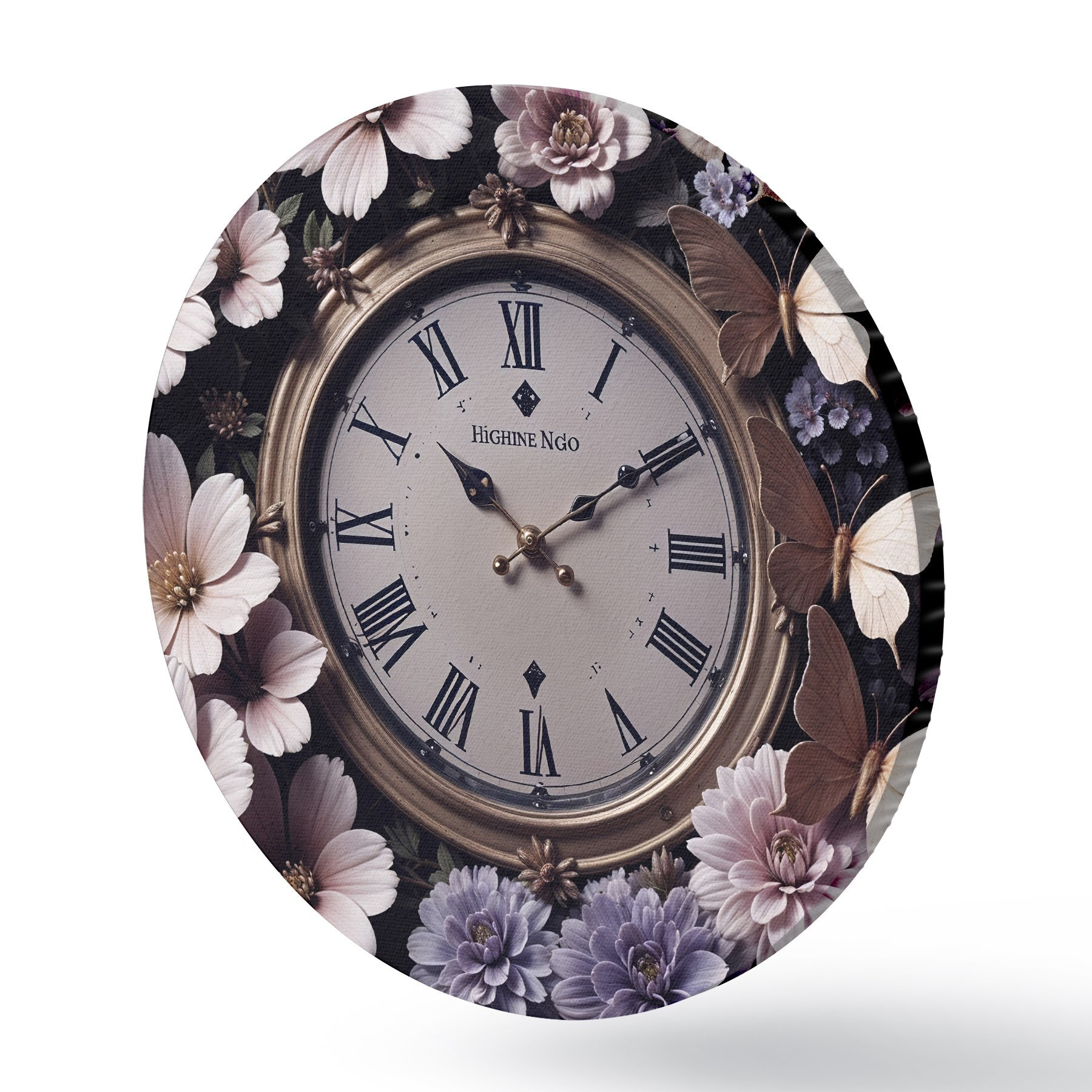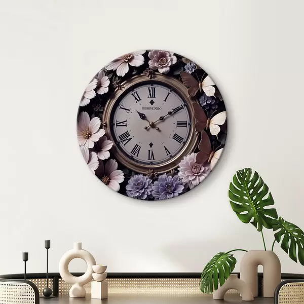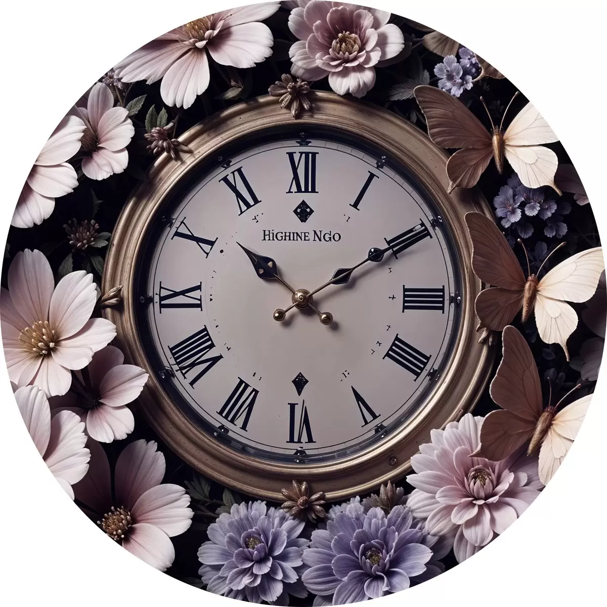 Nuotrauka Antikvarinis laikrodis, apsuptas gražių violetinių ir rausvų gėlių tamsiame fone Nr r39386