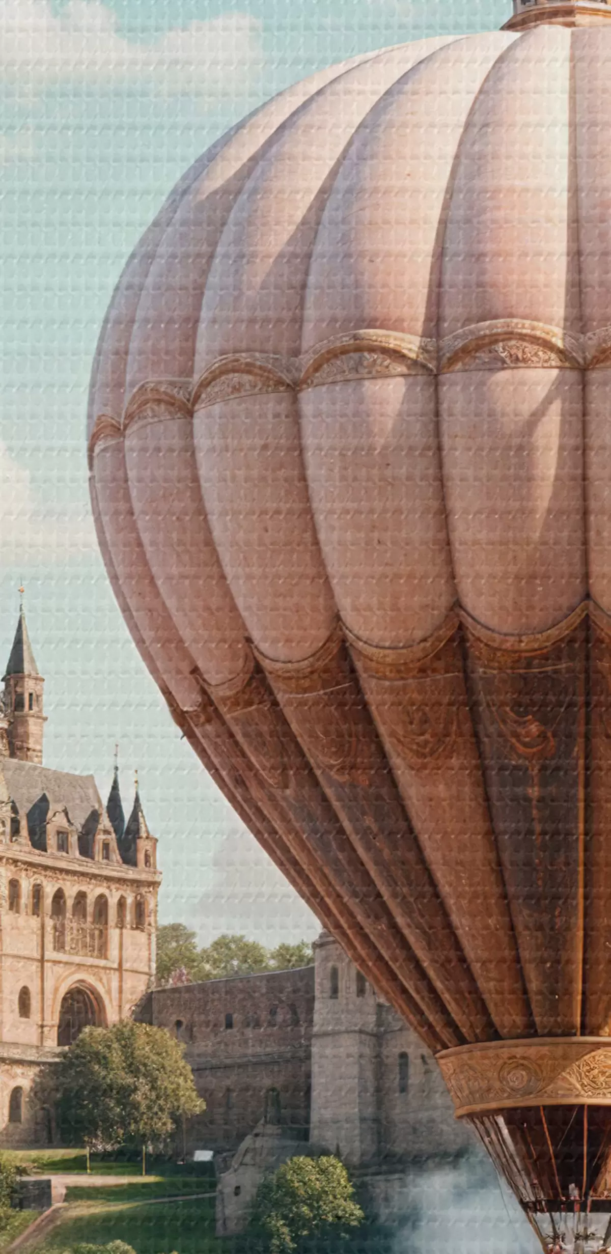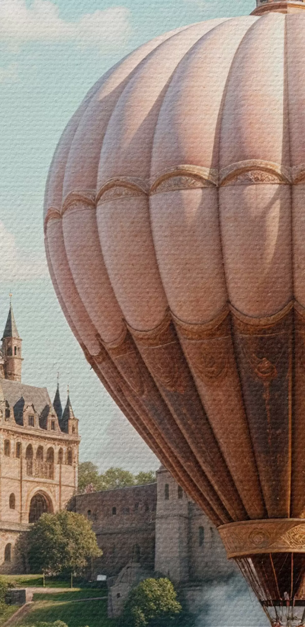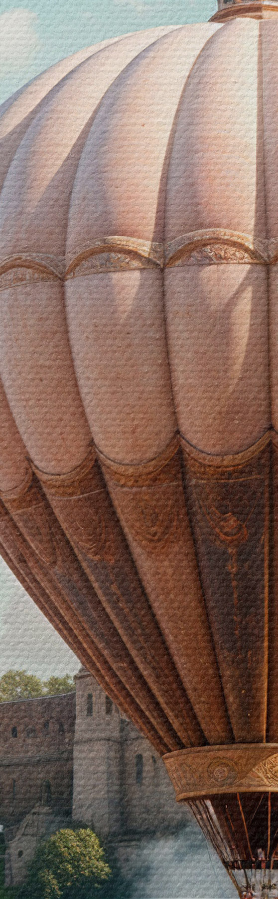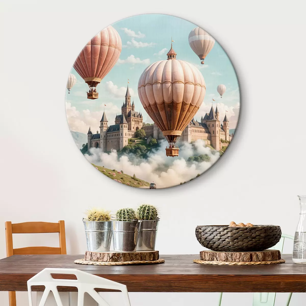 Nuotrauka Fantazijos pilis apsupta rožinių oro balionų, plūduriuojančių debesuotame danguje virš vešlaus, žalio kraštovaizdžio Nr r39387