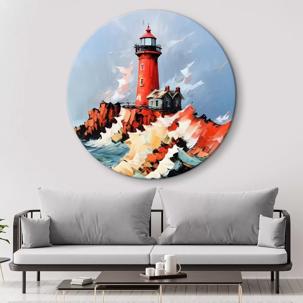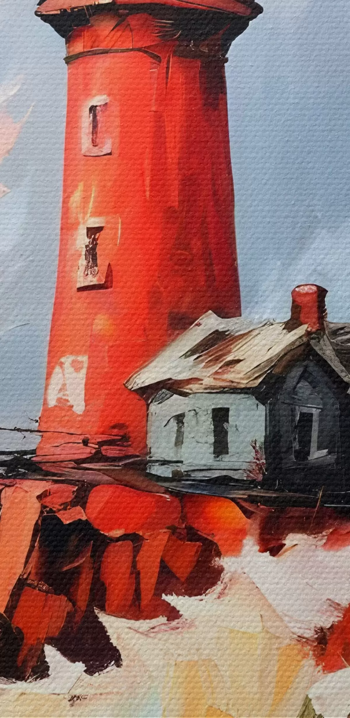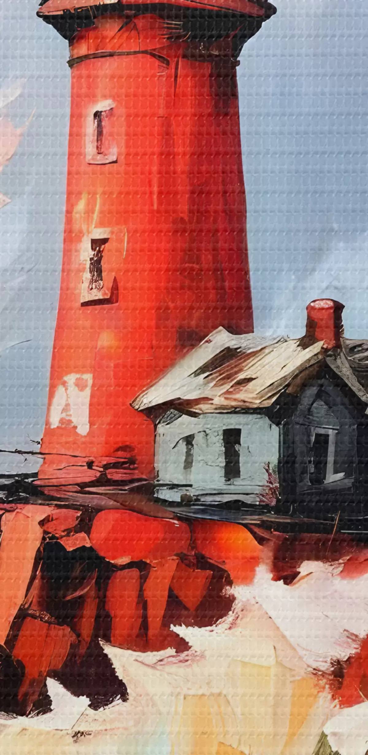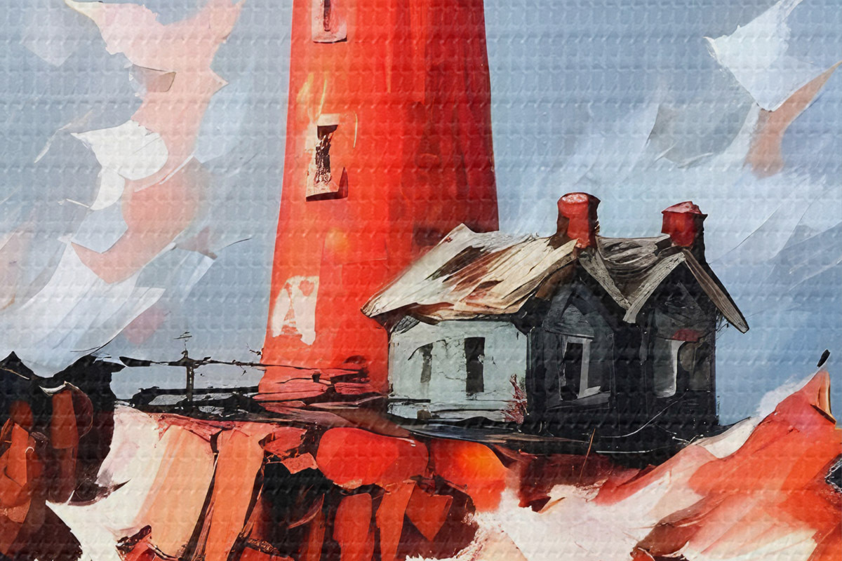 Nuotrauka Paveikslas su raudonu švyturiu, stovinčiu aukštai ant uolėtos uolos, apsuptas daužančių bangų ir audringo dangaus Nr r39392