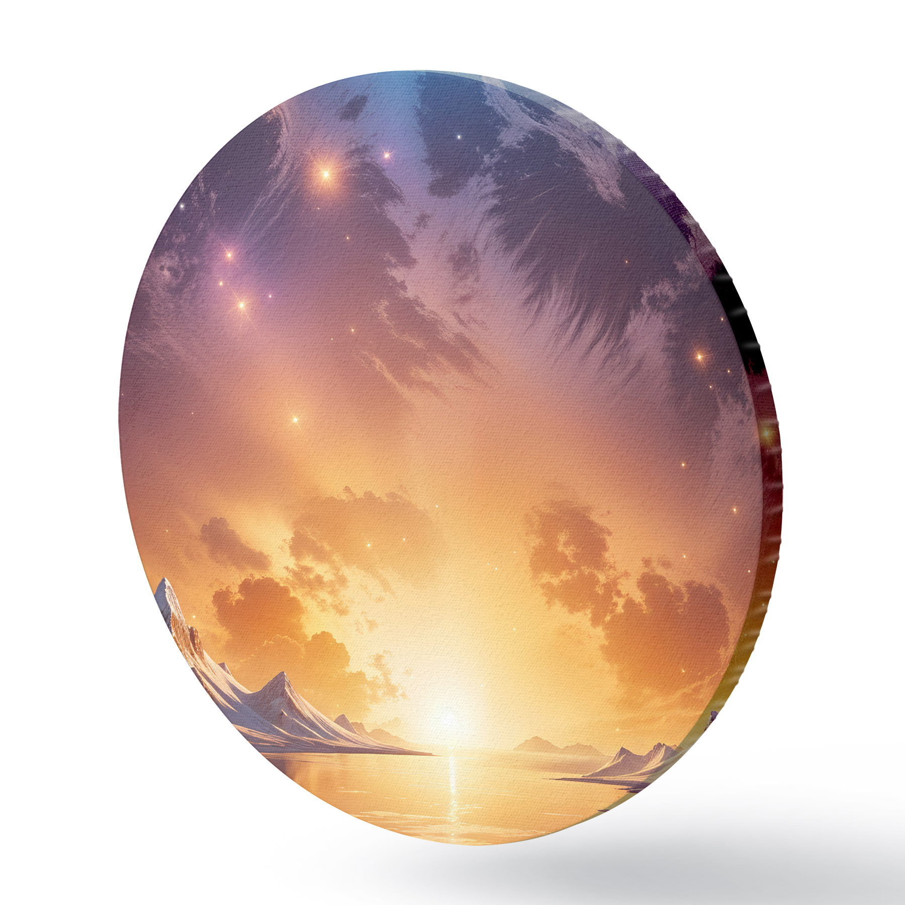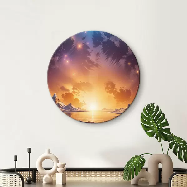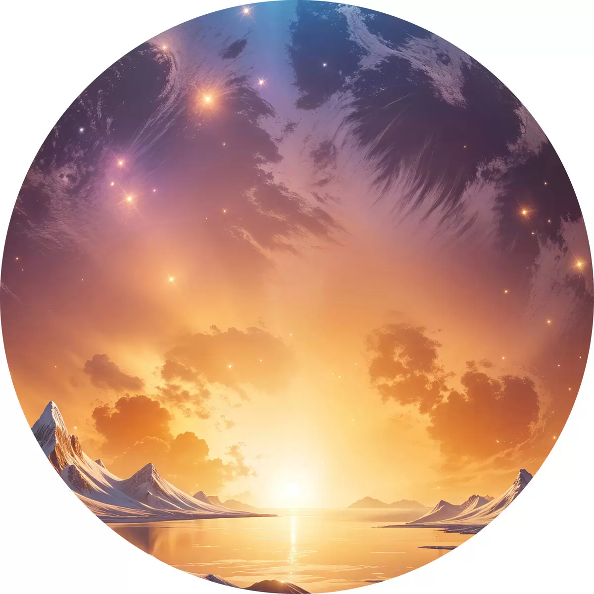 Nuotrauka Fantastinis peizažas su didele žėrinčia planeta danguje, apsuptas kalnų ir ramaus ežero Nr r39402