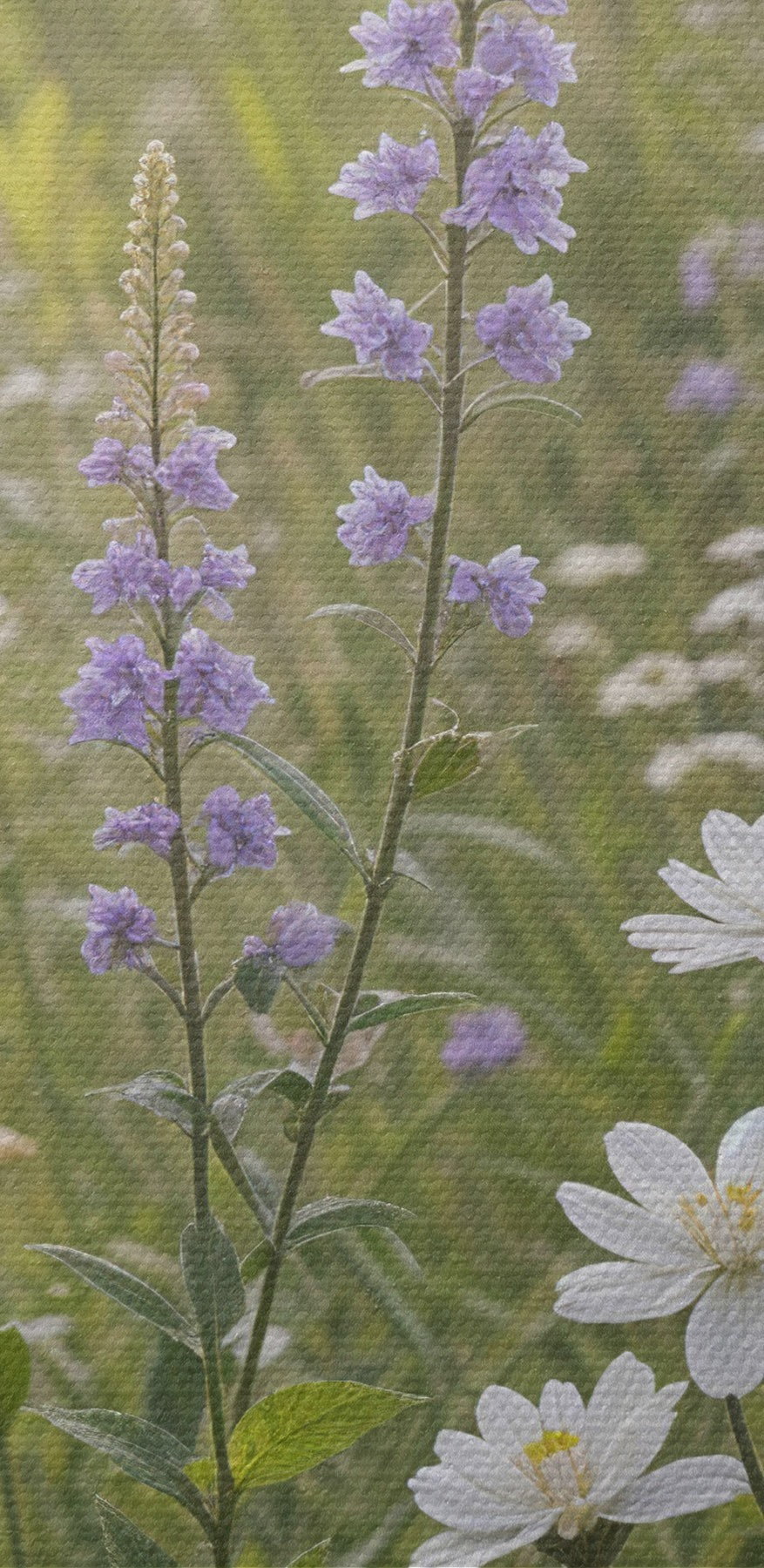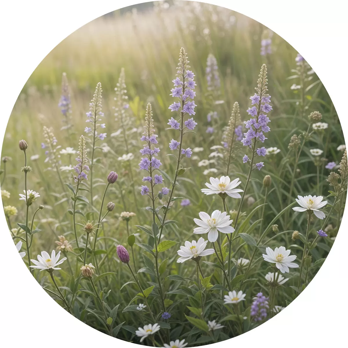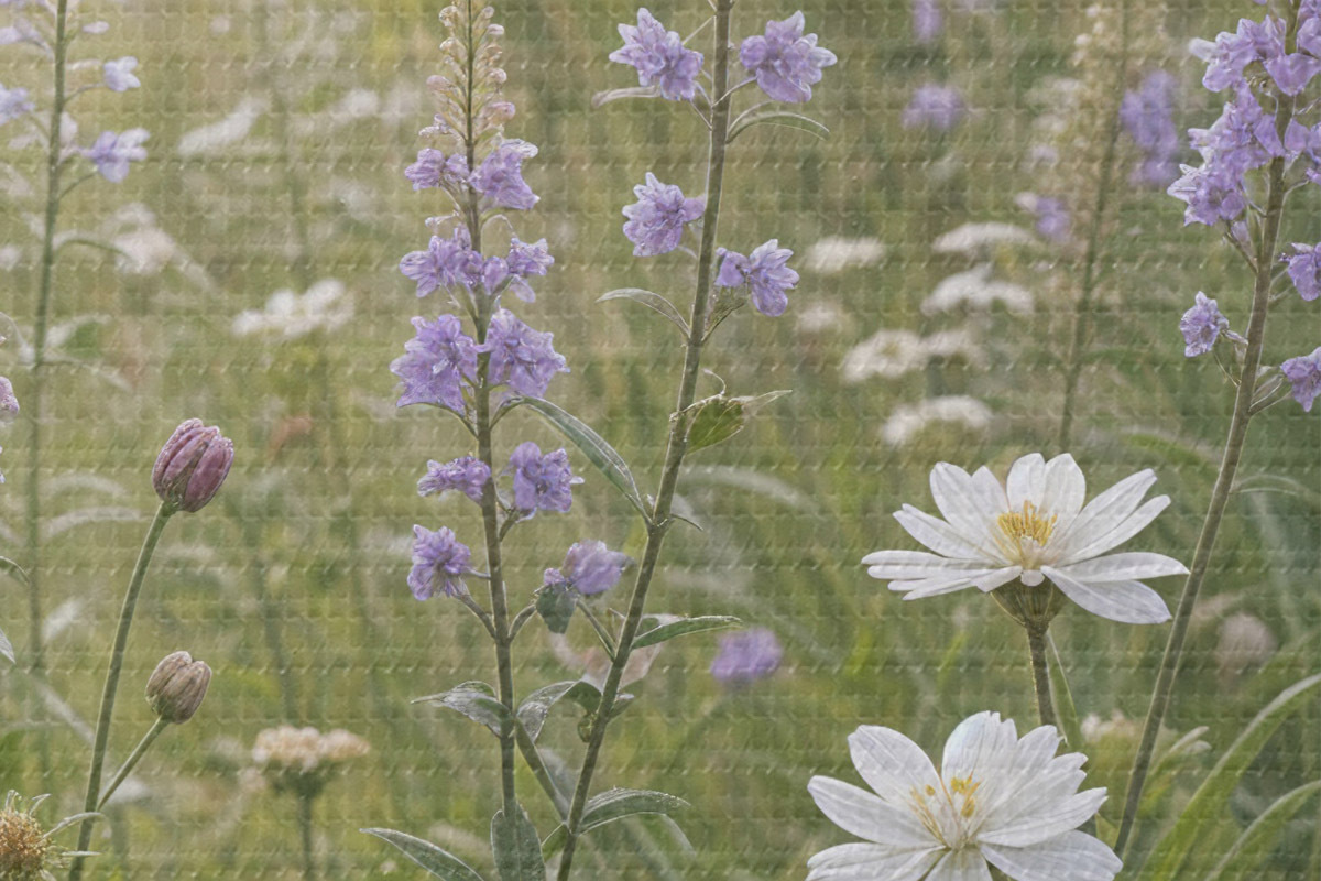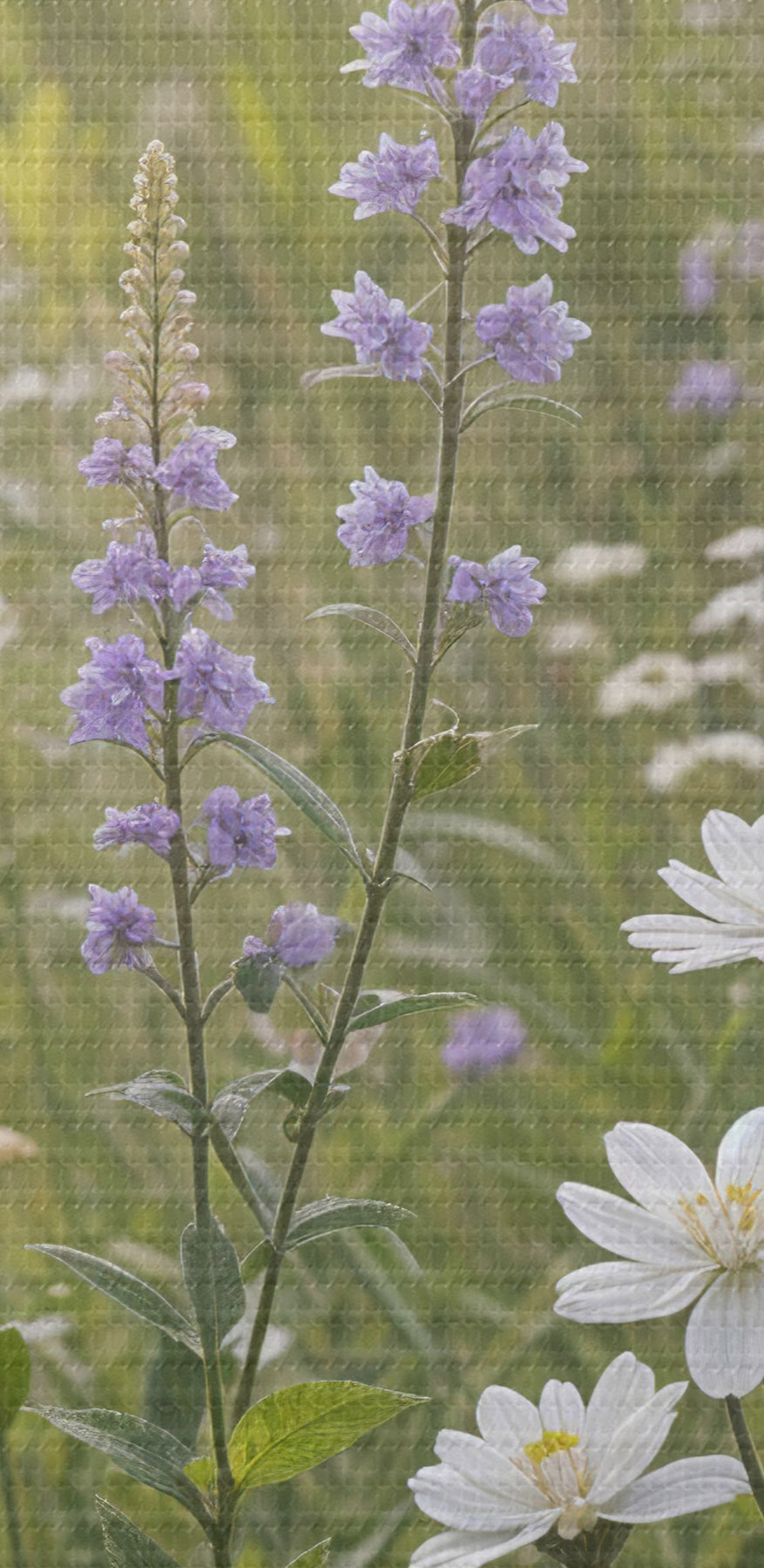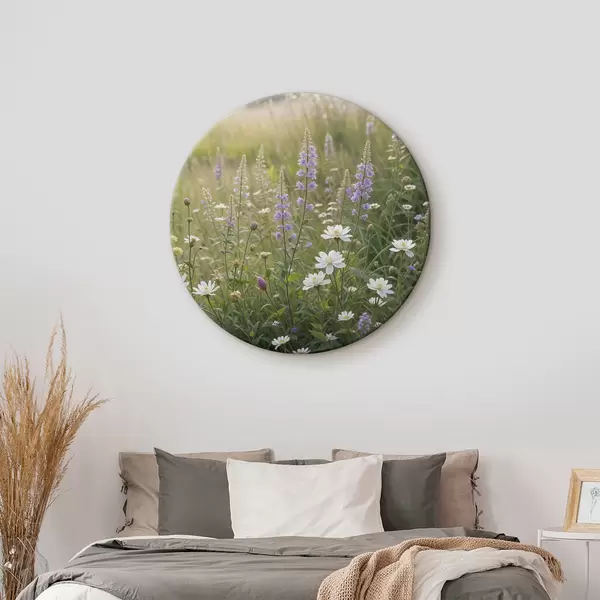 Nuotrauka Baltų ramunėlių ir violetinių lubinų laukas su aukšta žole fone Nr r39404