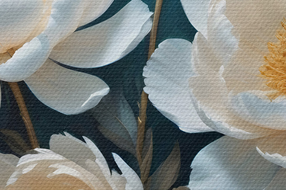 Nuotrauka Baltos bijūnų gėlės su centrais tamsiai arbatinės spalvos fone Nr r39405