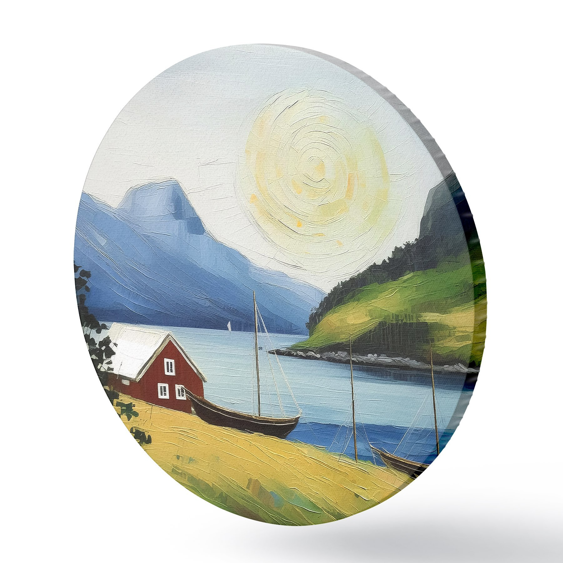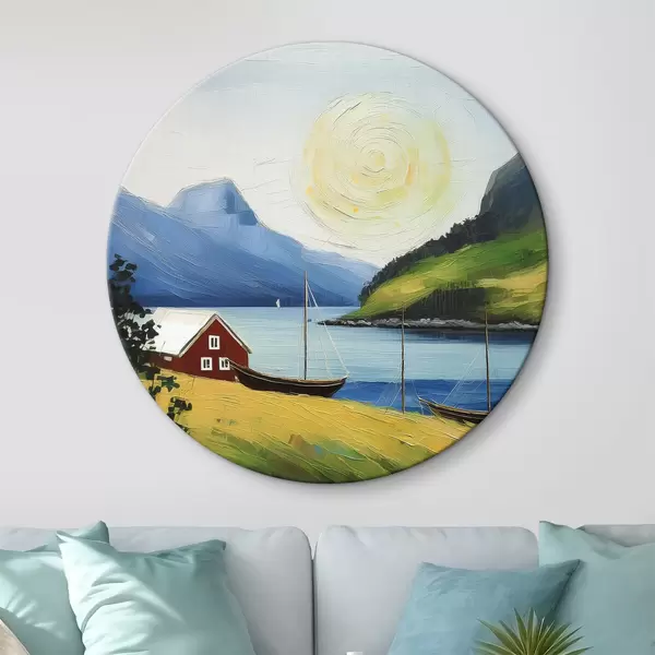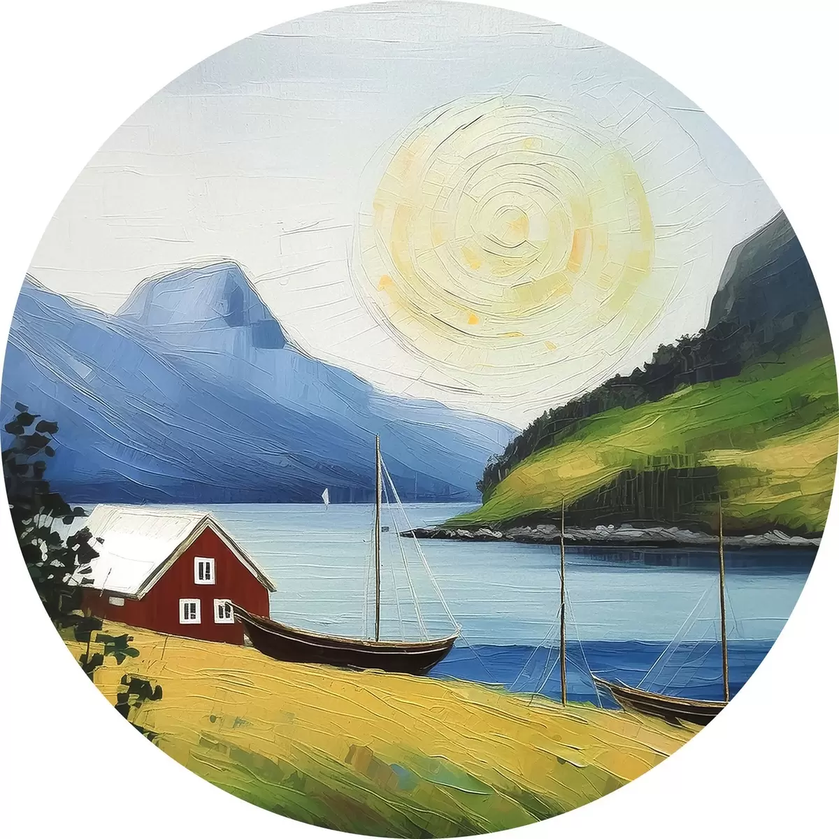 Nuotrauka Šiaurės šalių vasara, namelis ant jūros kranto, saulė mėlyname danguje, kalnai Nr r39423
