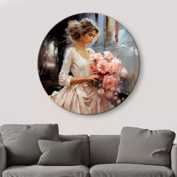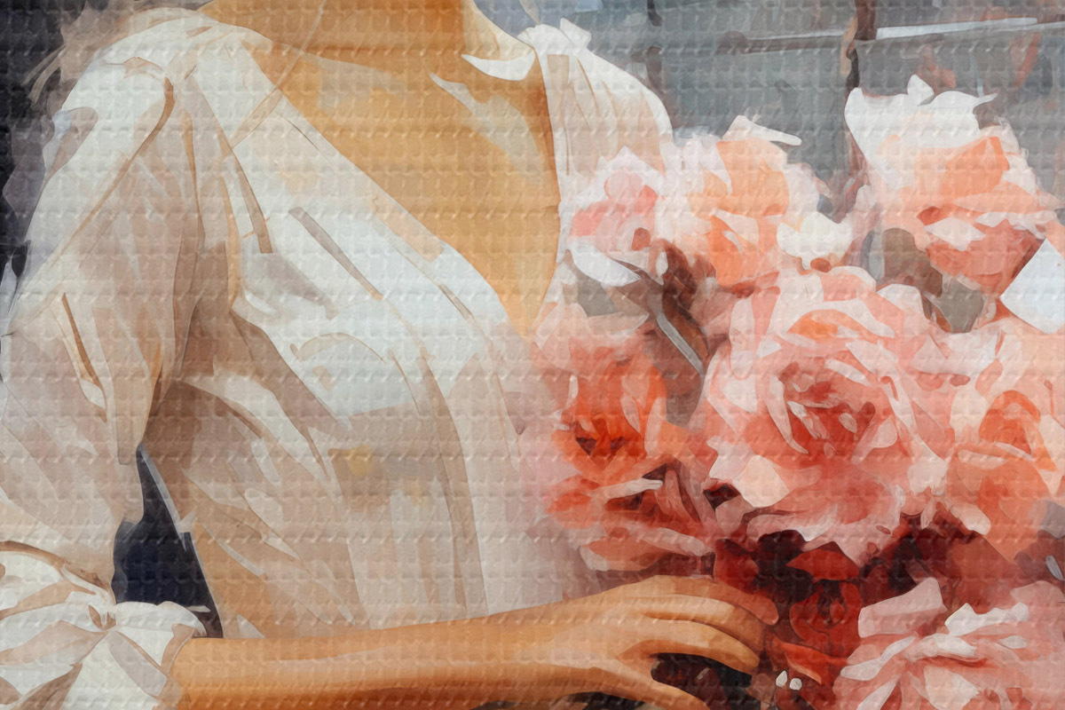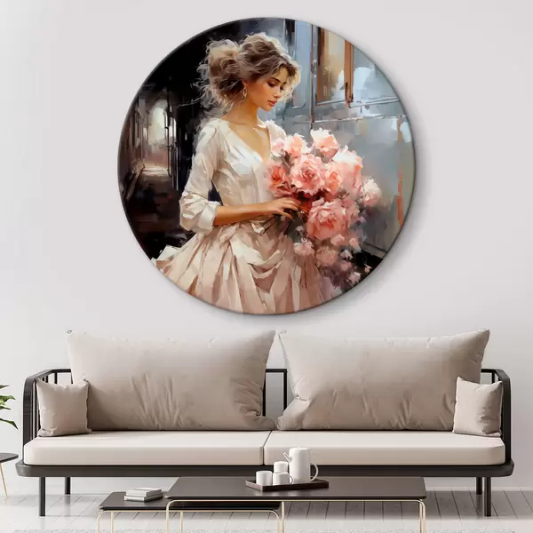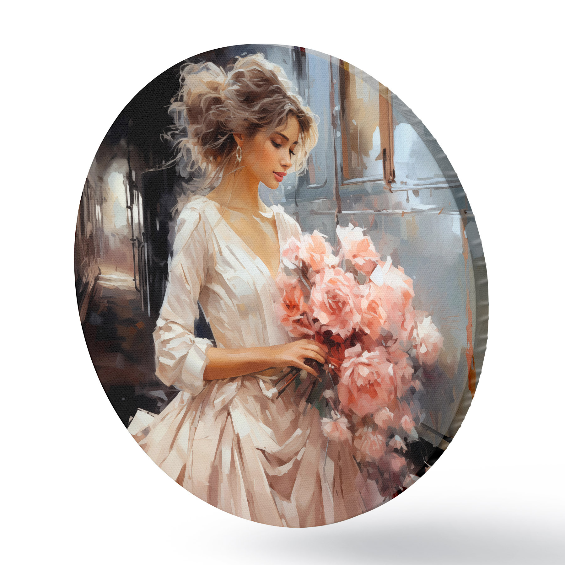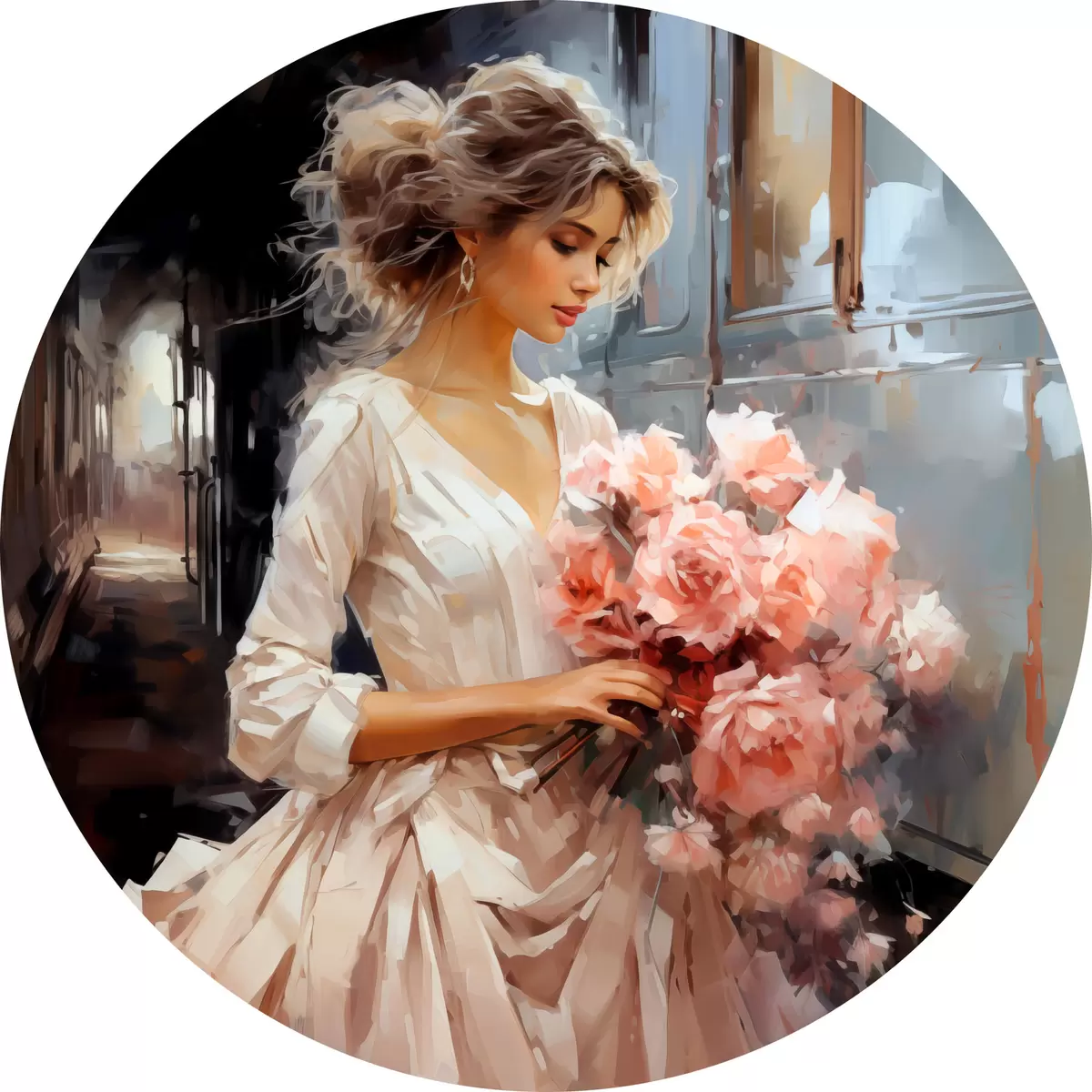 Nuotrauka Mergina balta suknele stotyje laiko rožinių rožių puokštę rankose aliejiniais dažais Nr r39438