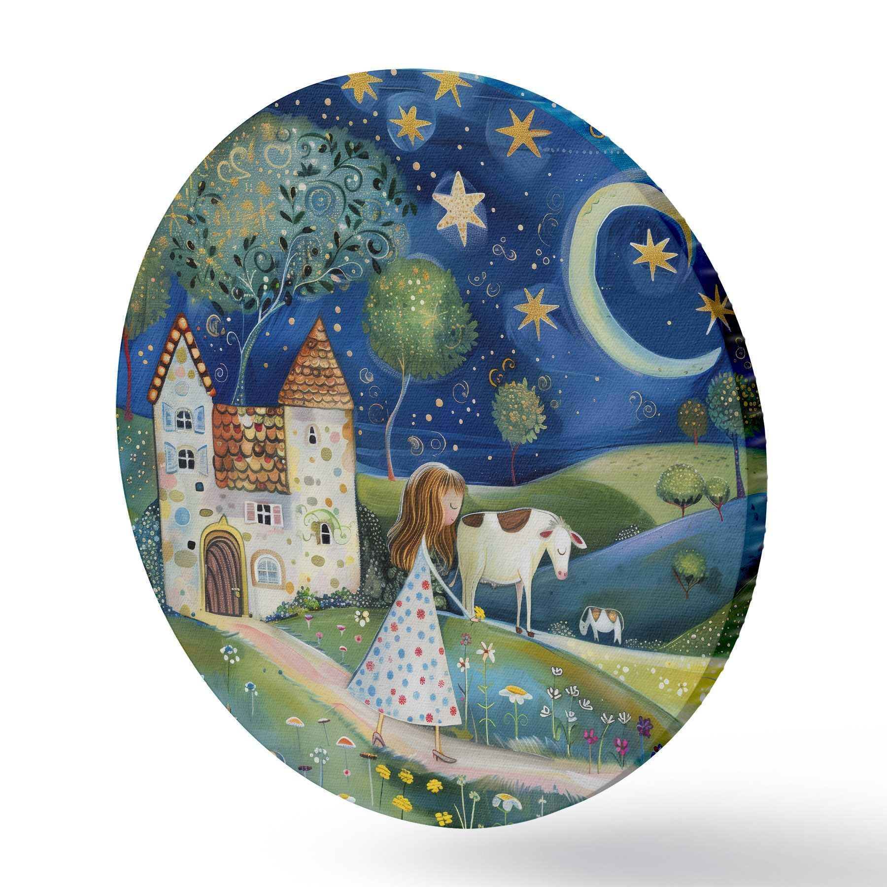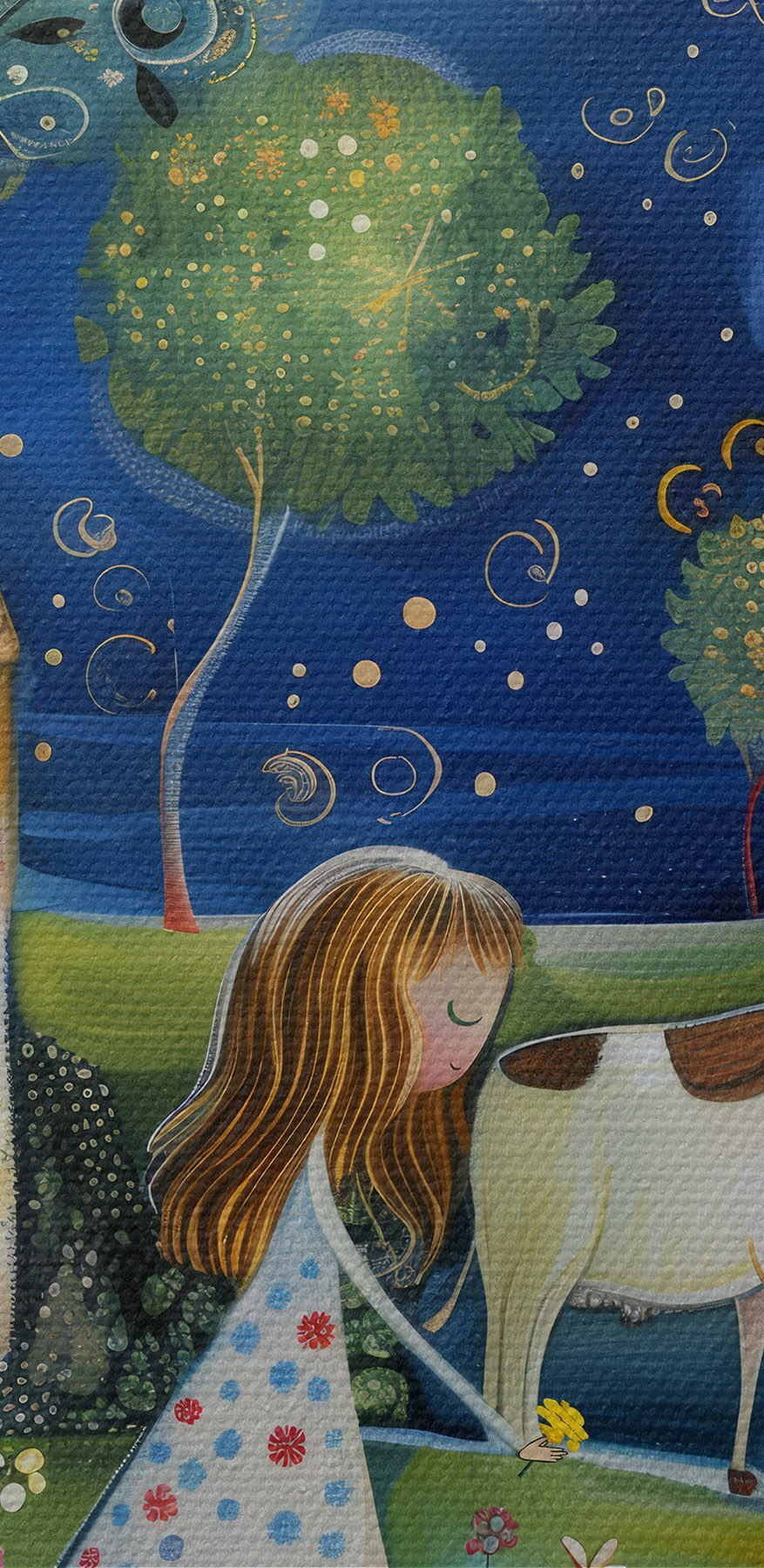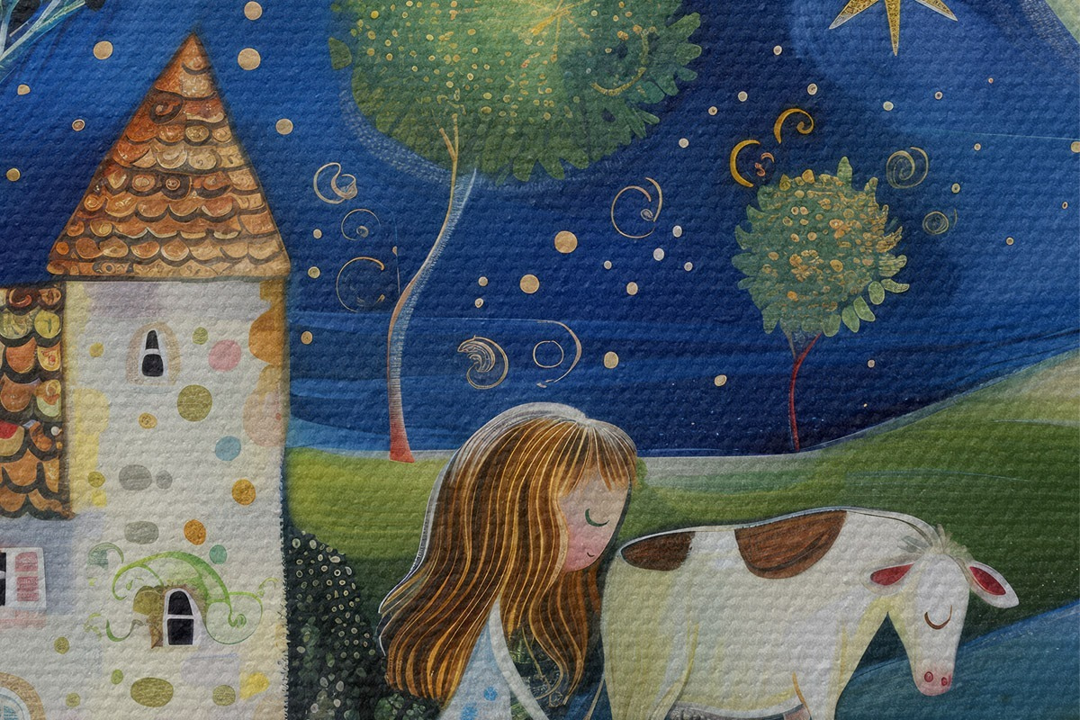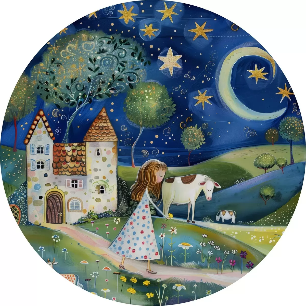Nuotrauka Maža princesė, šuo, karvė ir fantazijos namas po žvaigždėmis įnoringu naivaus meno stiliumi Nr r39451