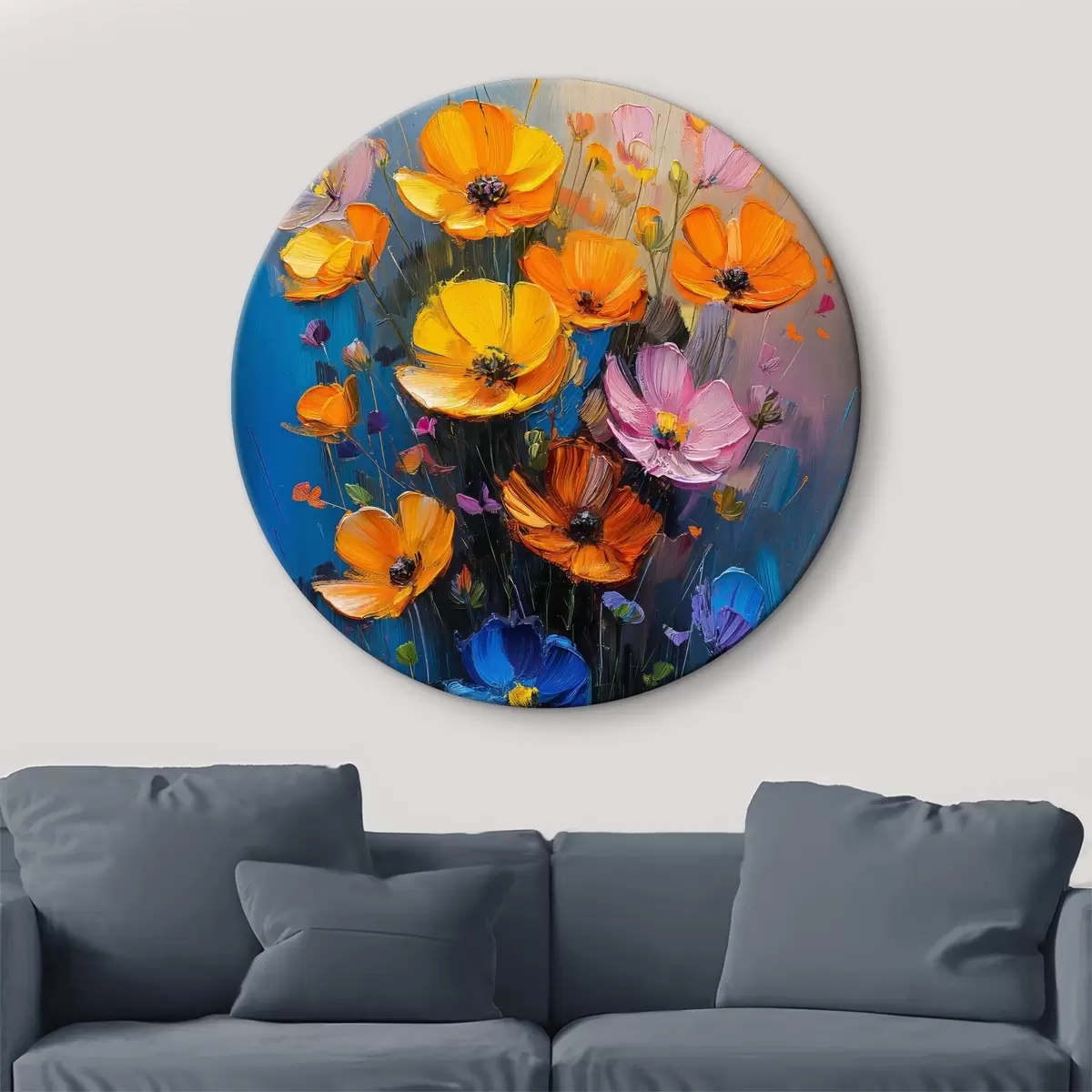 Nuotrauka Tapybos simfonija: šviesiai geltonos, oranžinės, rožinės ir mėlynos spalvos aguonų potėpiai Nr r39454