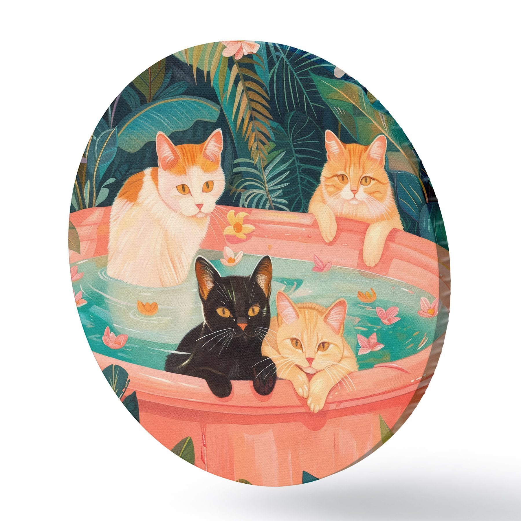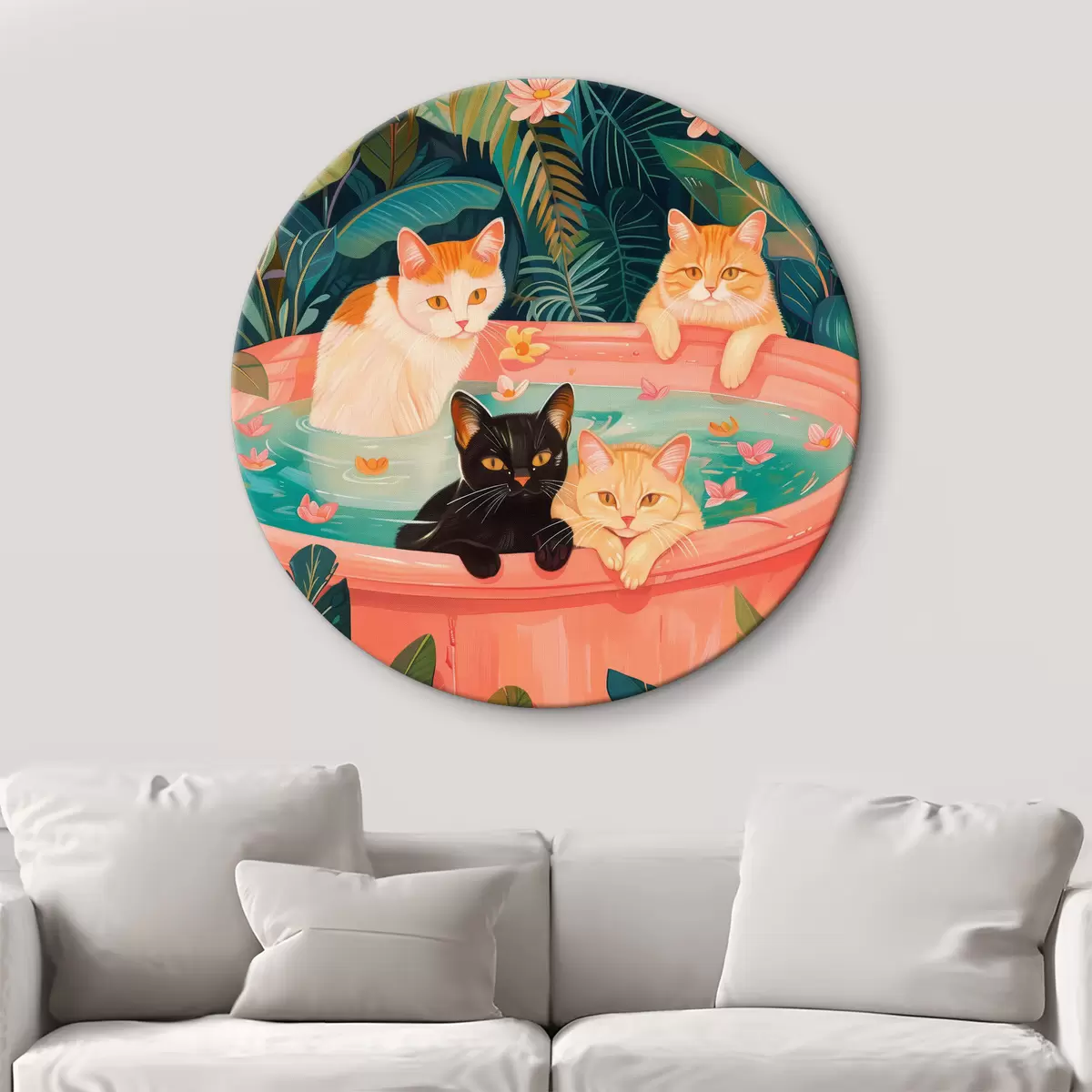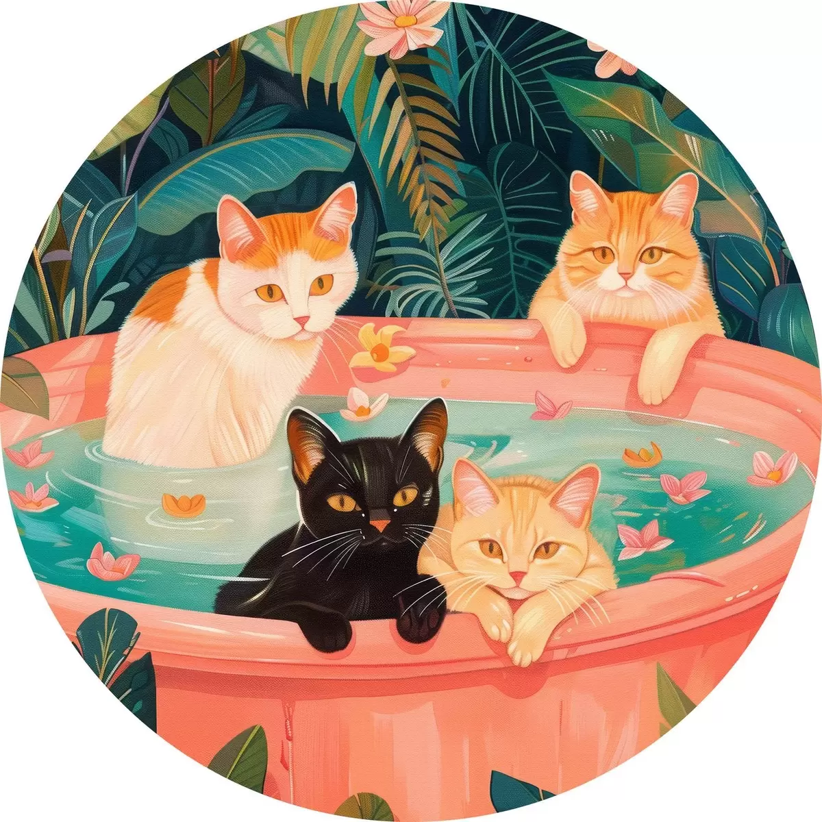 Nuotrauka Katės rožinėje vonioje su žaliais lapais, džiunglių atmosfera Nr r39465