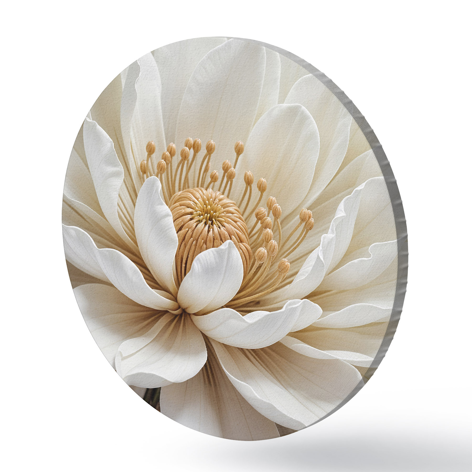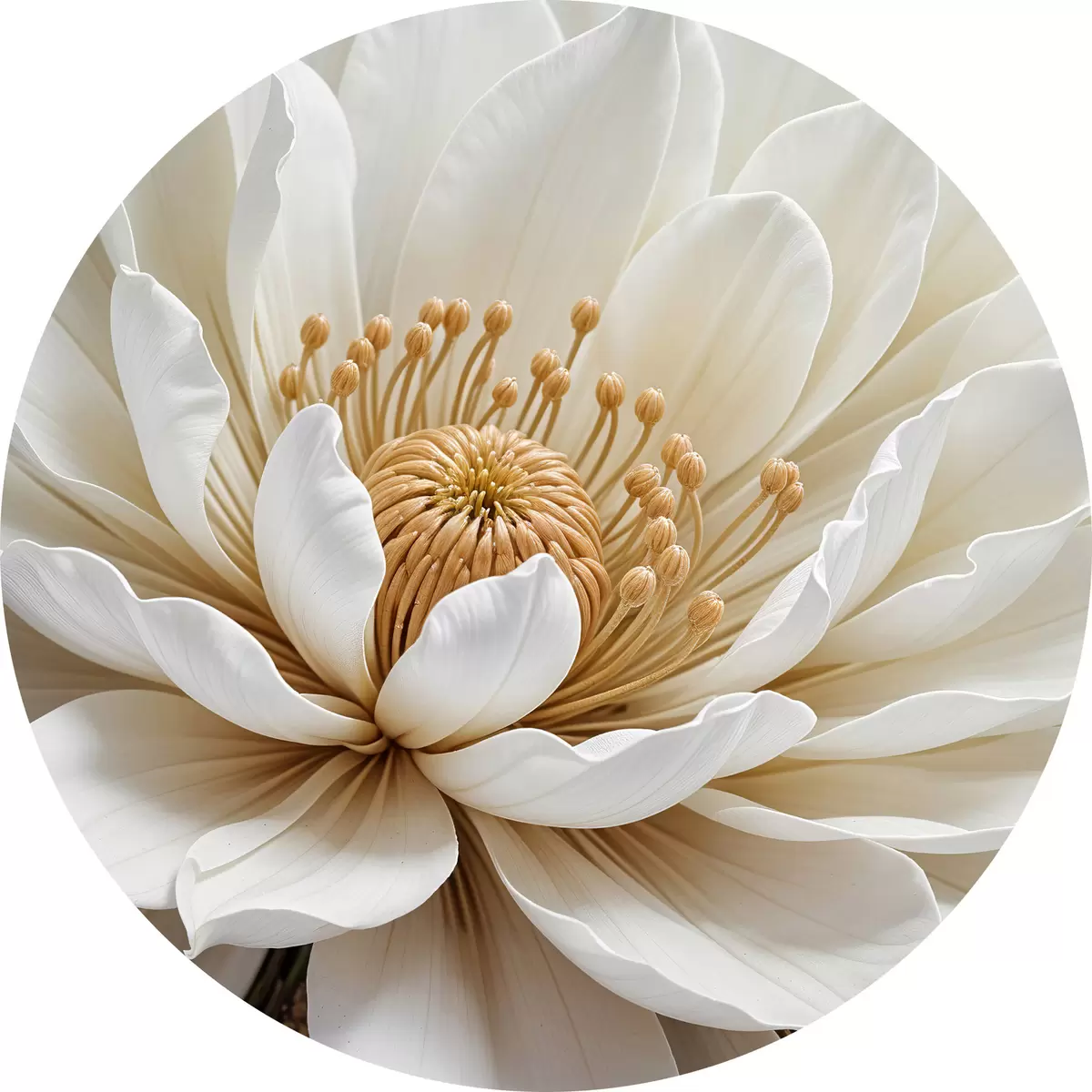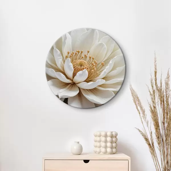 Apvalūs paveikslai Didelės, baltos jurginų gėlės su švelniais žiedlapiais ir ryškiu geltonu centru stambiu planu r39508
