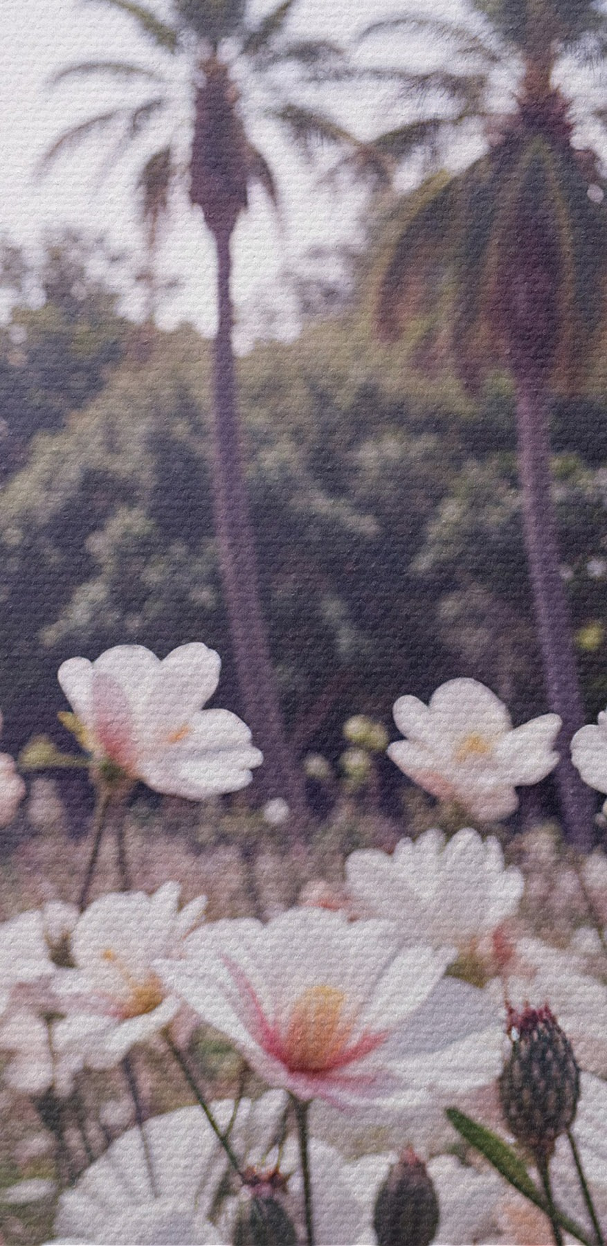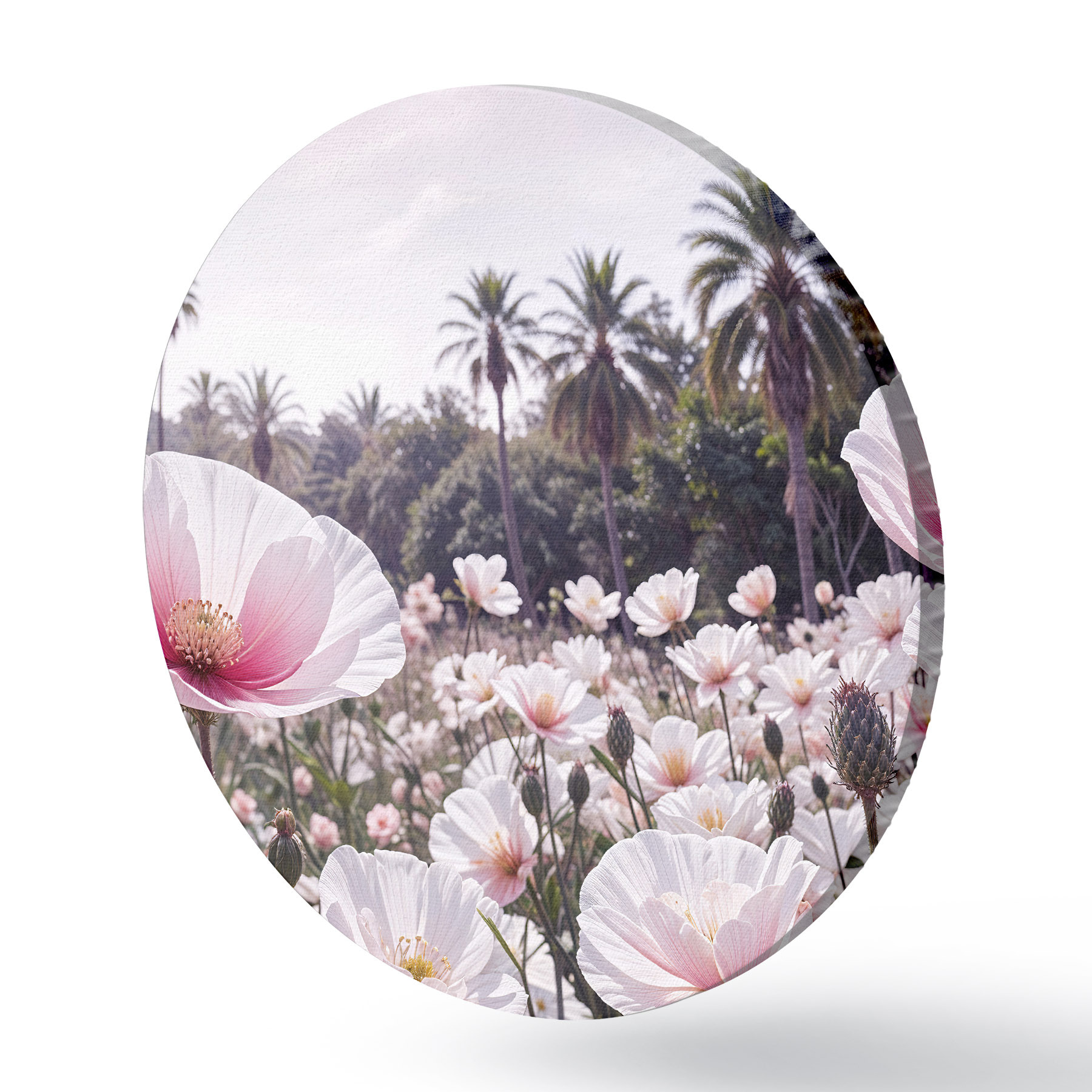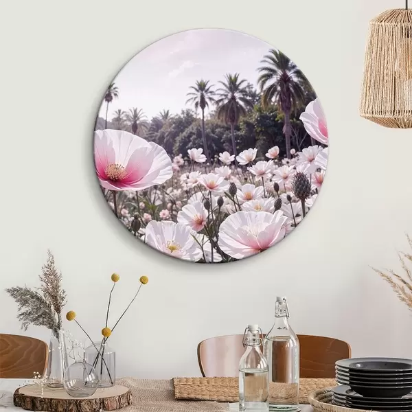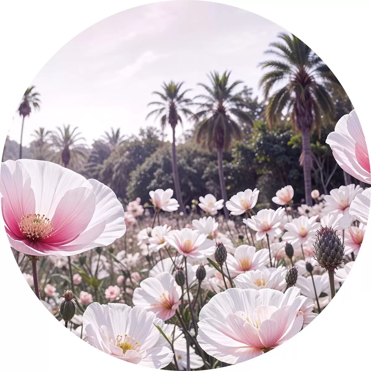 Nuotrauka Rožinių ir baltų gėlių laukas su palmėmis fone Nr r39509