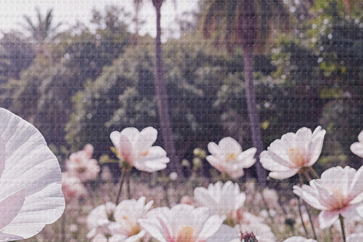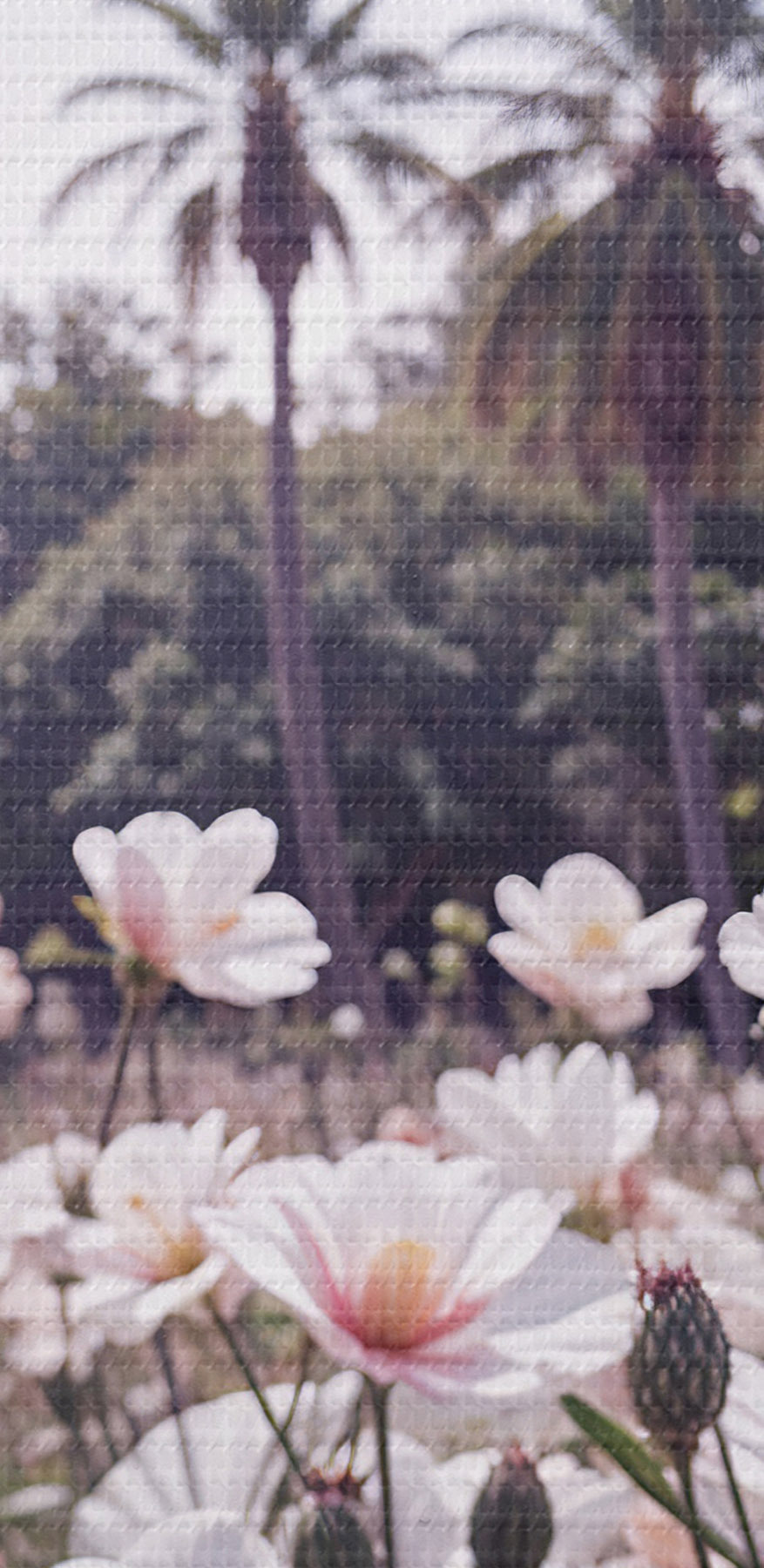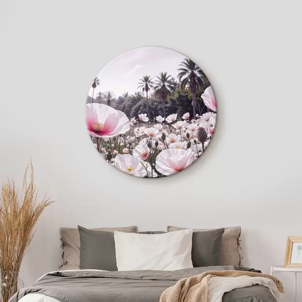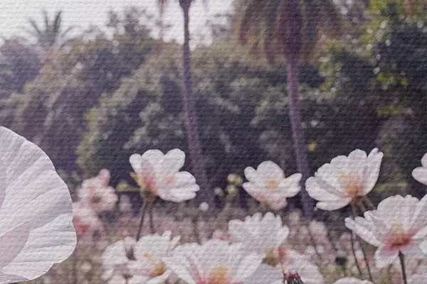 Nuotrauka Rožinių ir baltų gėlių laukas su palmėmis fone Nr r39509
