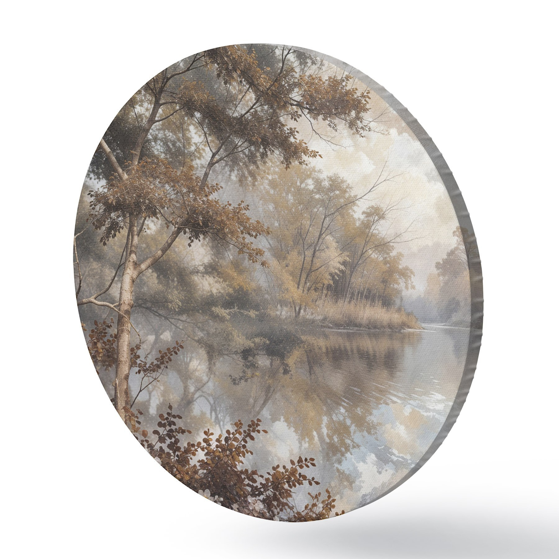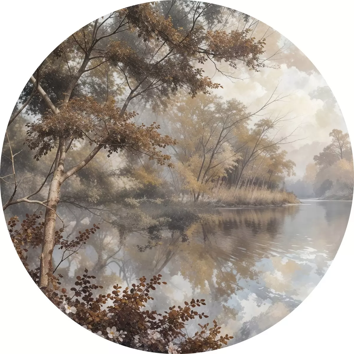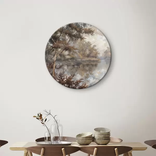 Nuotrauka Rudens kraštovaizdis su ramiu ežeru, apsuptu medžių su ryškia oranžine ir geltona lapija Nr r39511