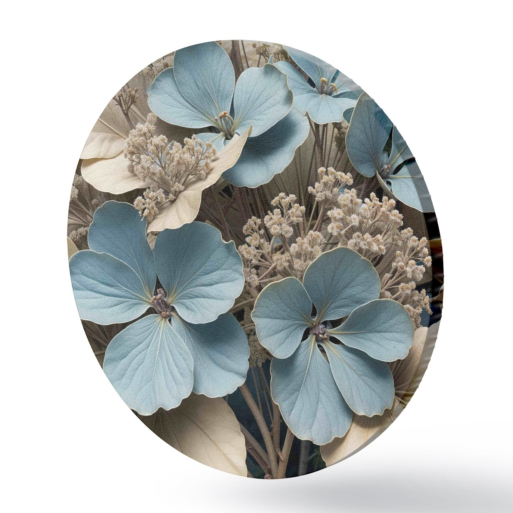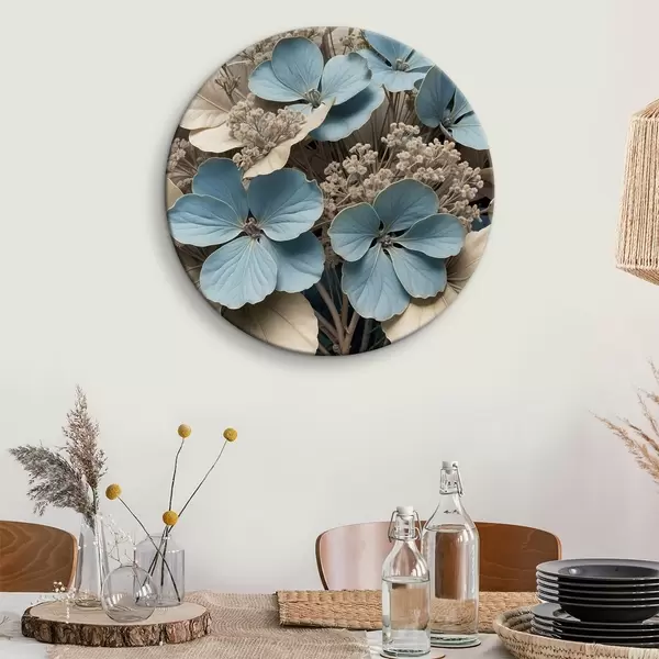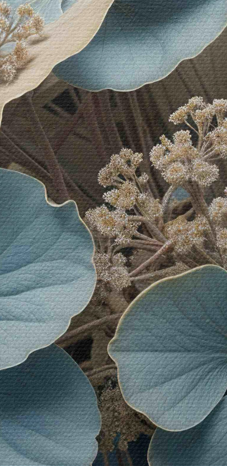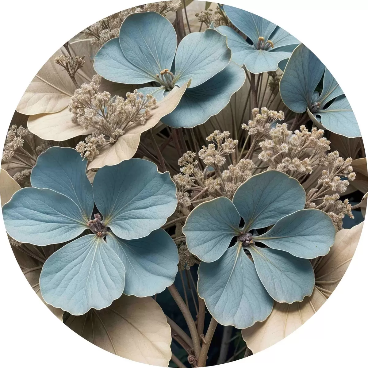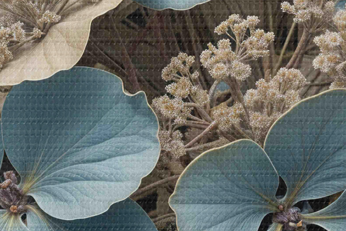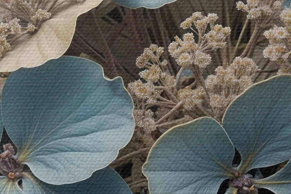 Nuotrauka Mėlynų ir baltų gėlių su minkštais, neryškiais žiedlapiais rudame fone stambiu planu Nr r39517