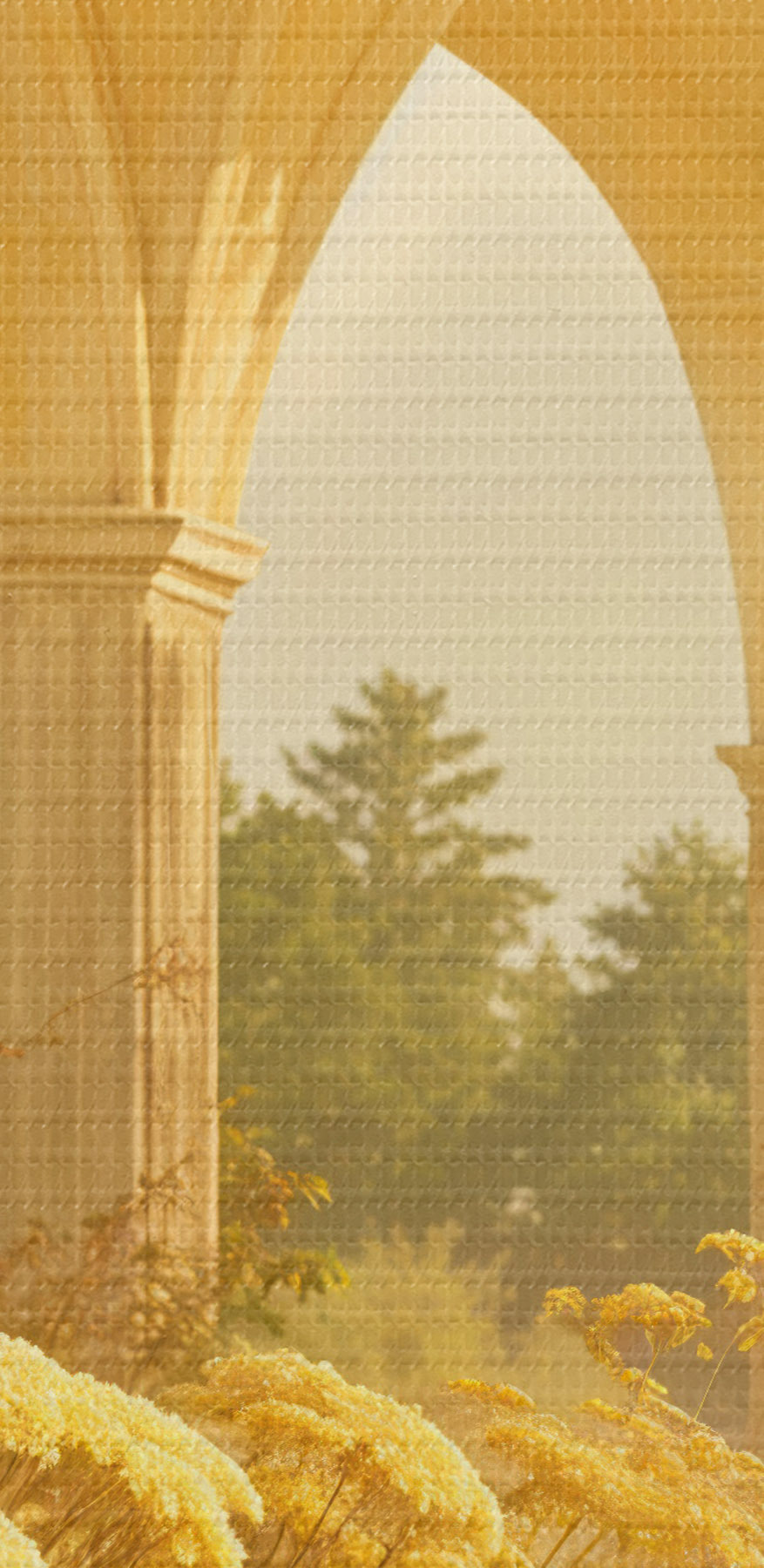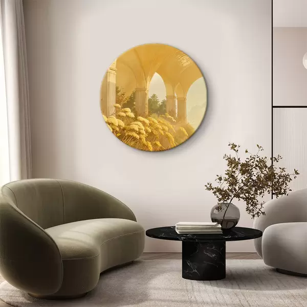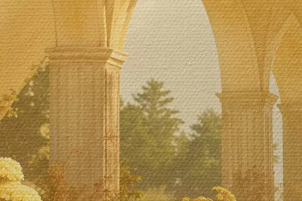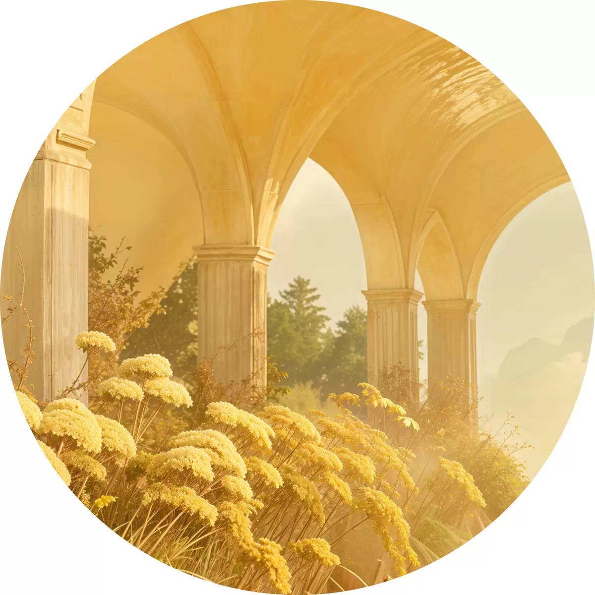 Nuotrauka Akmeninė arka su geltonomis gėlėmis pirmame plane, iš kurios atsiveria vaizdas į vaizdingą kraštovaizdį tolumoje Nr r39521