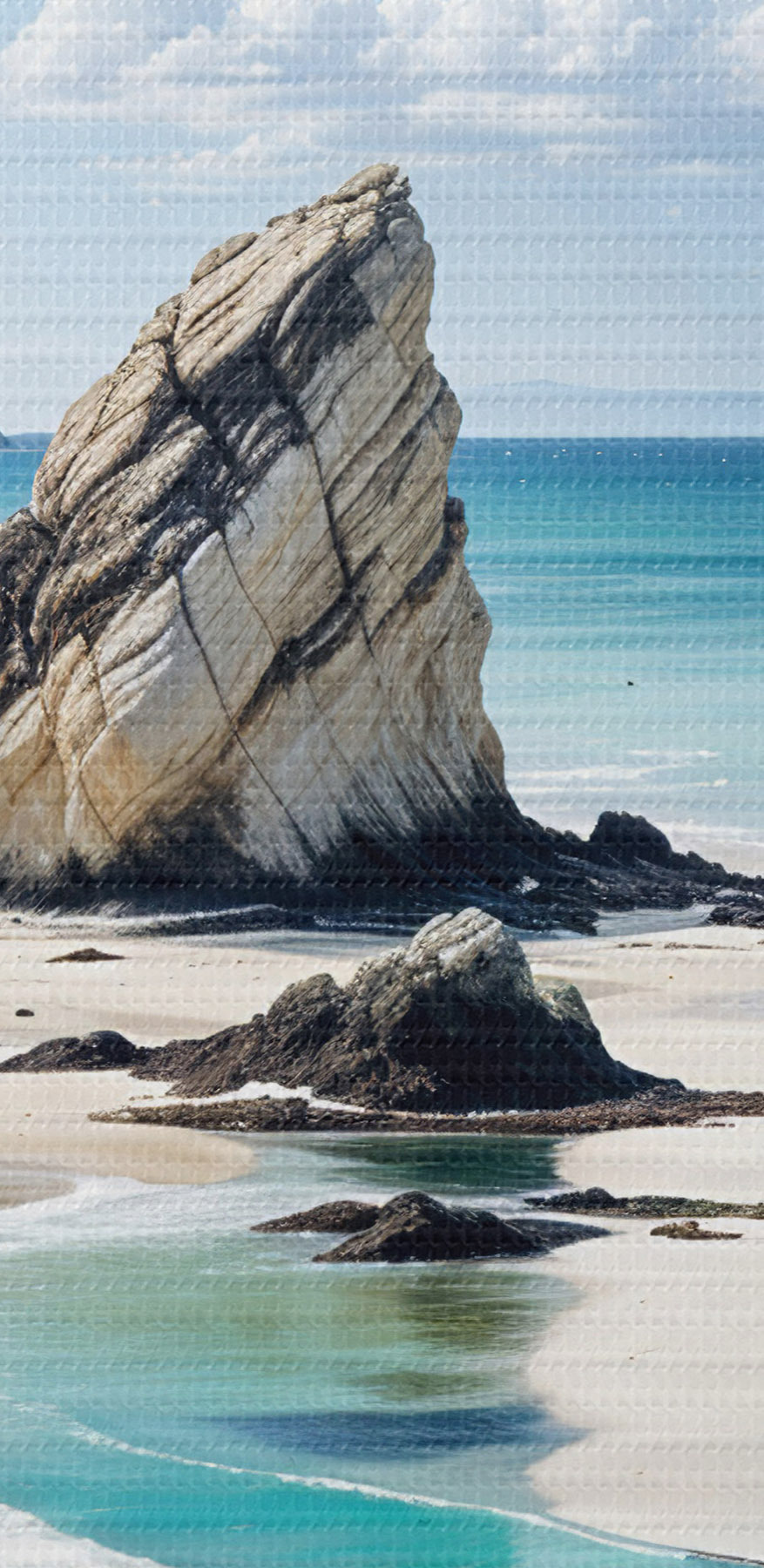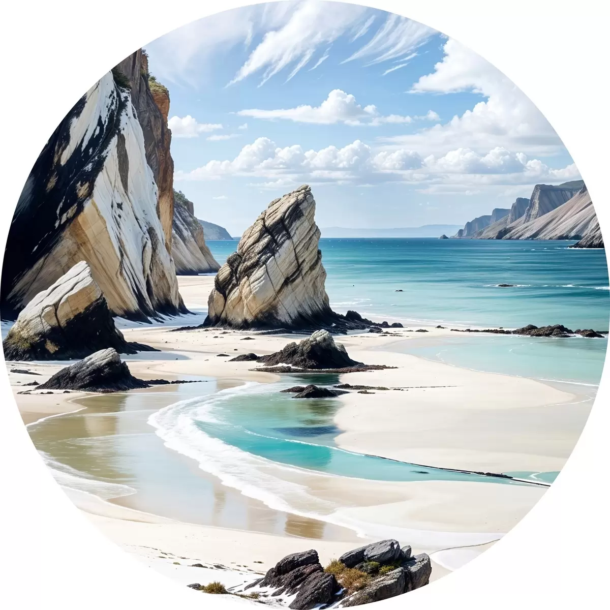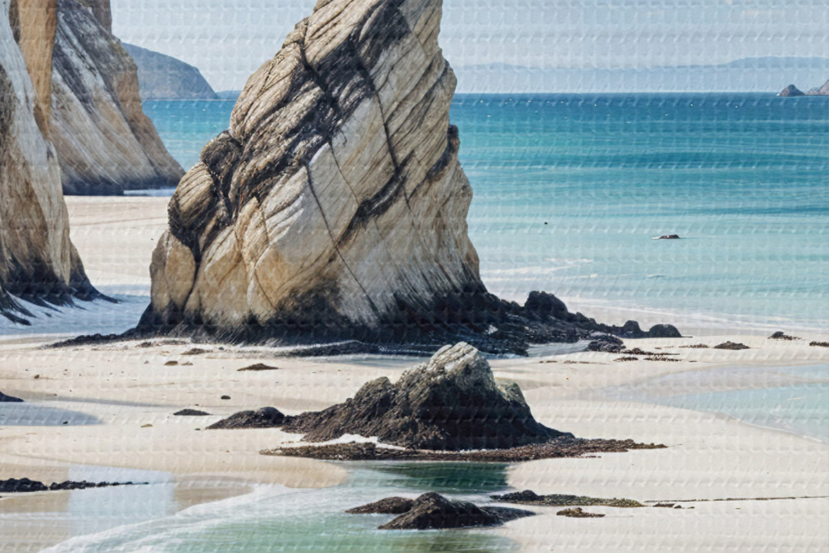 Nuotrauka Tropinis paplūdimys su turkio spalvos vandeniu, baltu smėliu ir didelėmis uolėtomis uolomis Nr r39524