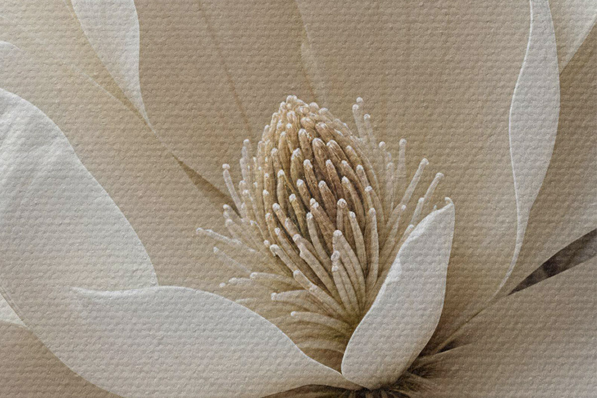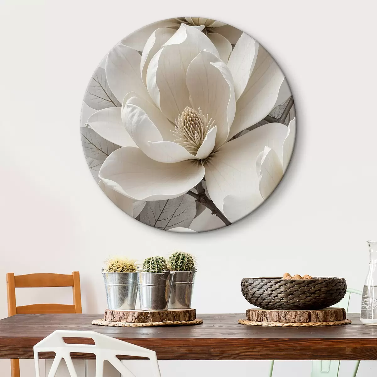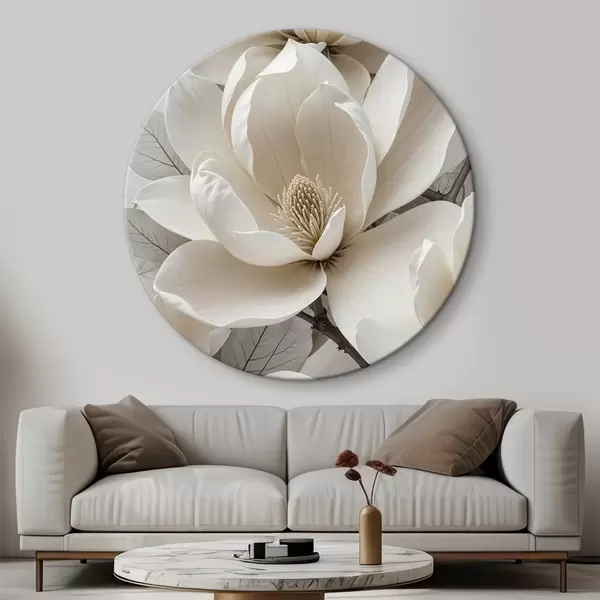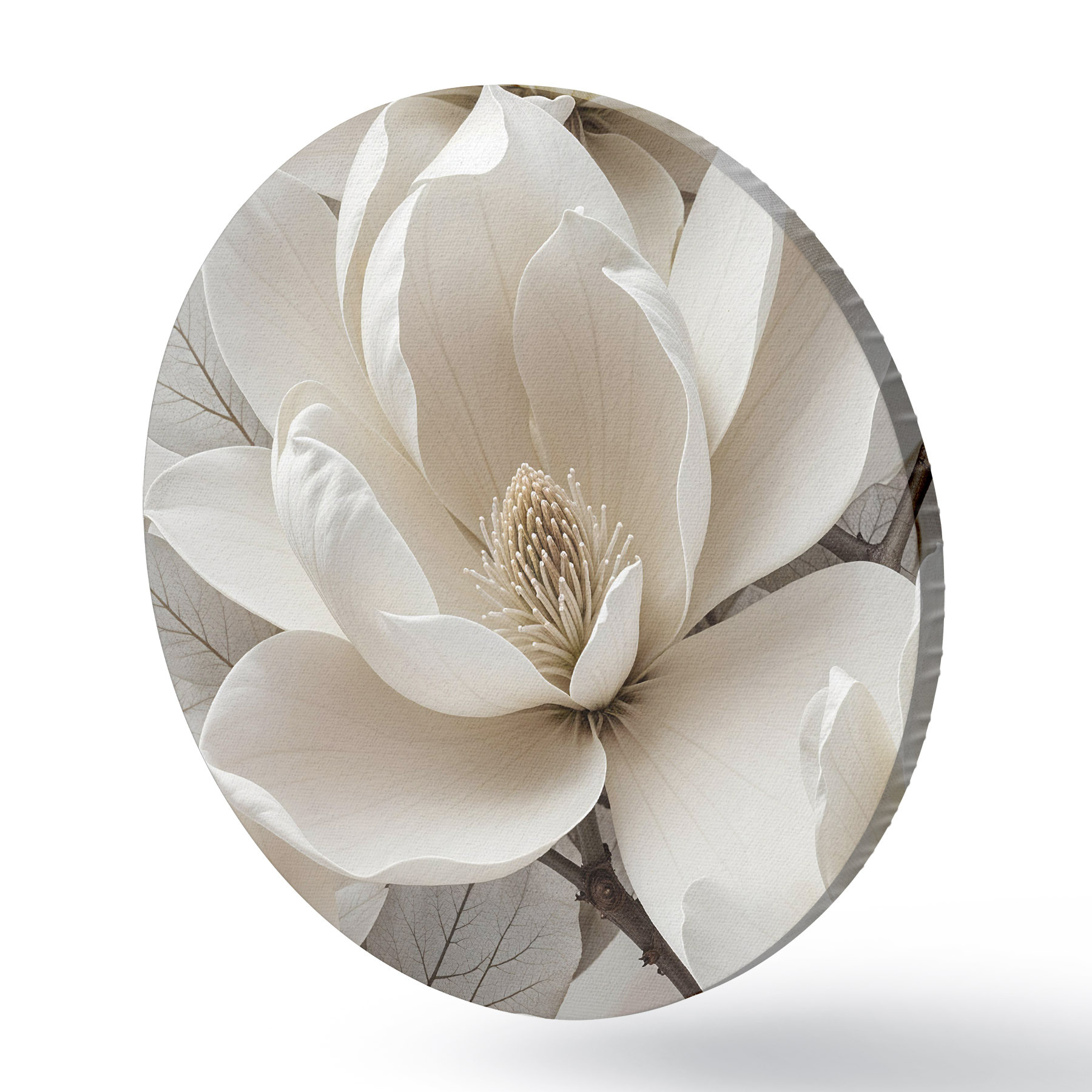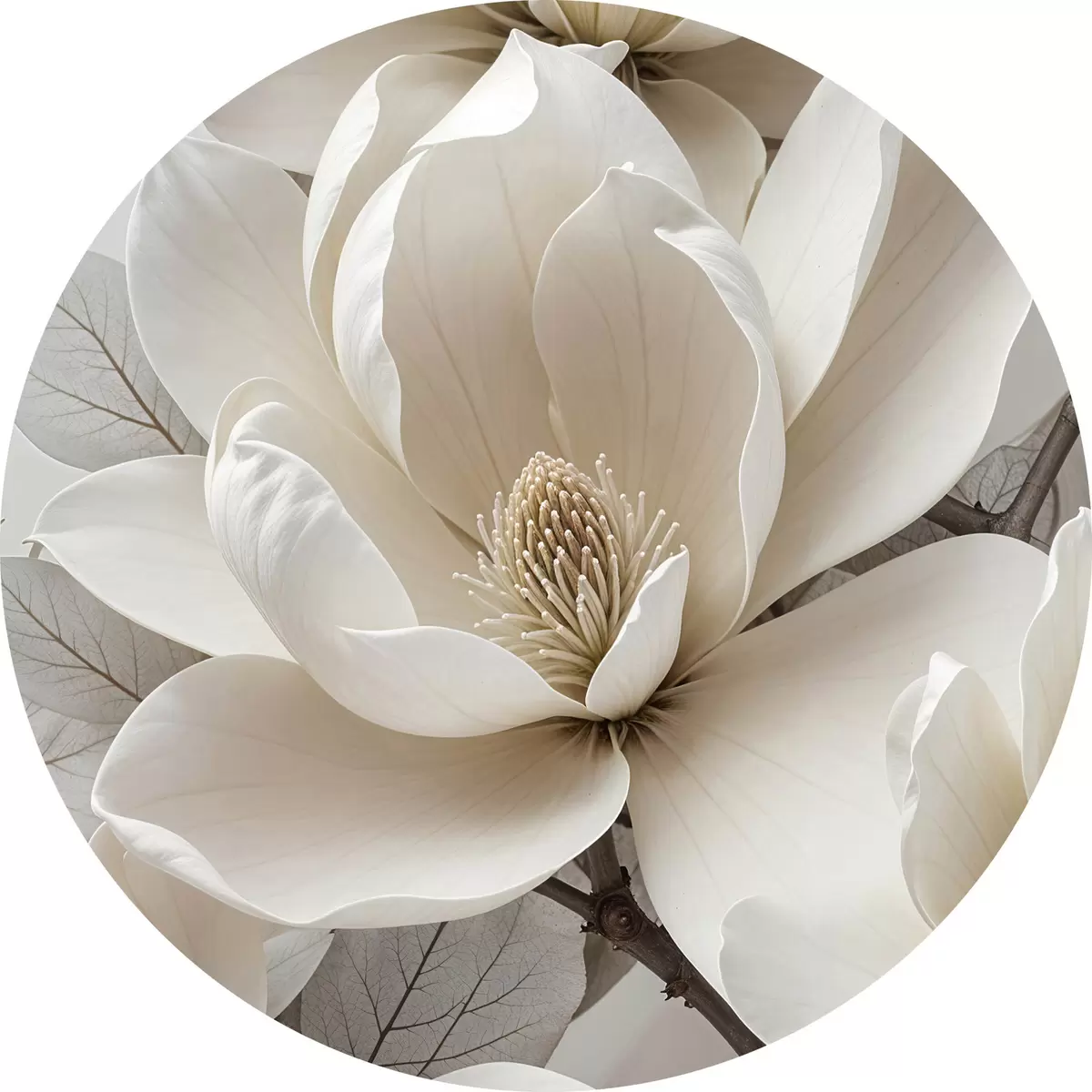 Nuotrauka Balta magnolijos gėlė su švelniais žiedlapiais, apsupta žalių lapų šviesiame fone Nr r39527