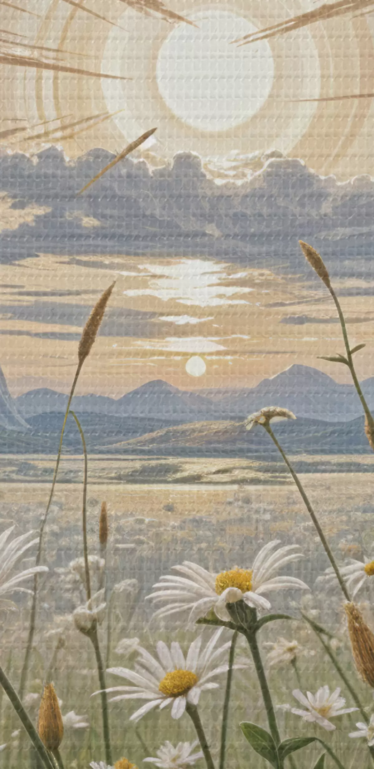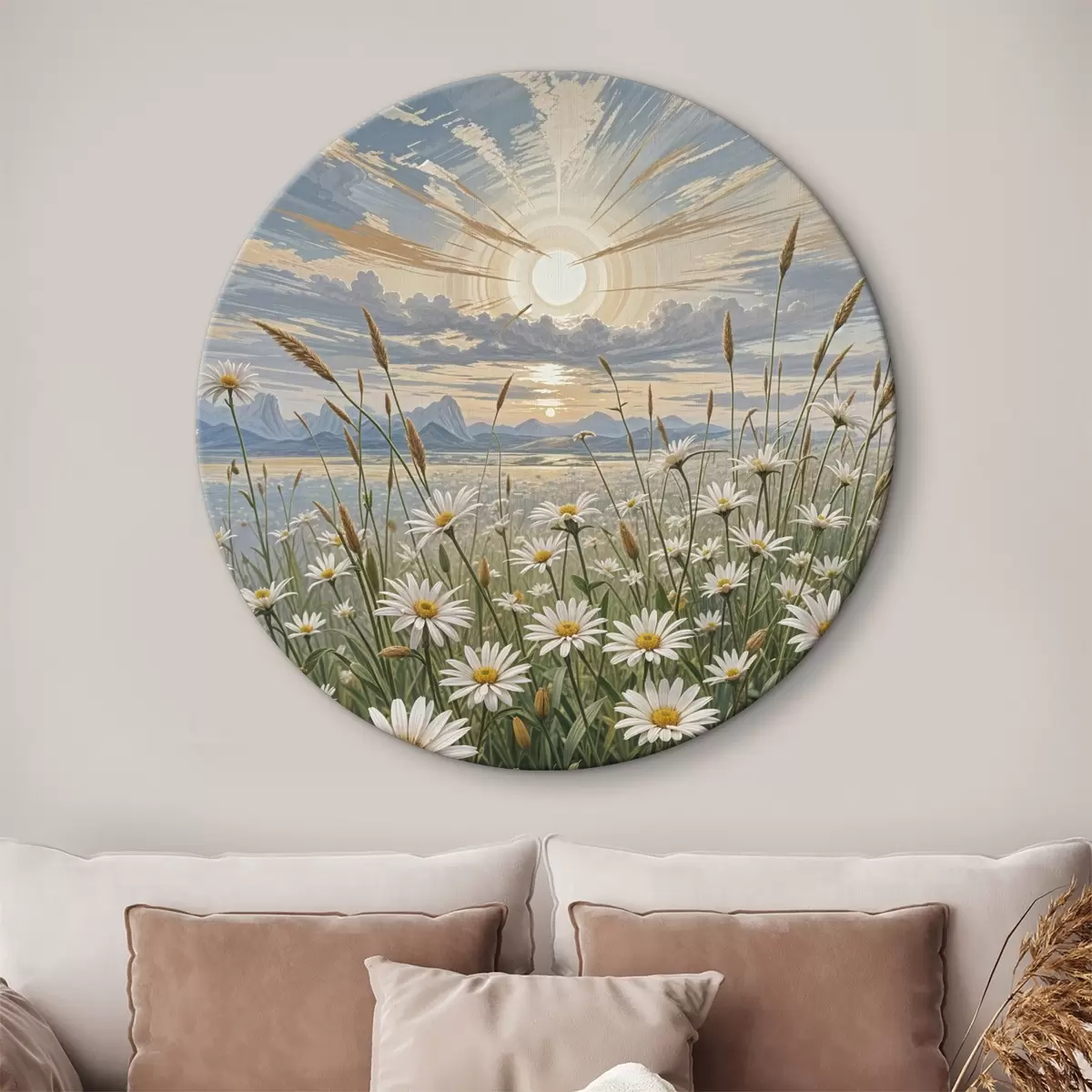 Nuotrauka Baltų ramunėlių žiedų laukas pirmame plane su kalnų peizažu ir debesuotu dangumi Nr r39528
