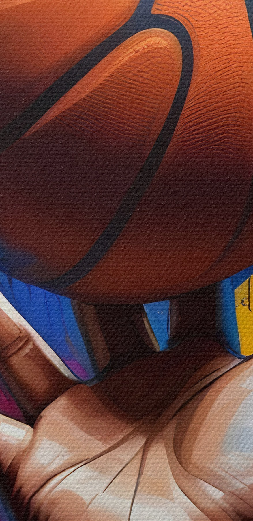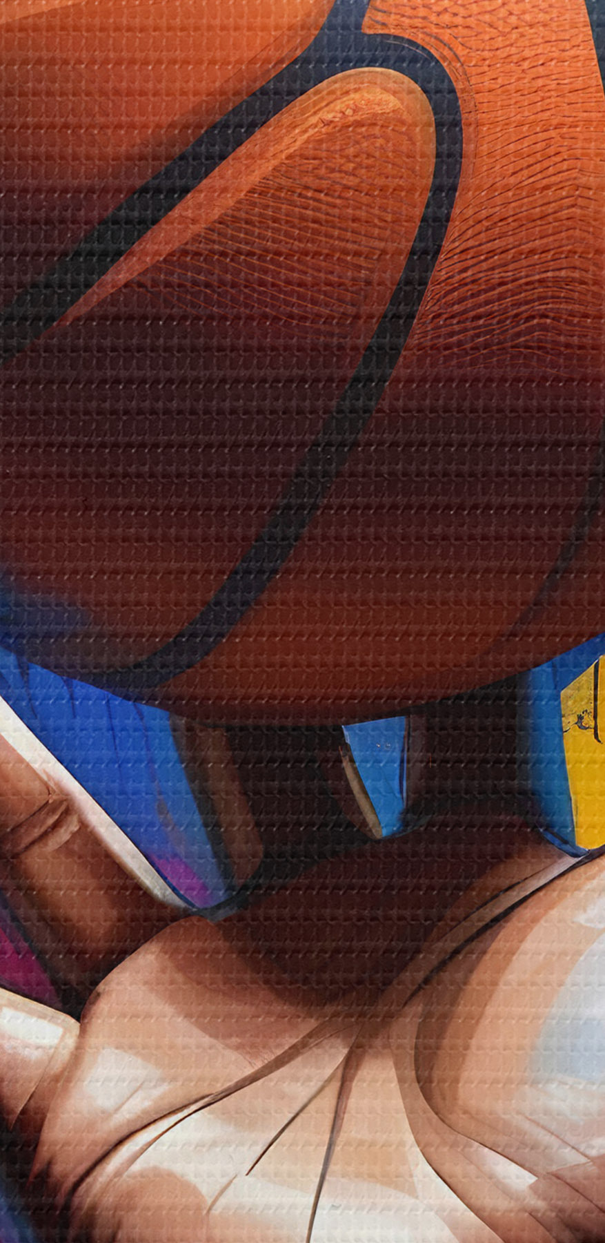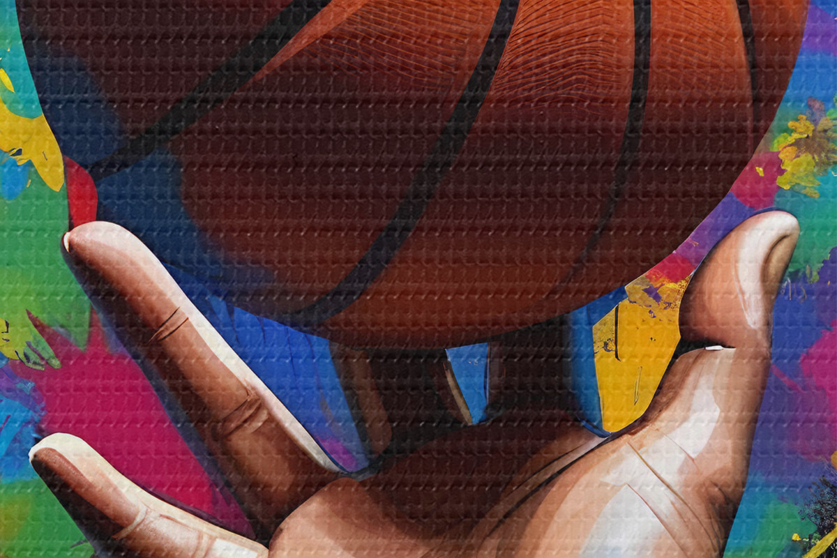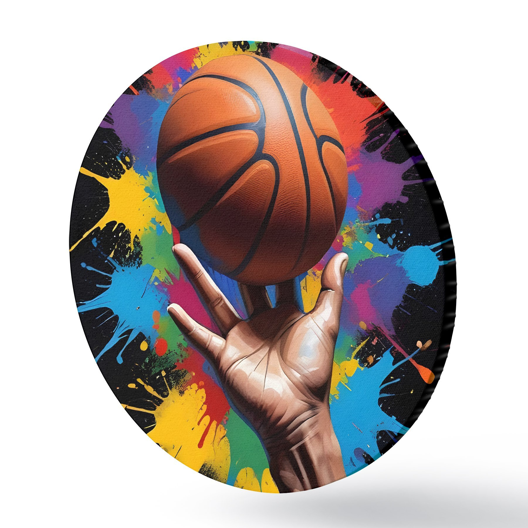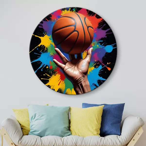 Nuotrauka Ranka, laikanti krepšinio kamuolį spalvingame dažų taškymo fone Nr r39529