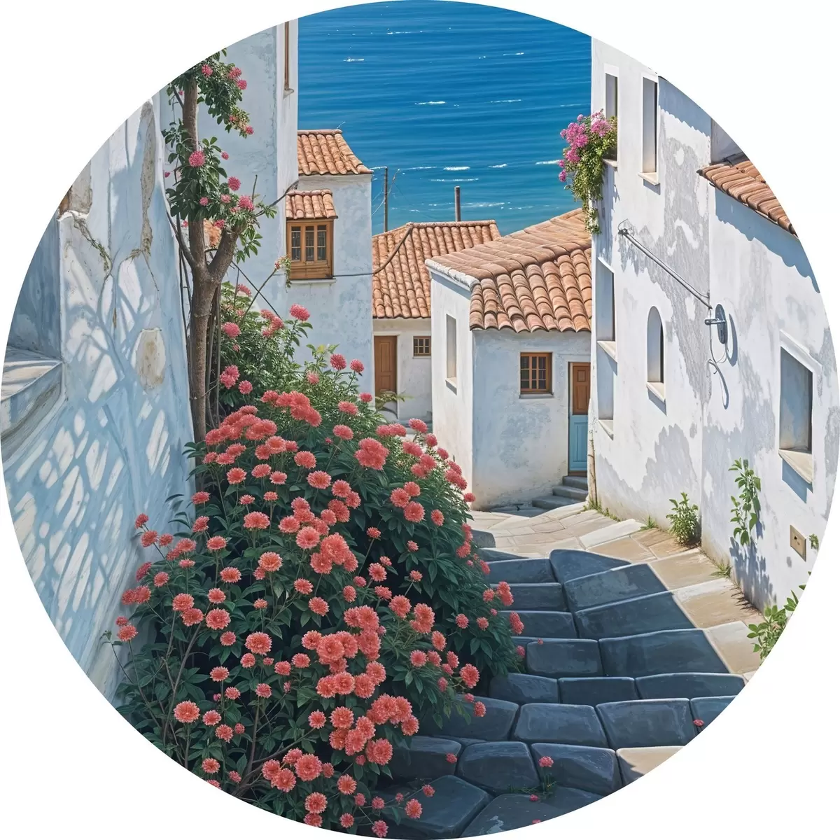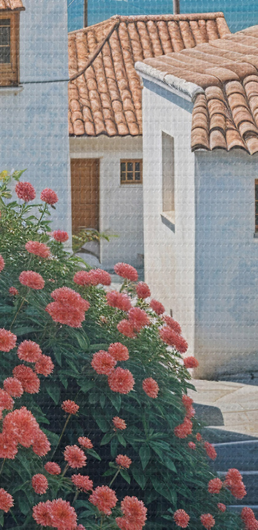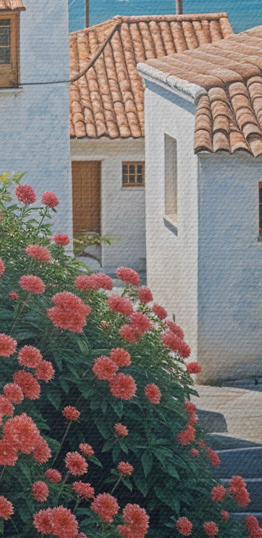 Nuotrauka Siaura pakrantės miestelio gatvė su baltais pastatais, raudonų čerpių stogais ir ryškiomis rožinėmis gėlėmis Nr r39532