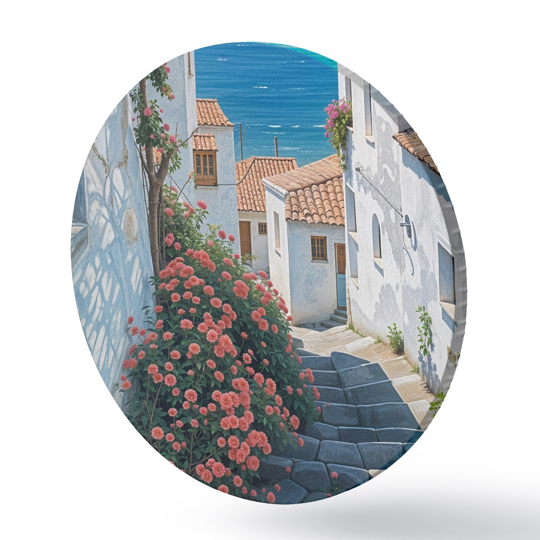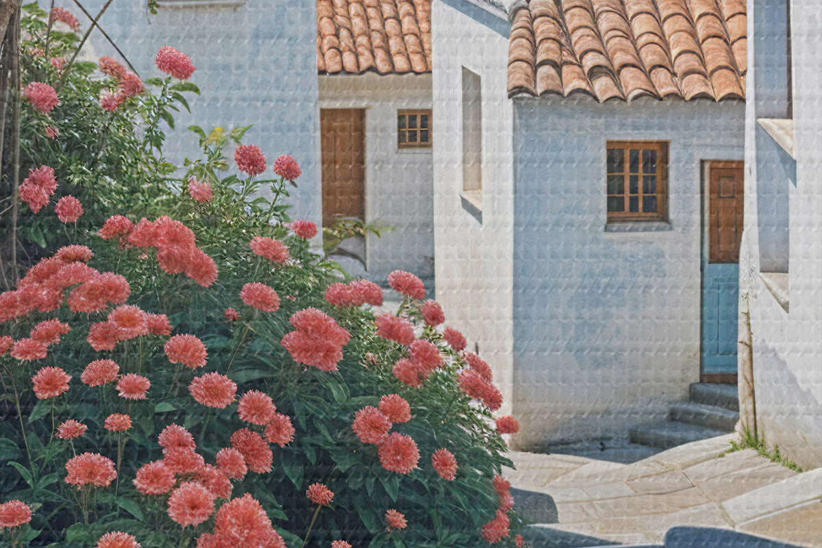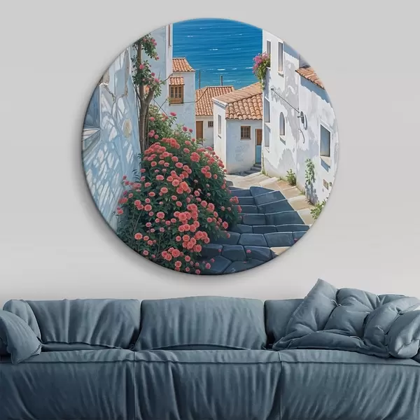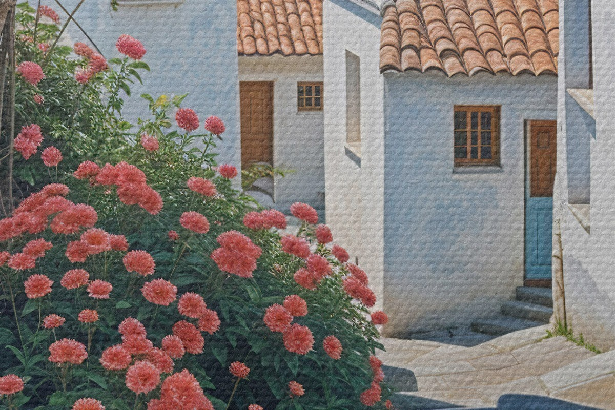 Nuotrauka Siaura pakrantės miestelio gatvė su baltais pastatais, raudonų čerpių stogais ir ryškiomis rožinėmis gėlėmis Nr r39532