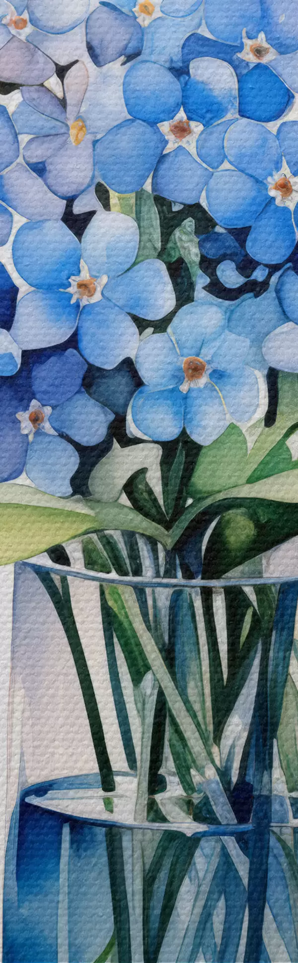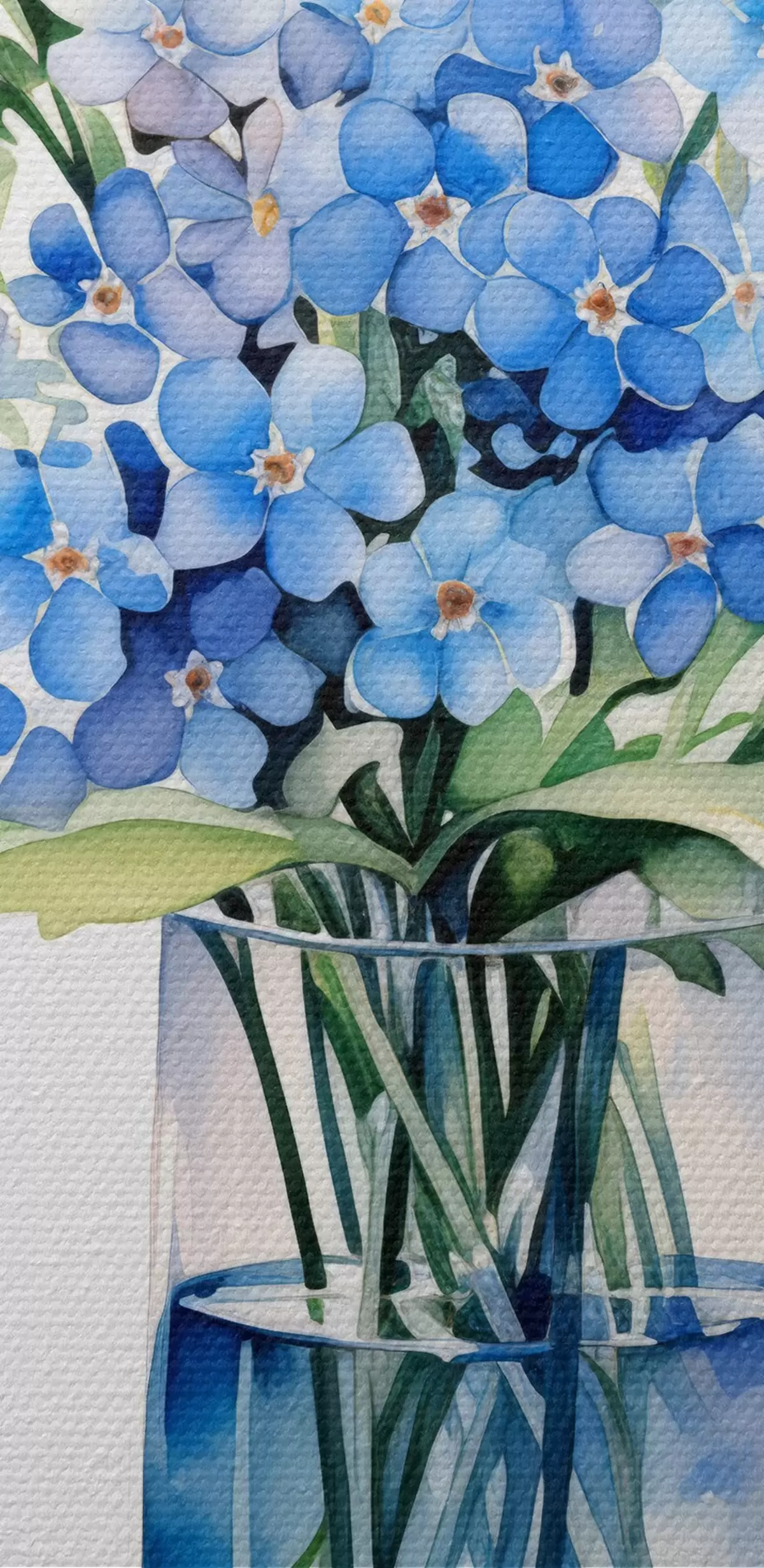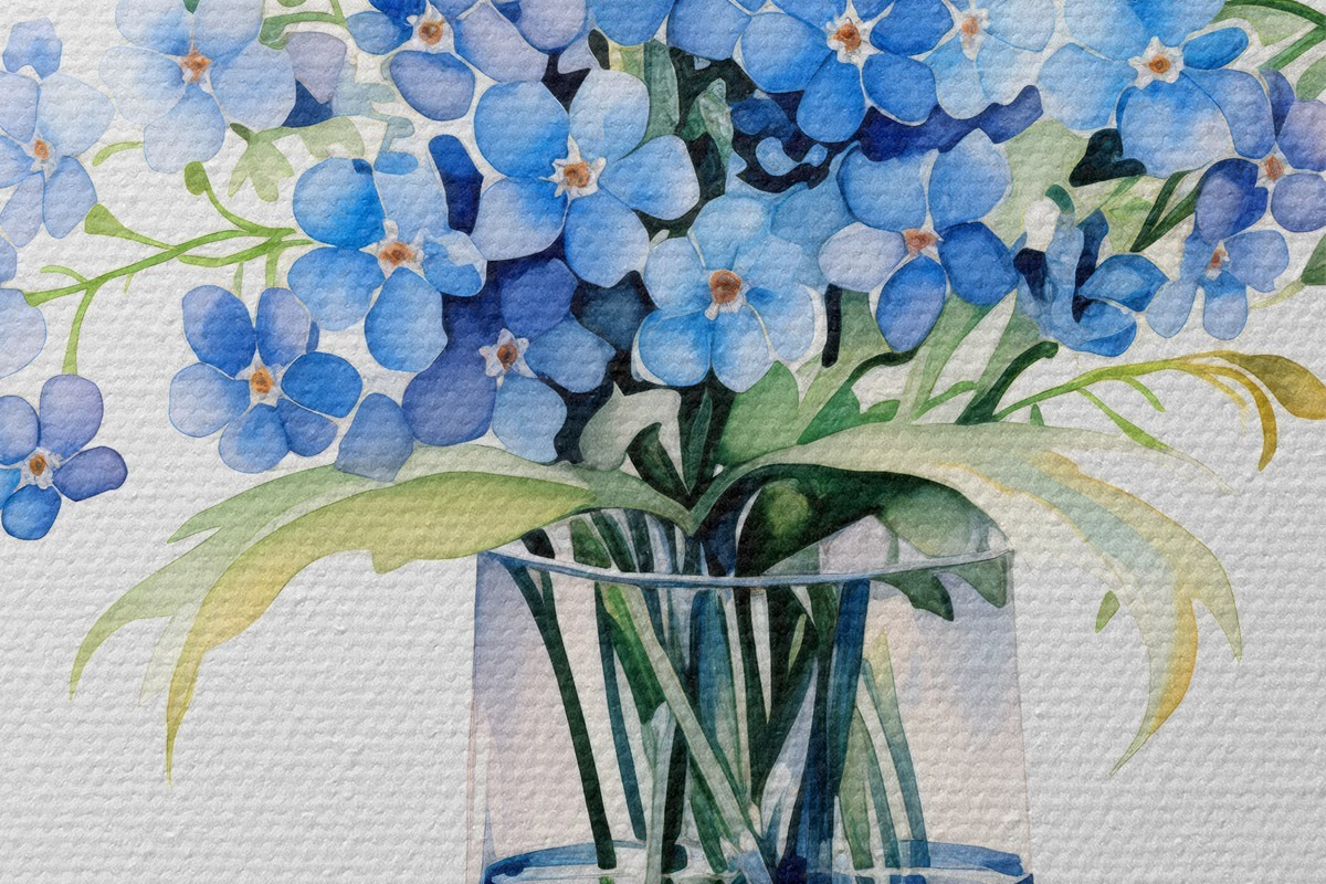 Nuotrauka Mėlynų lauko gėlių puokštė skaidrioje vazos akvarelėje Nr r39564