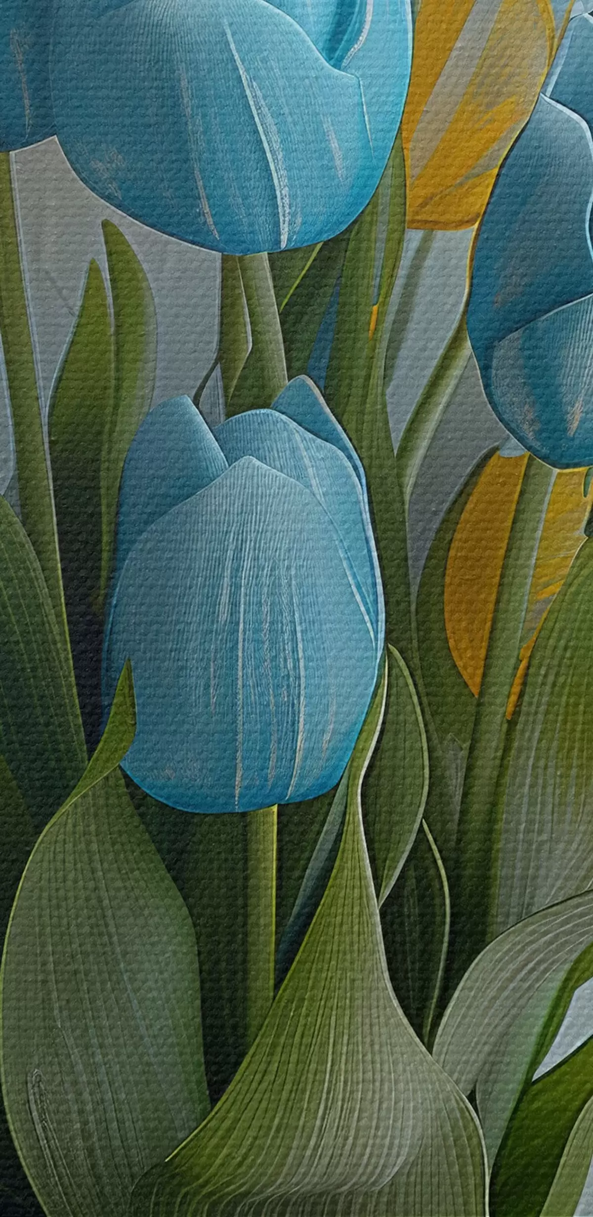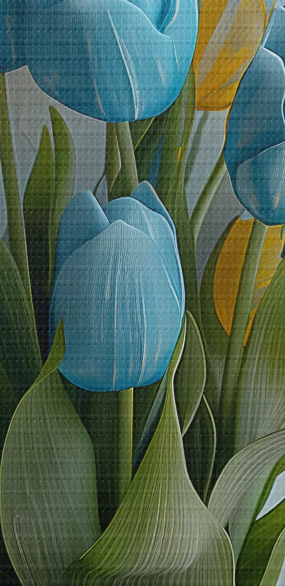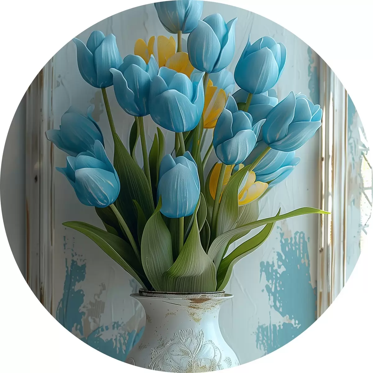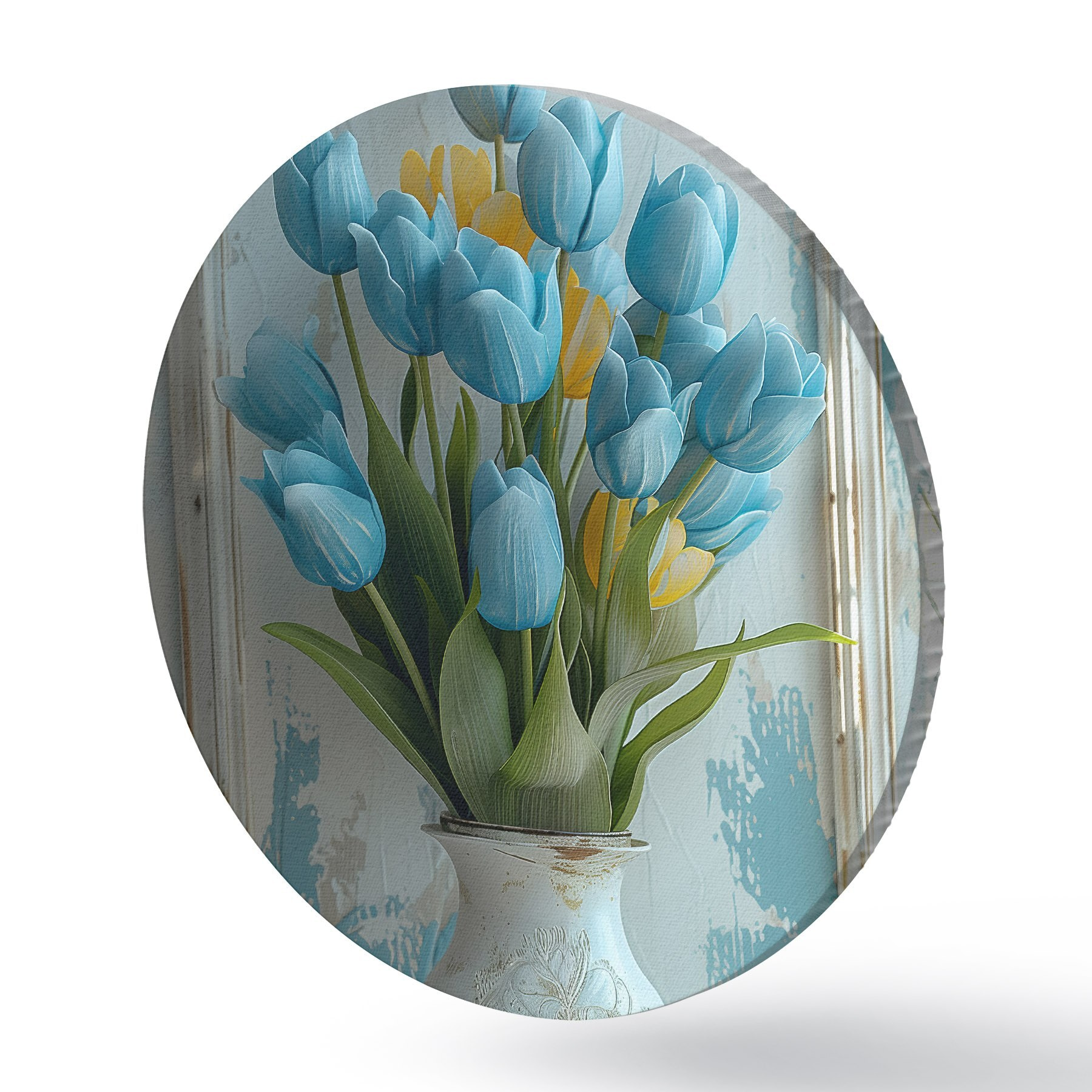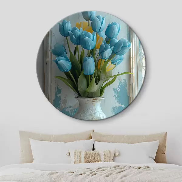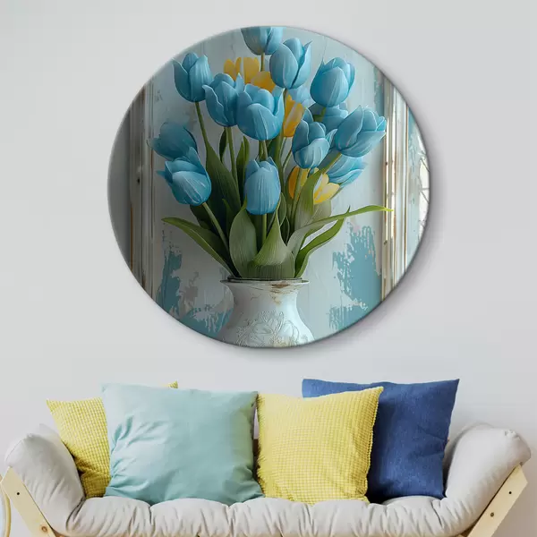 Nuotrauka Mėlynos ir geltonos 3D tulpės: elegantiškas sieninis paveikslas su baltu rėmeliu, baltas ir šviesiai mėlynas fonas ir graviruota vaza Nr r39636