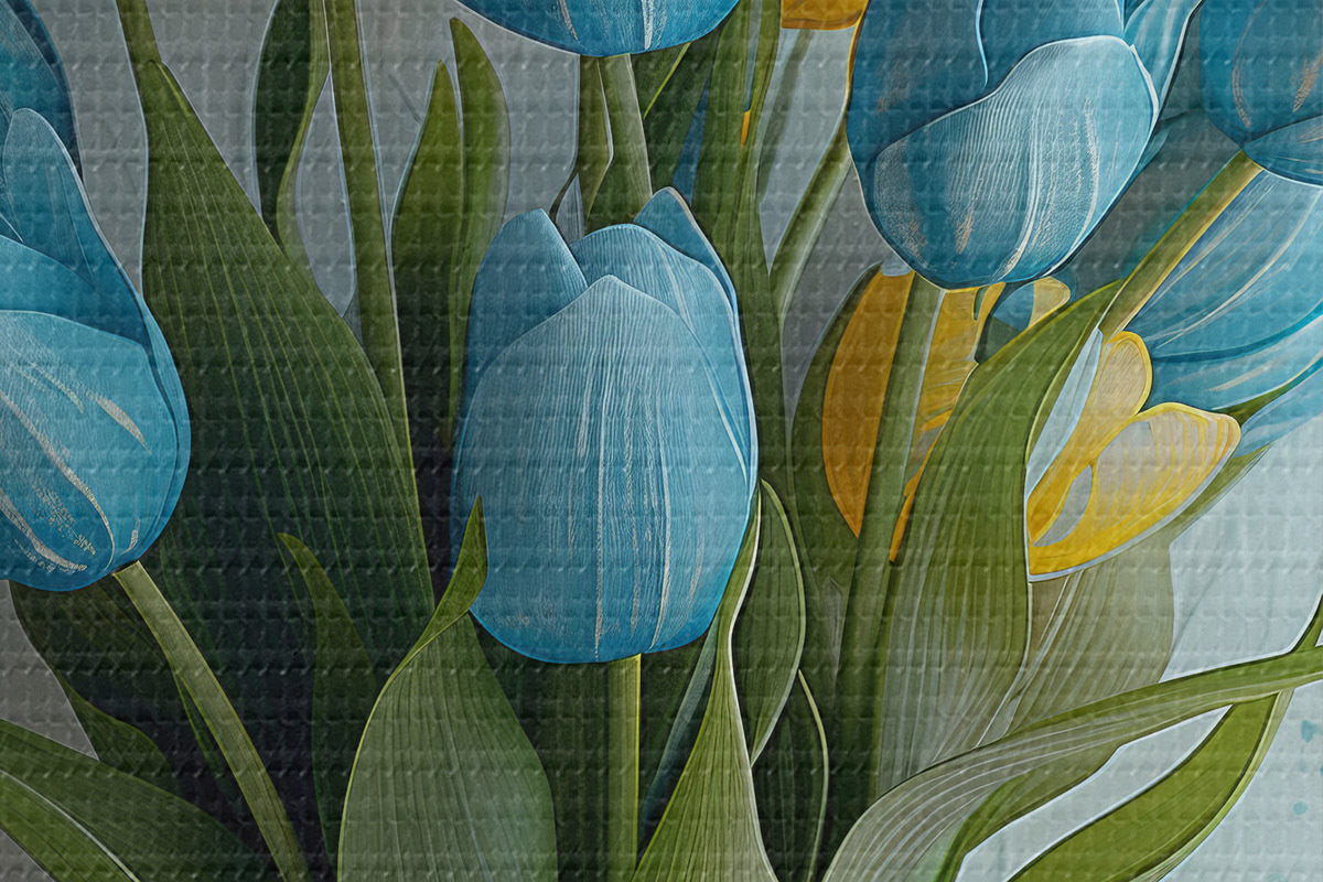 Nuotrauka Mėlynos ir geltonos 3D tulpės: elegantiškas sieninis paveikslas su baltu rėmeliu, baltas ir šviesiai mėlynas fonas ir graviruota vaza Nr r39636