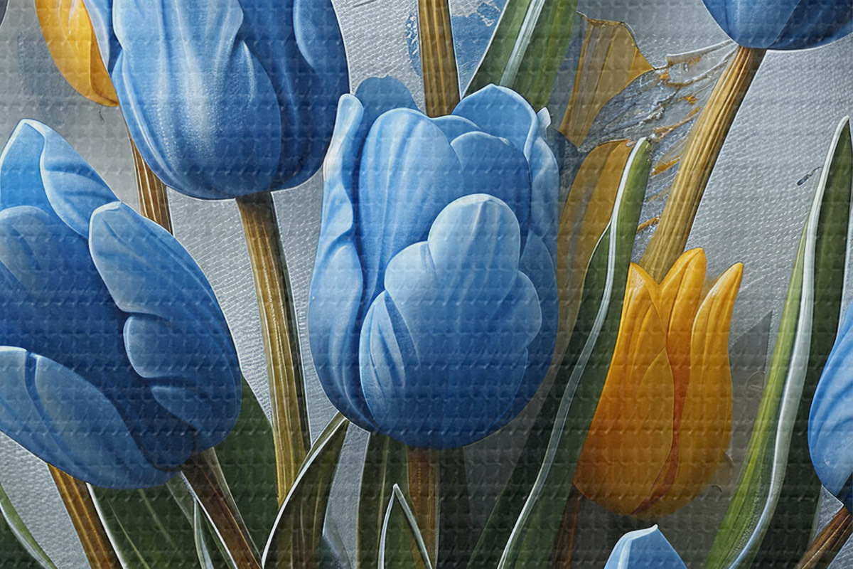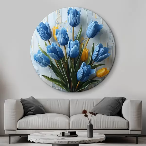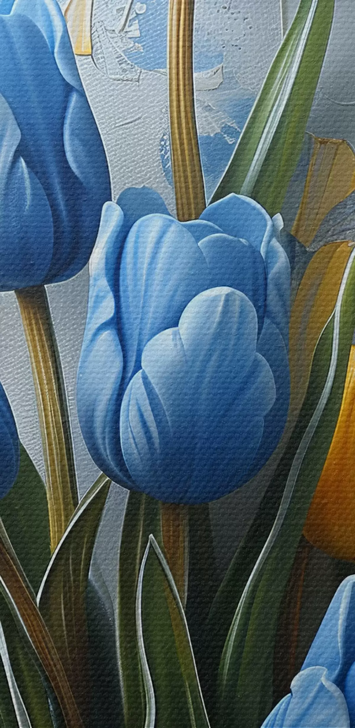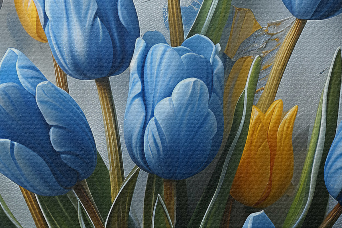 Nuotrauka Mėlynos ir geltonos 3D tulpės: elegantiškas aliejumi dažytas sienos paveikslas baltame ir šviesiai mėlyname fone ir išgraviruota vaza Nr r39637