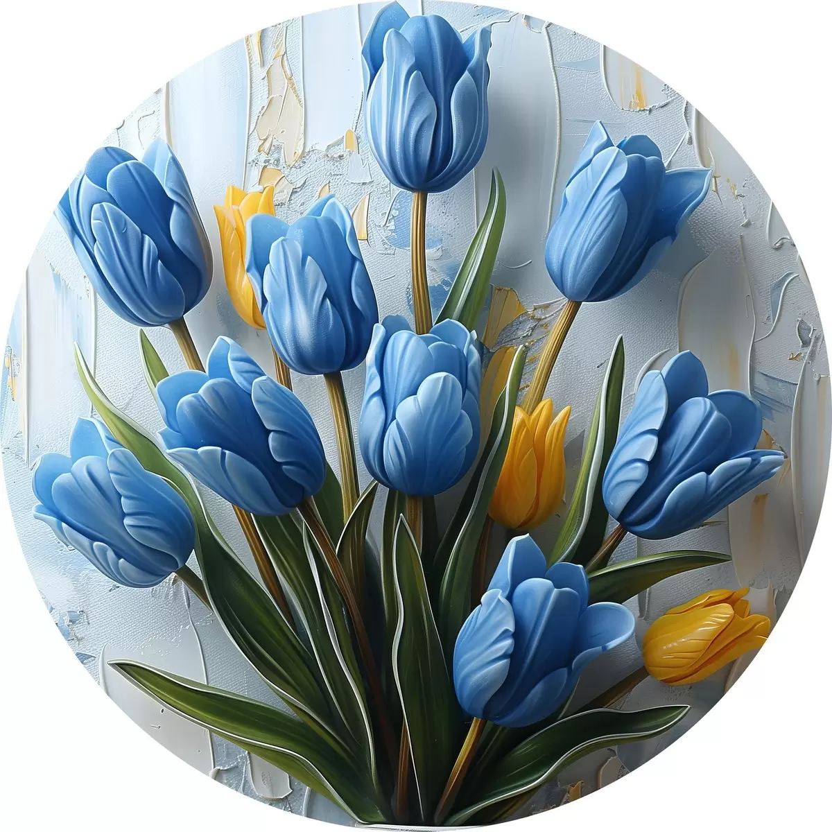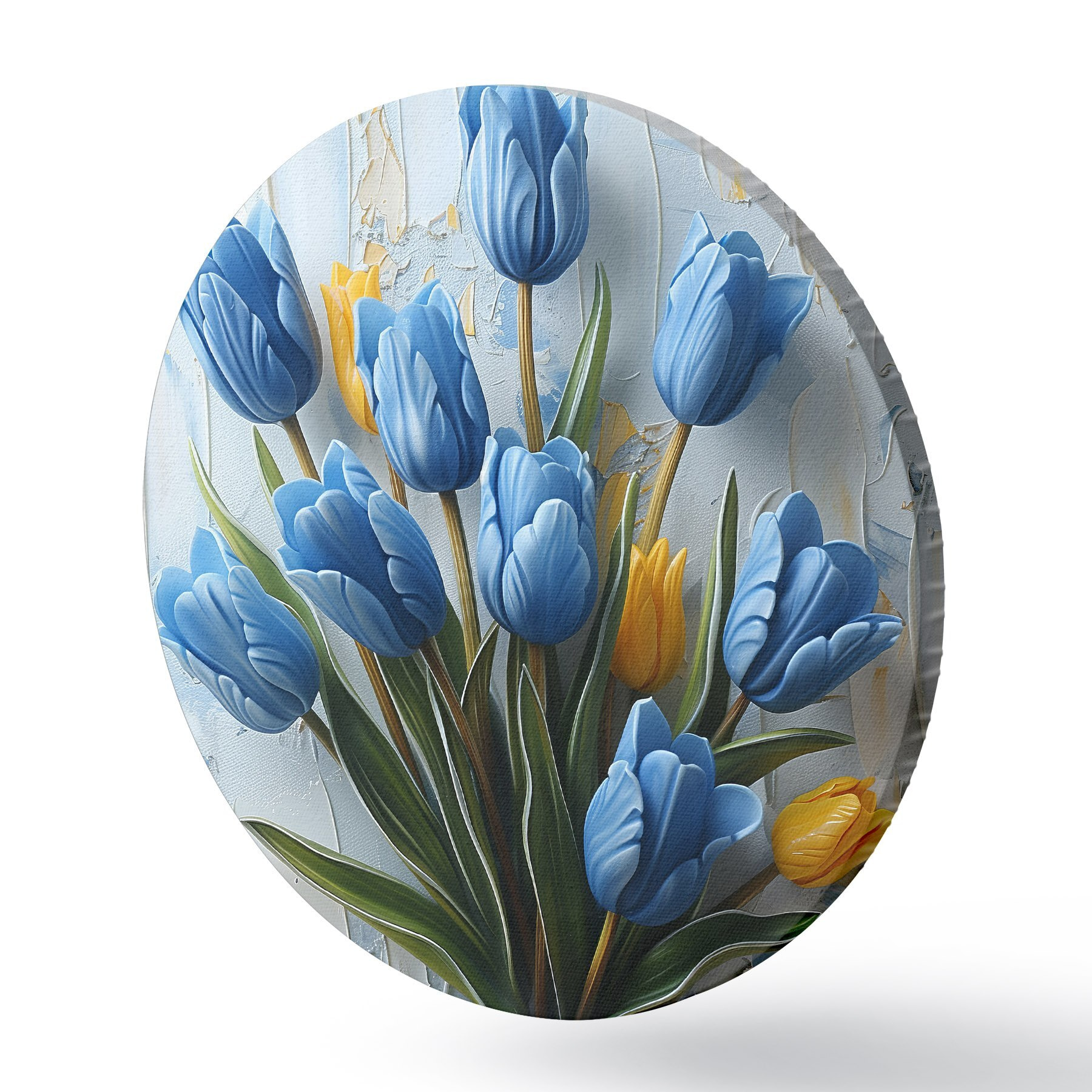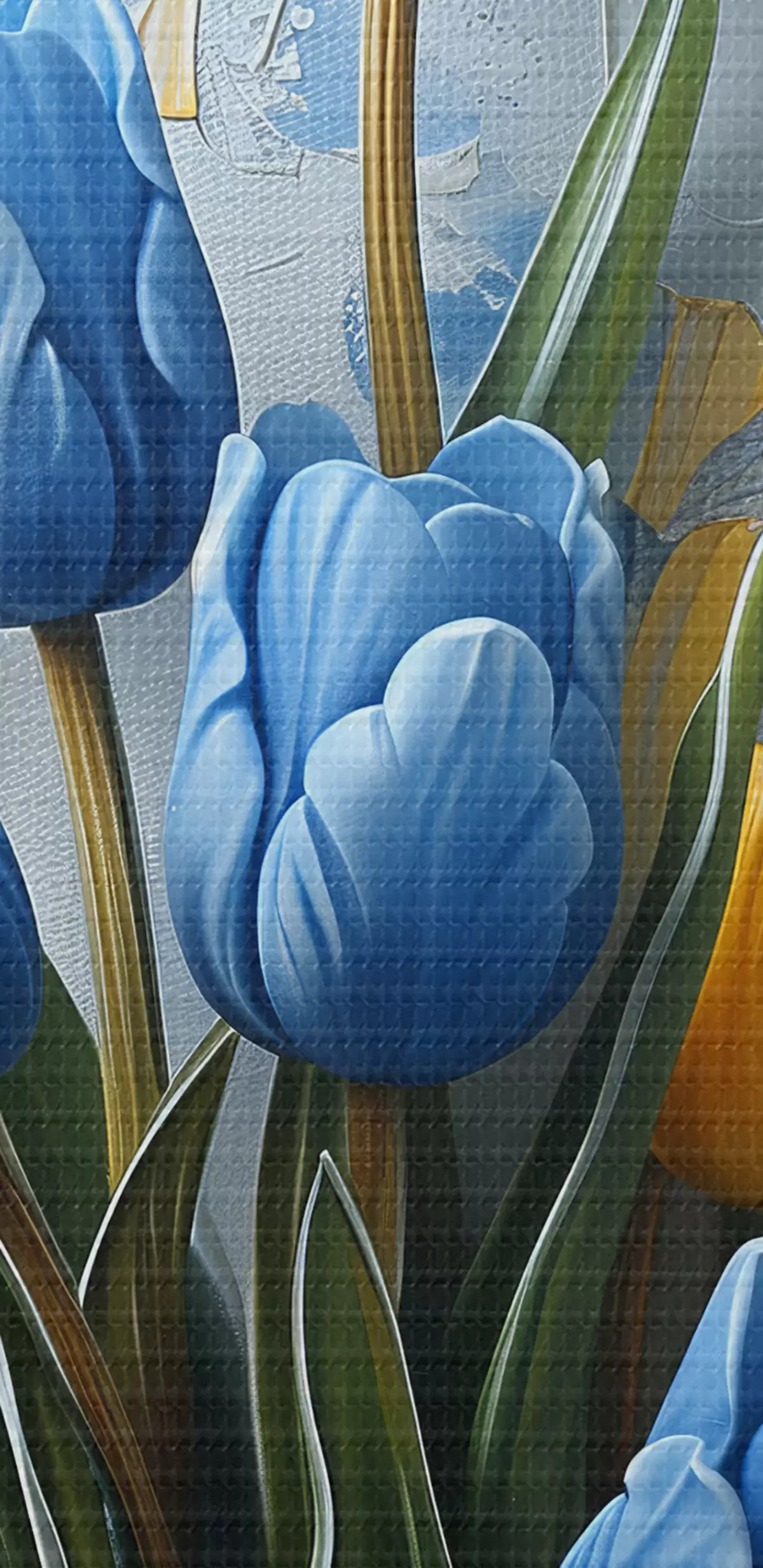 Nuotrauka Mėlynos ir geltonos 3D tulpės: elegantiškas aliejumi dažytas sienos paveikslas baltame ir šviesiai mėlyname fone ir išgraviruota vaza Nr r39637