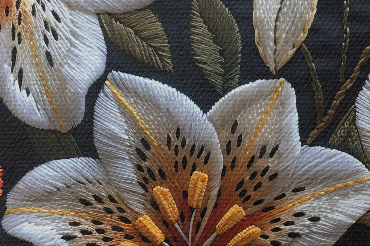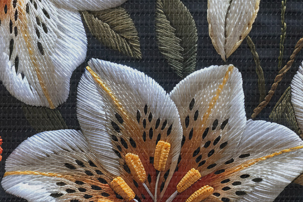 Nuotrauka Kelmo siuvinėjimas: žydinčios lelijos juodais siūlais ant puošnaus audinio su detaliu vaizduojamuoju menu Nr r39650