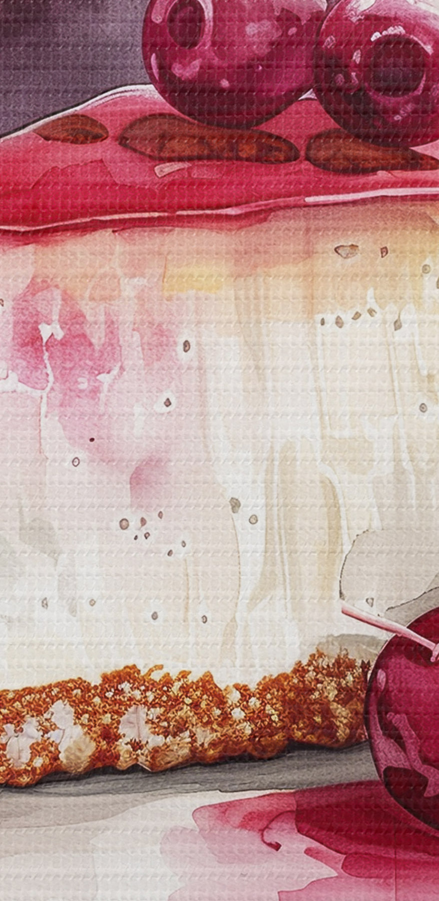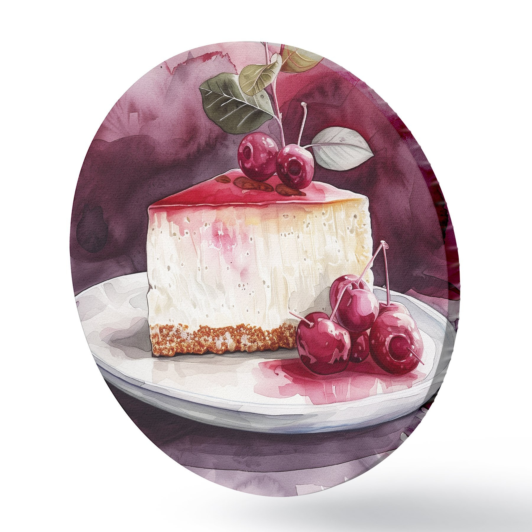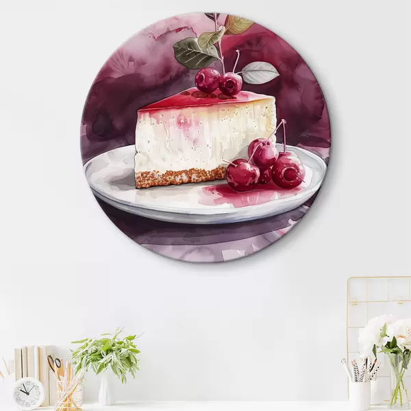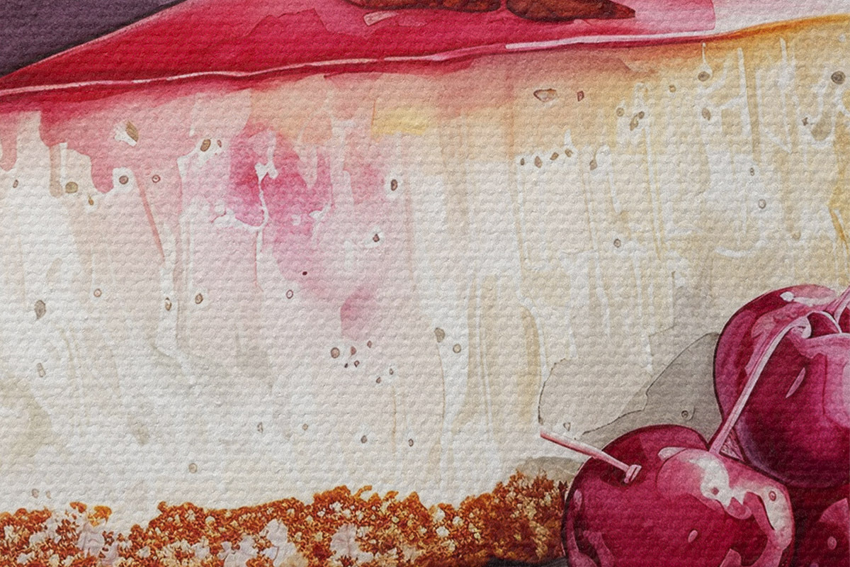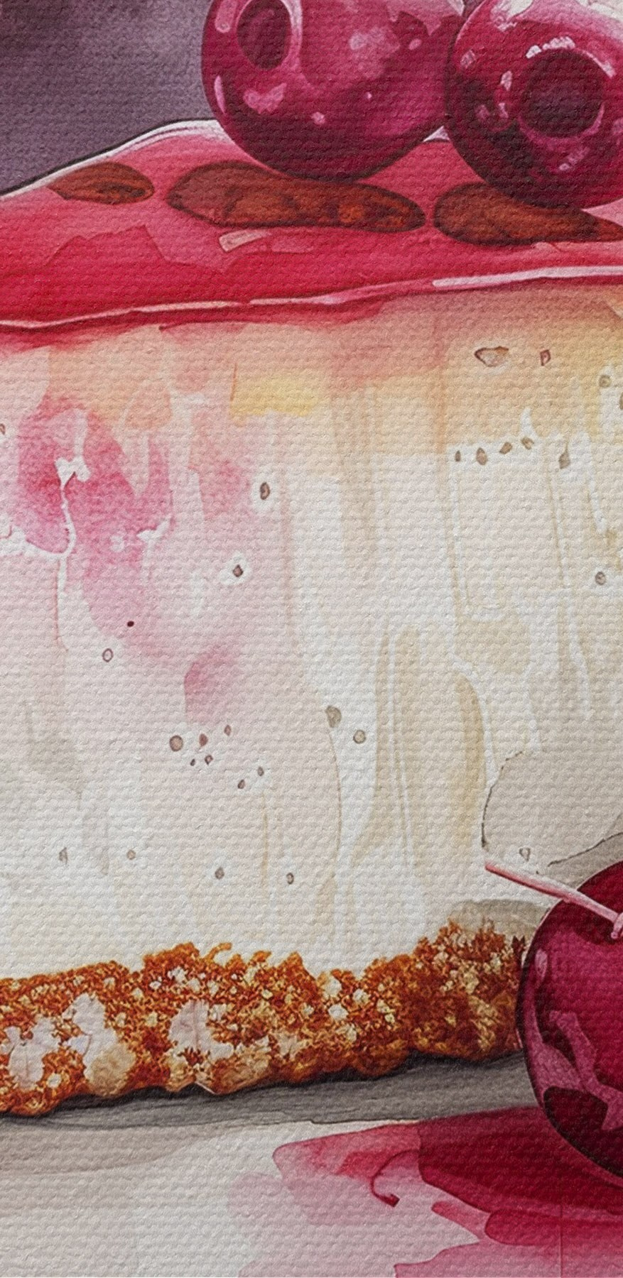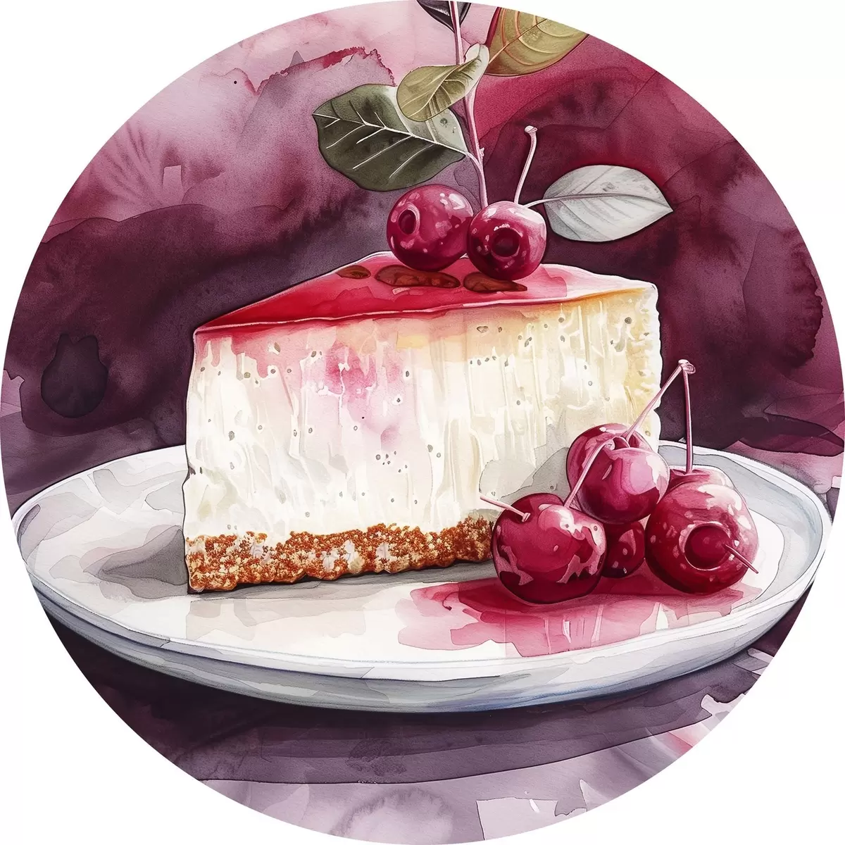 Nuotrauka Akvarelinis sūrio pyragas su vyšniomis, elegantiškas maisto menas, raudona ir violetinė spalvos Nr r39700