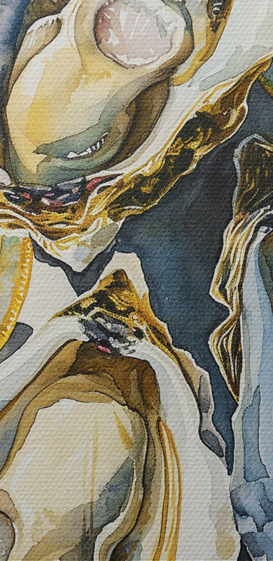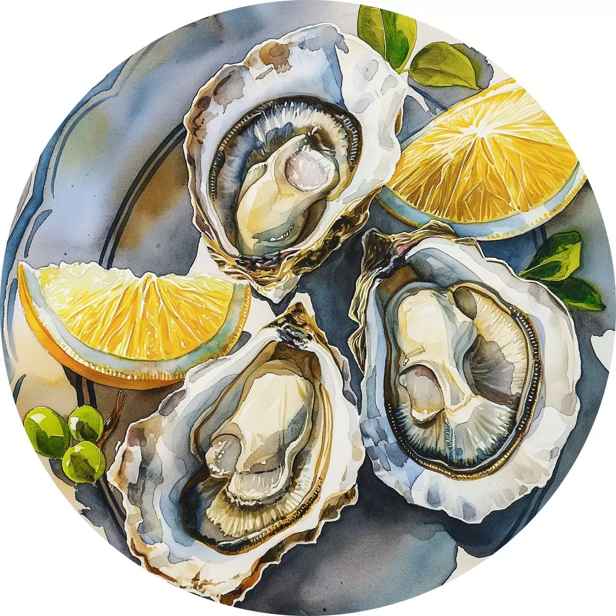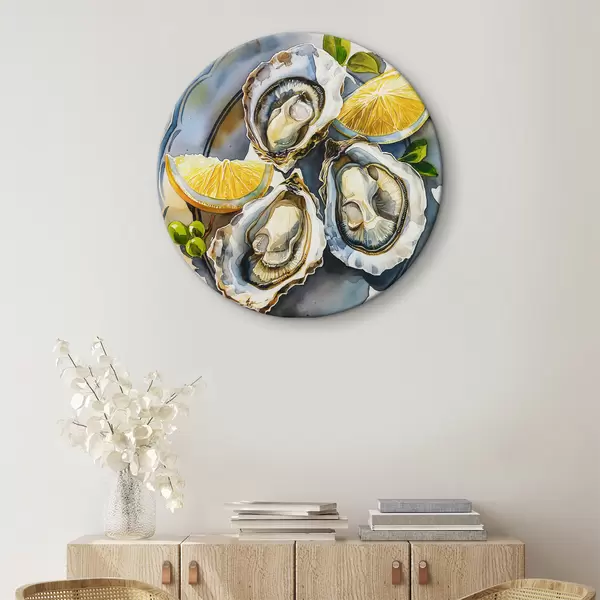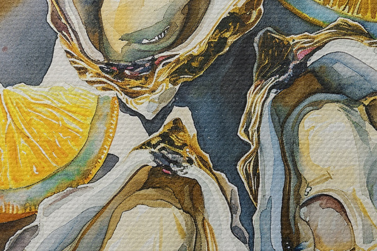 Nuotrauka Elegantiškos austrės lėkštėje, akvarelė, citrinos, natūralios spalvos, Viduržemio jūros Nr r39711