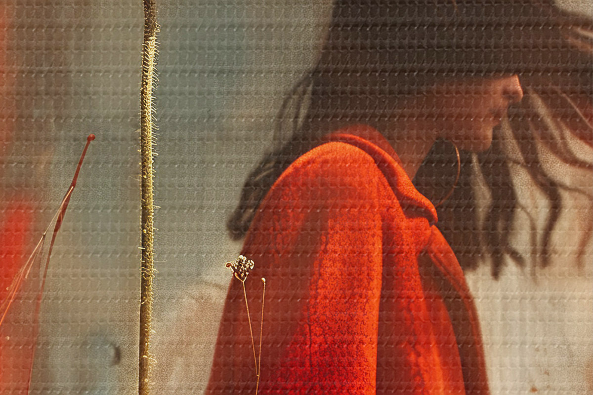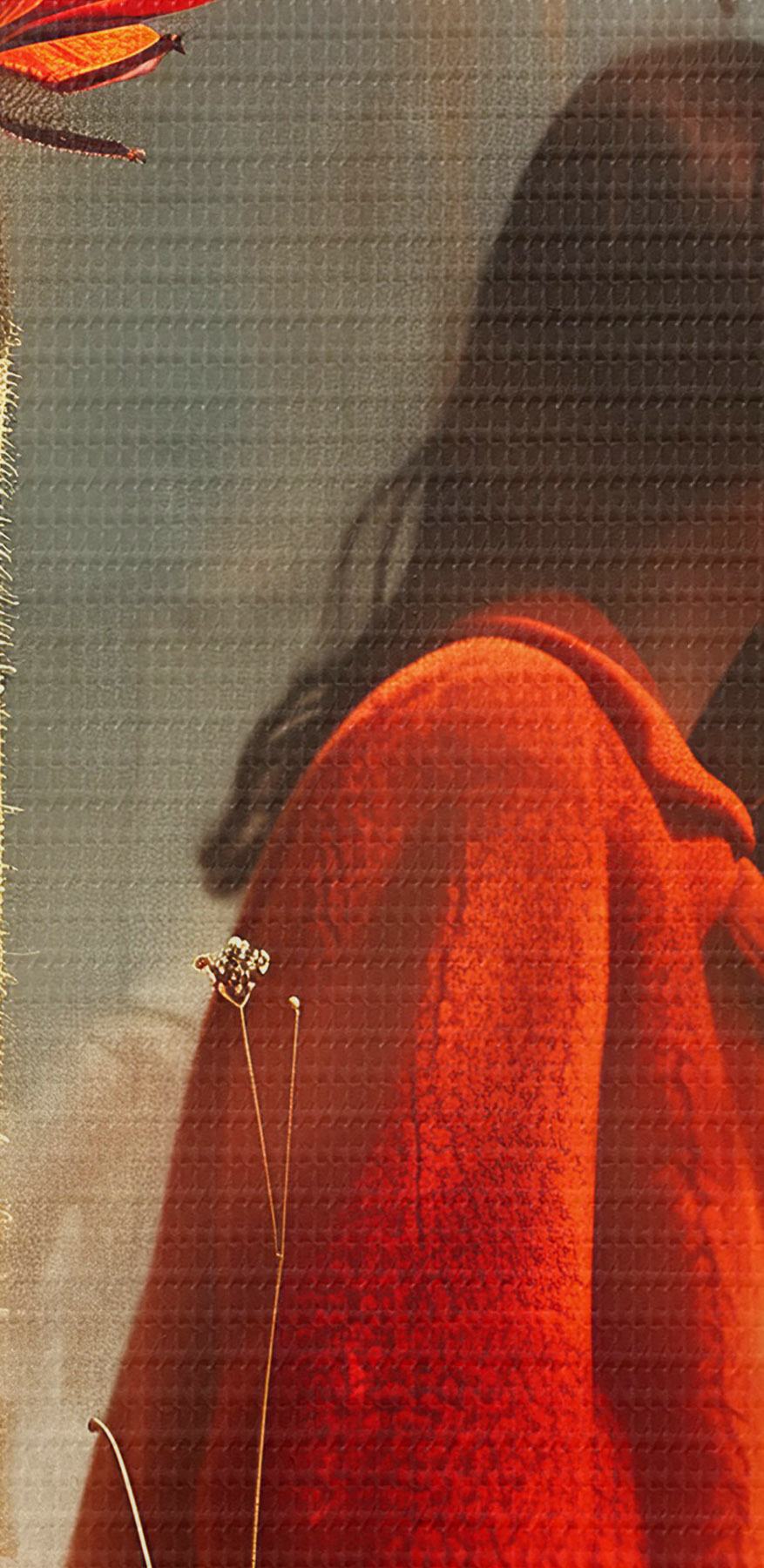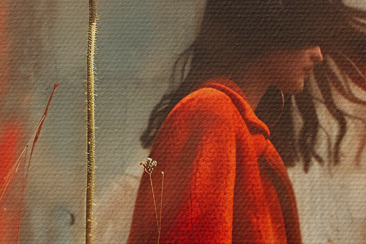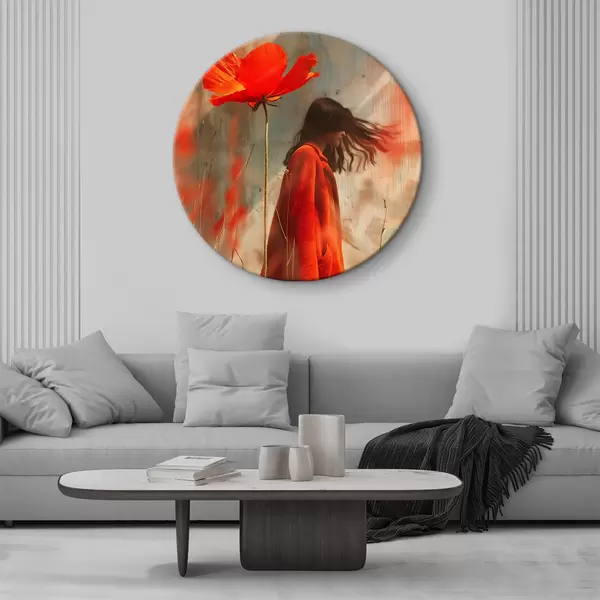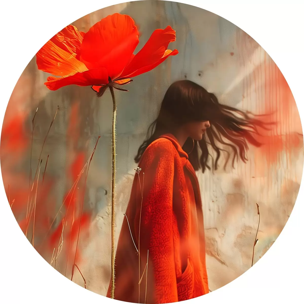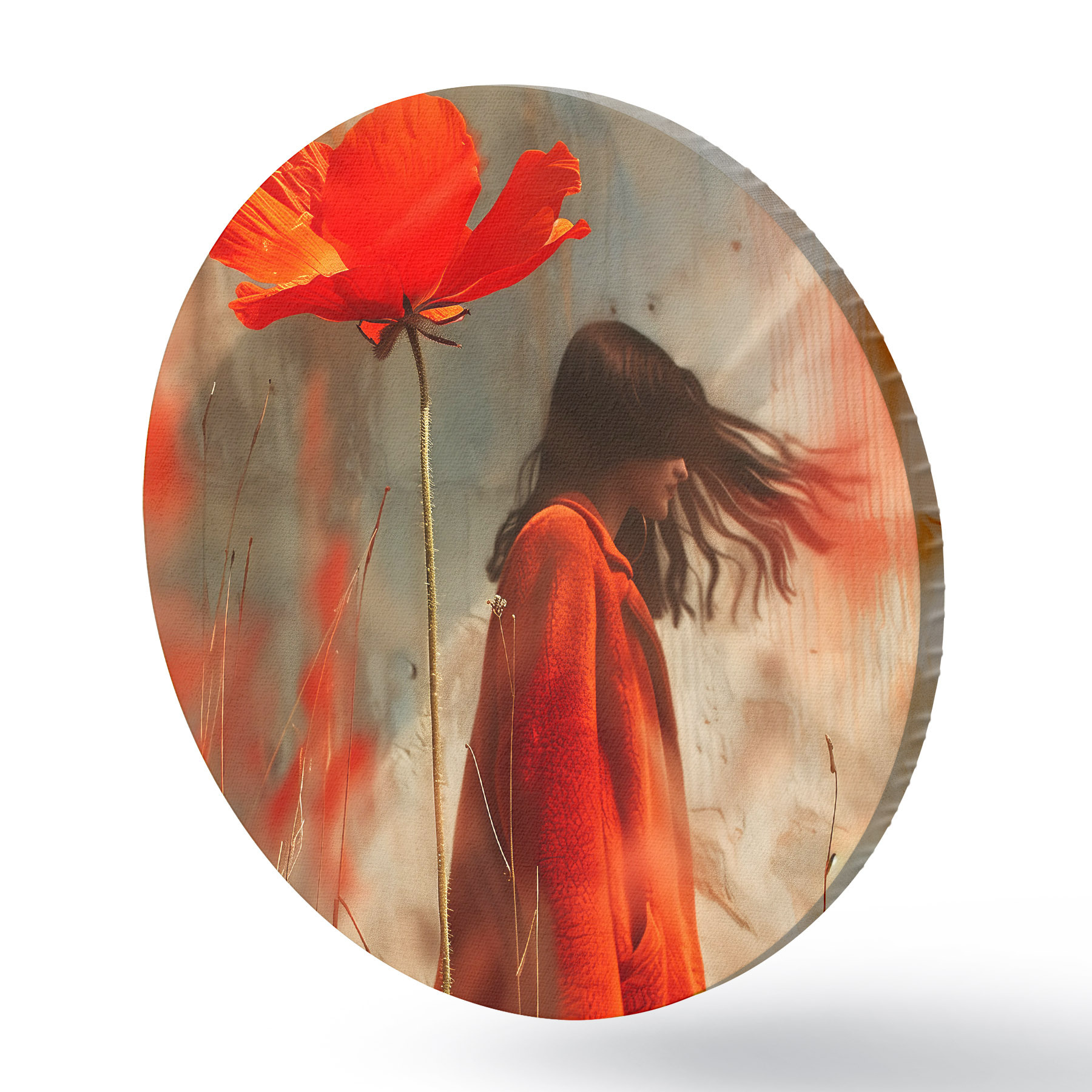 Nuotrauka Mergina raudonu kailiniu su lauke augančia aguona Nr r39764