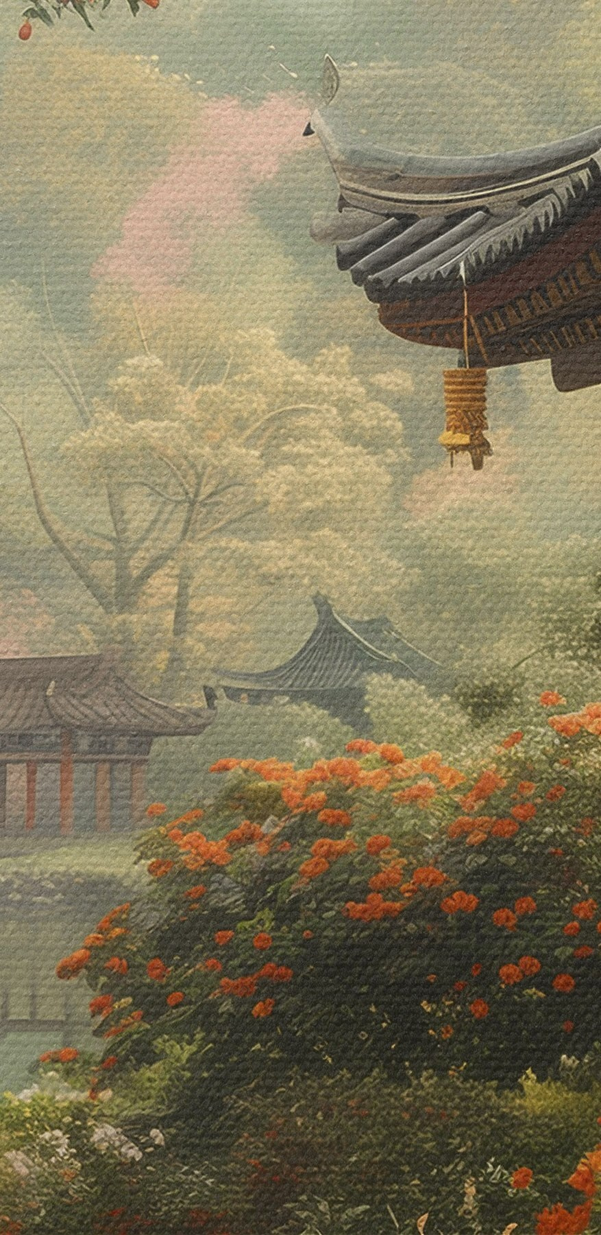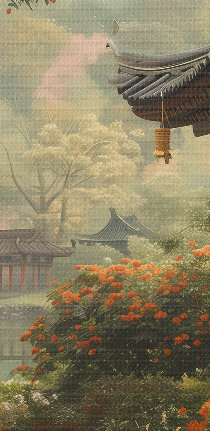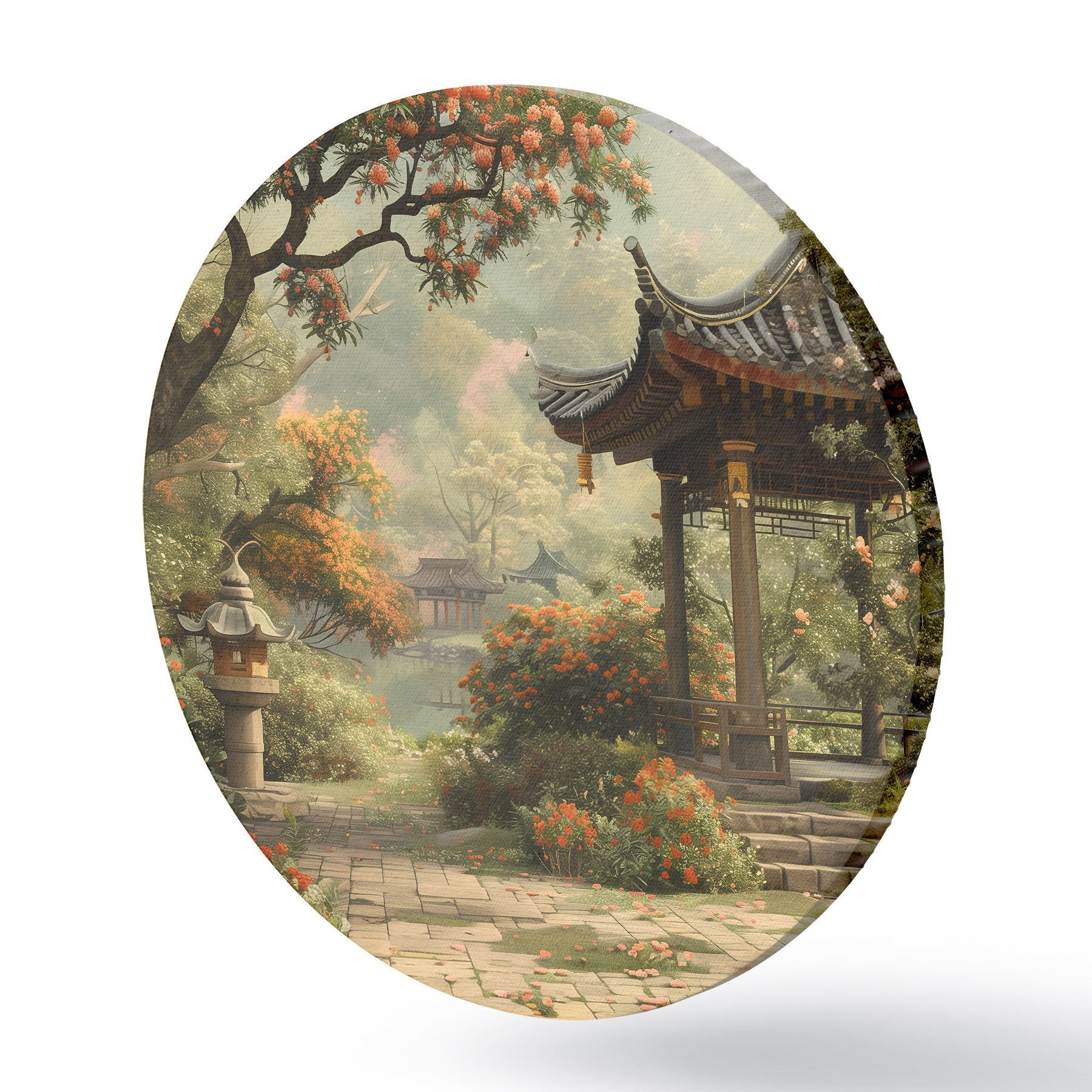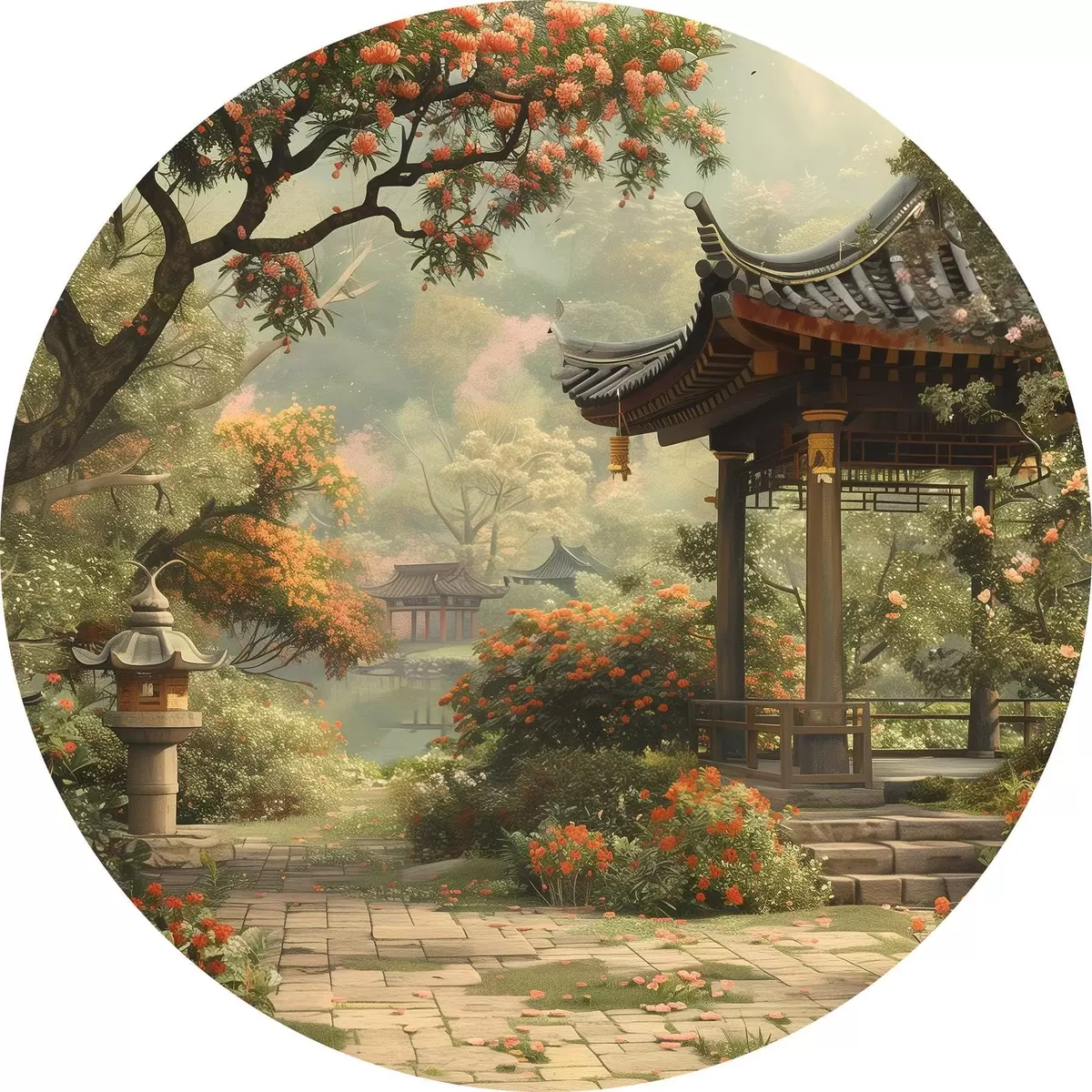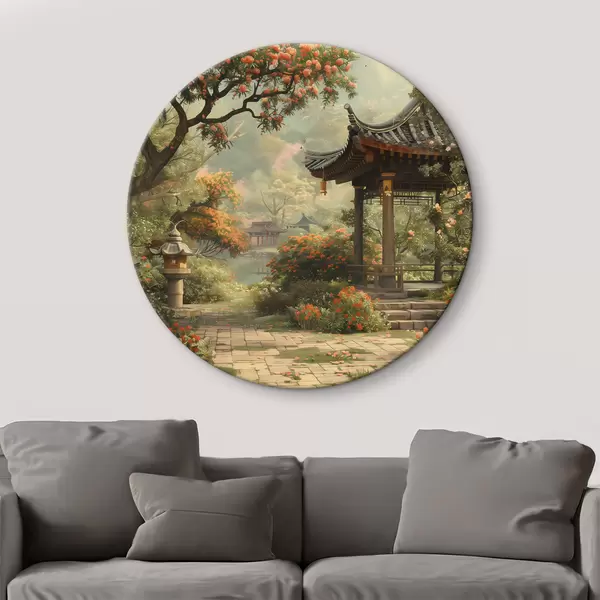 Apvalūs paveikslai Japoniškas parkas su žydinčiais medžiais ir gėlėmis, miškas, sodo namelis, ežeras r39772