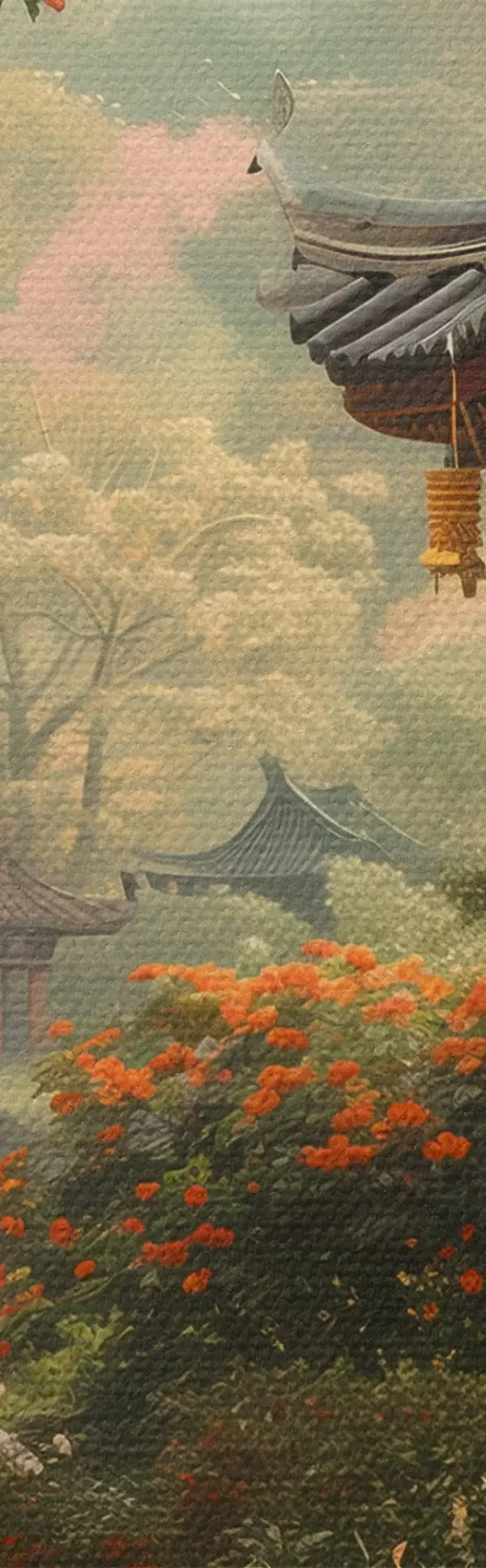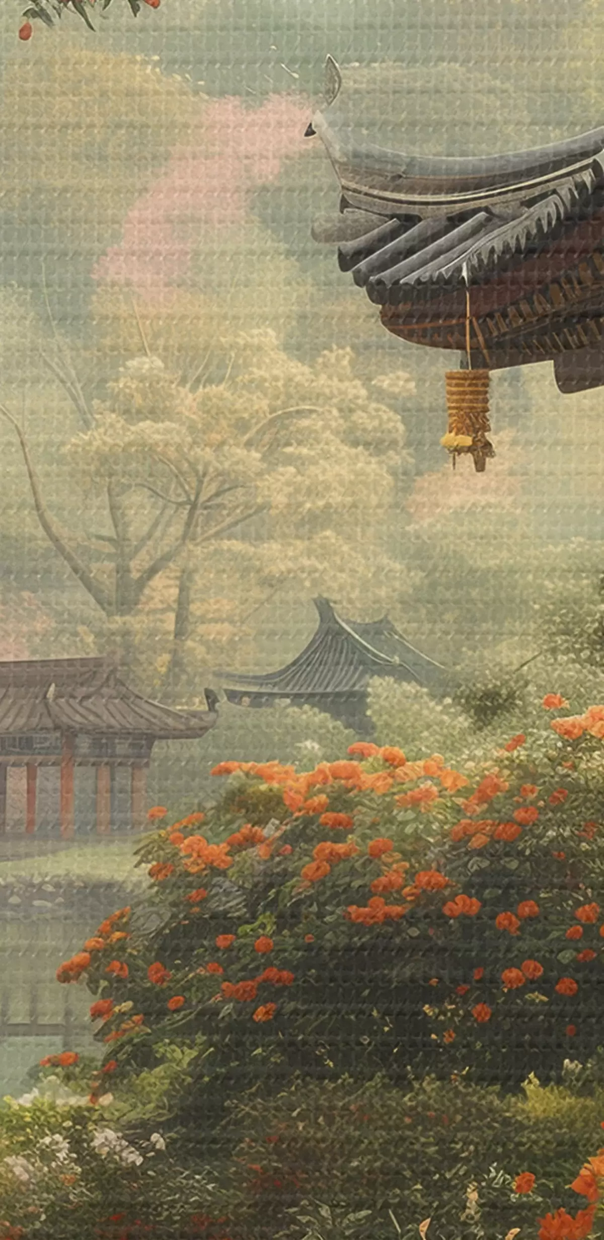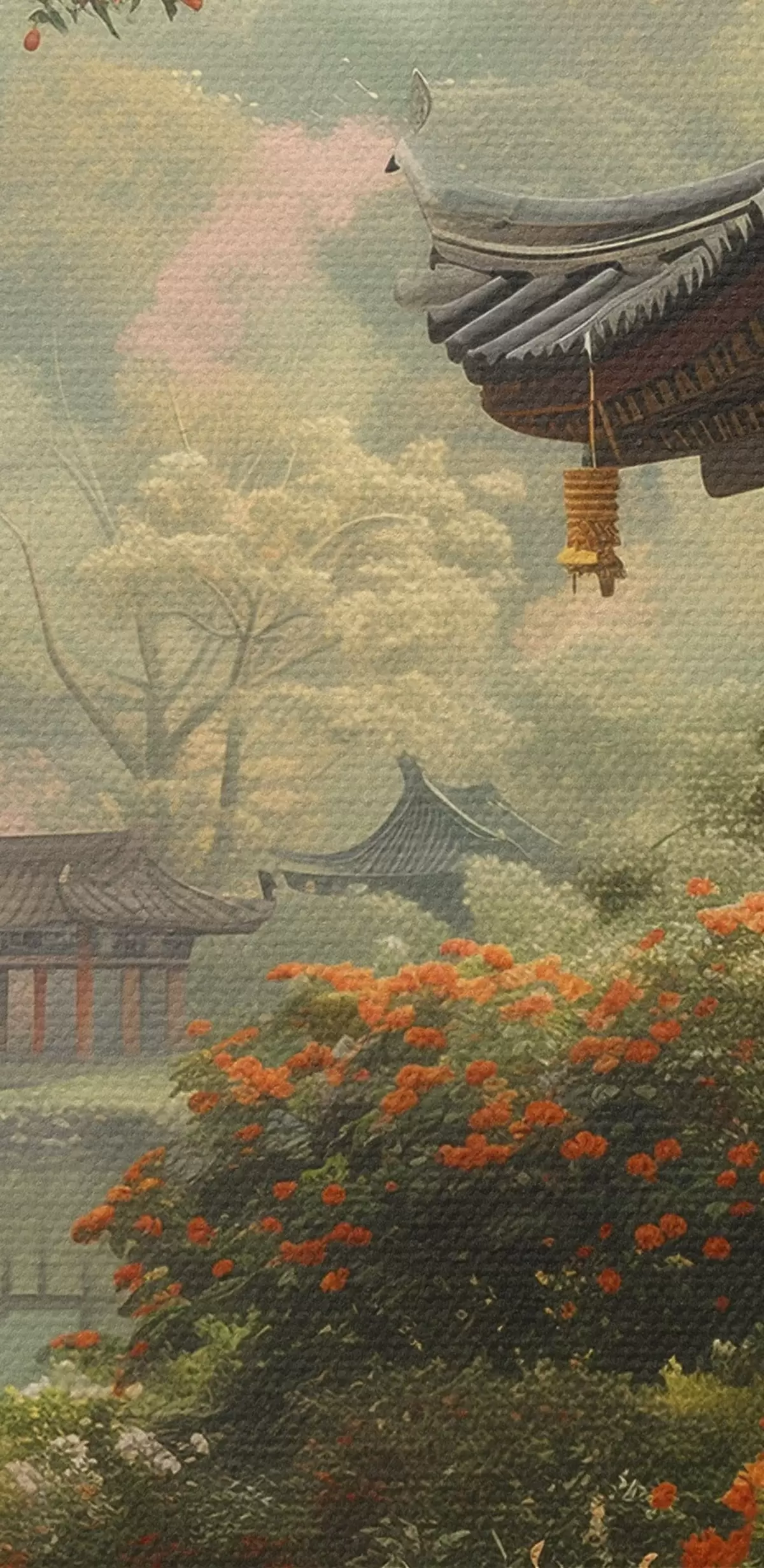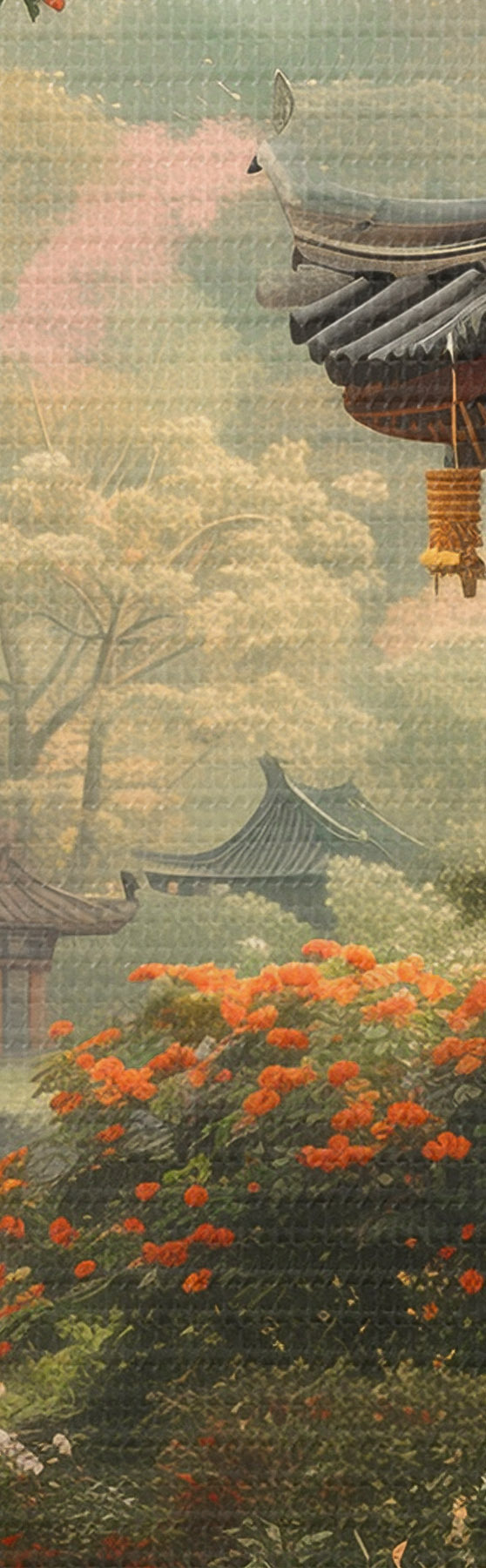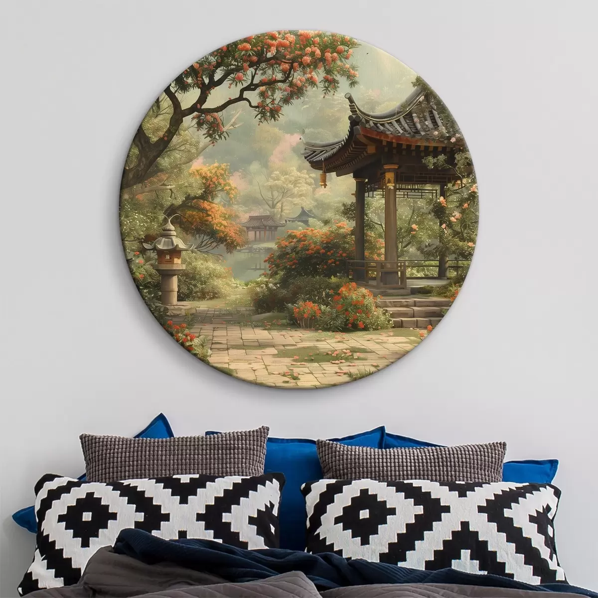 Nuotrauka Japoniškas parkas su žydinčiais medžiais ir gėlėmis, miškas, sodo namelis, ežeras Nr r39772