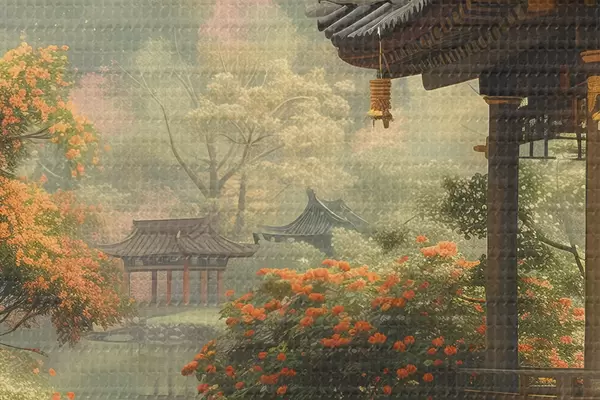 Nuotrauka Japoniškas parkas su žydinčiais medžiais ir gėlėmis, miškas, sodo namelis, ežeras Nr r39772