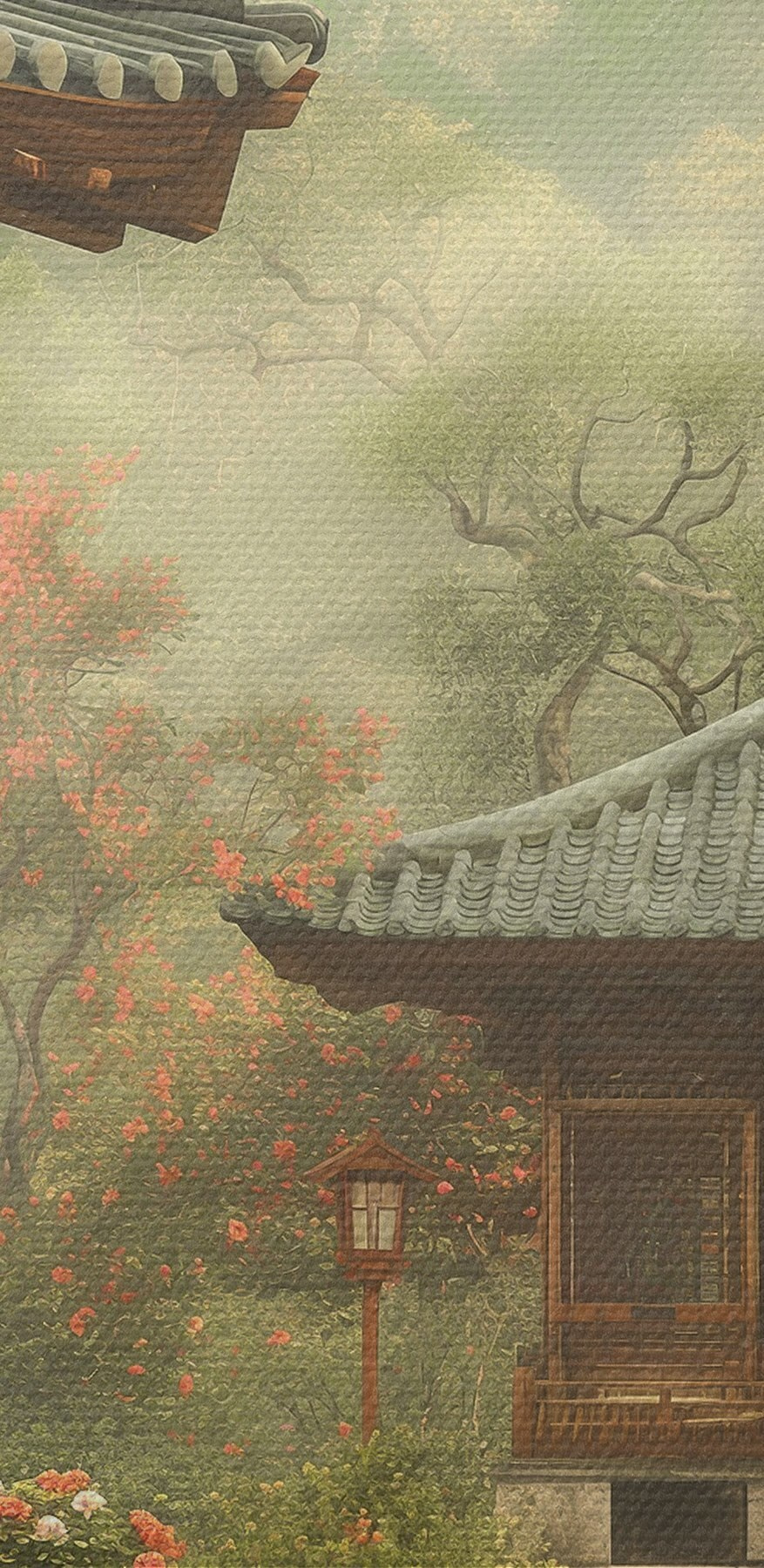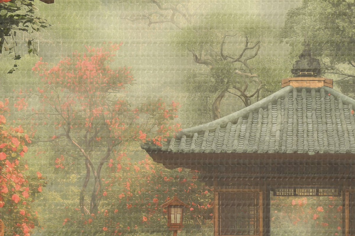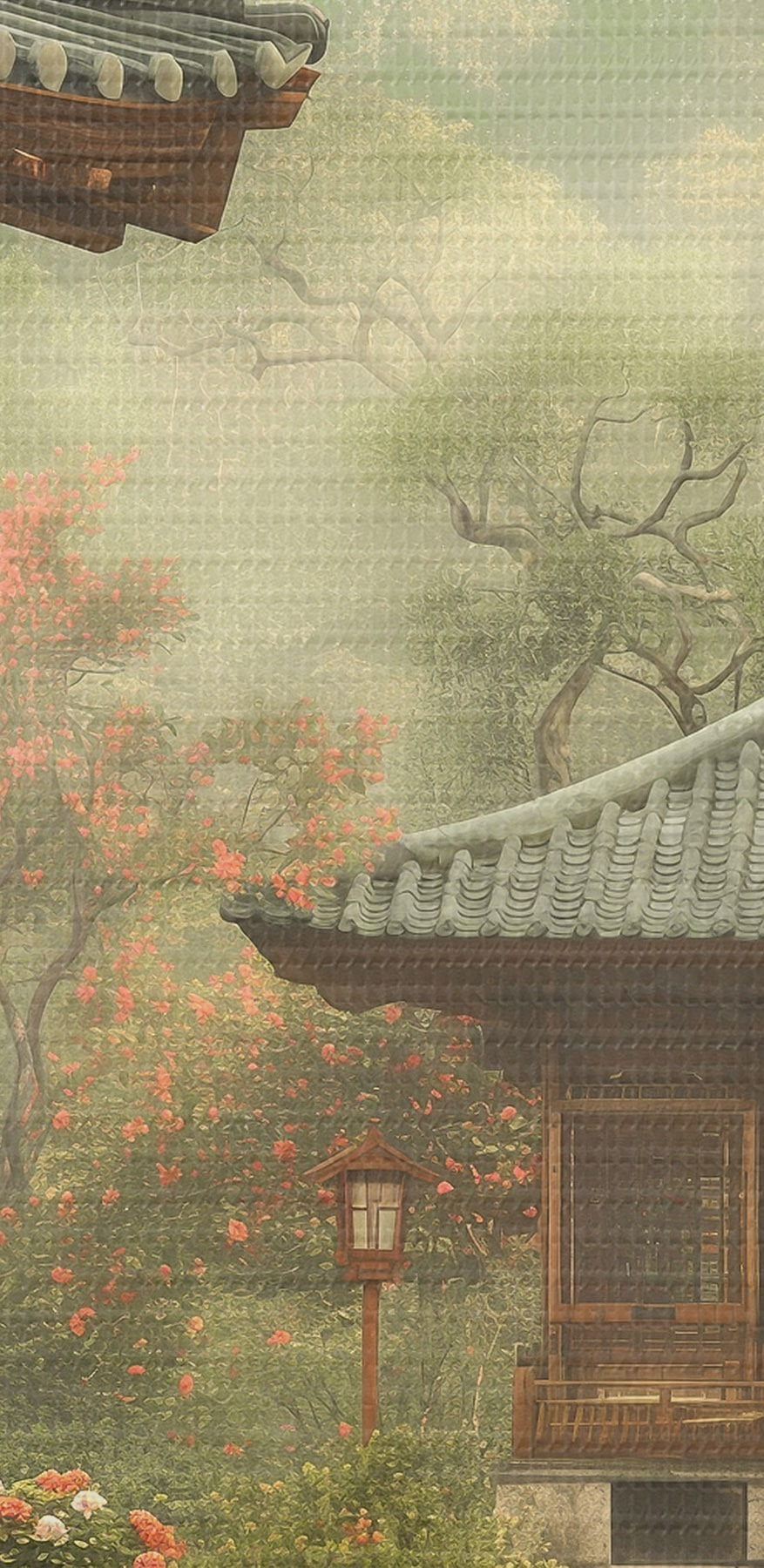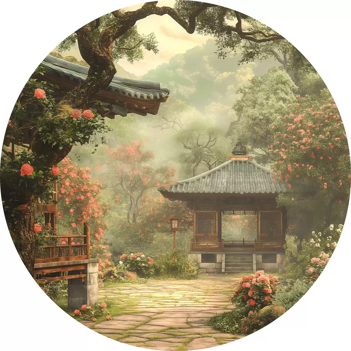 Nuotrauka Japoniškas parkas su žydinčiais medžiais ir gėlėmis, miškas, medinis namas Nr r39773