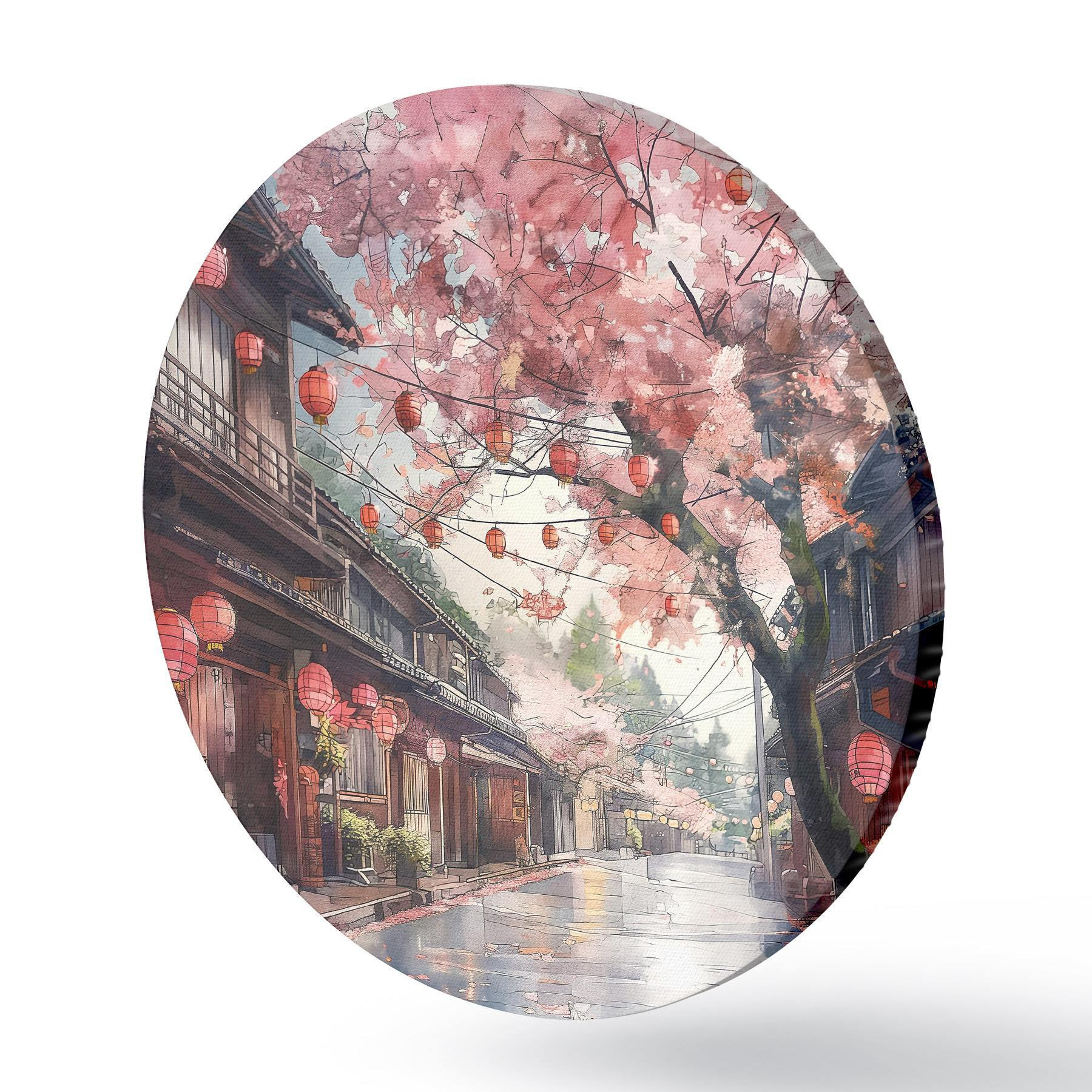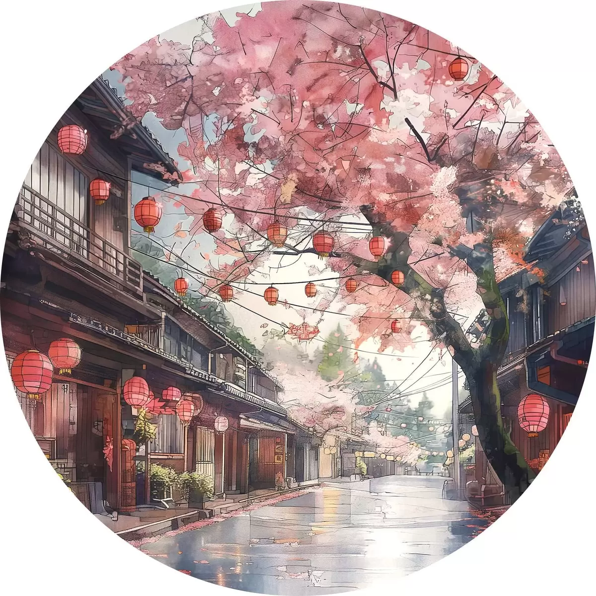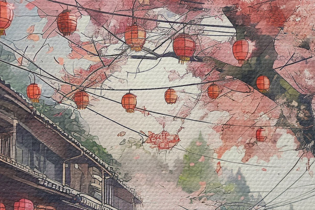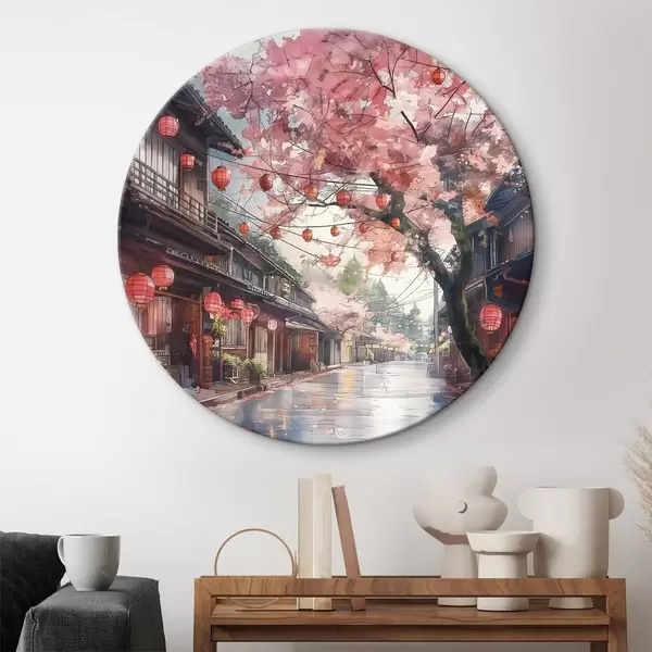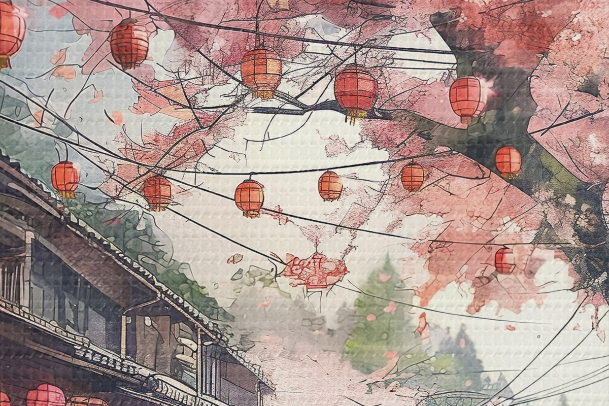 Nuotrauka Japoniška gatvė su žydinčiomis vyšniomis, rytietiška architektūra, žibintais Nr r39774