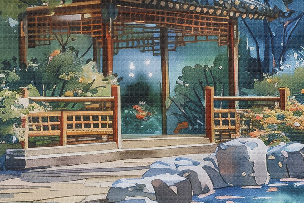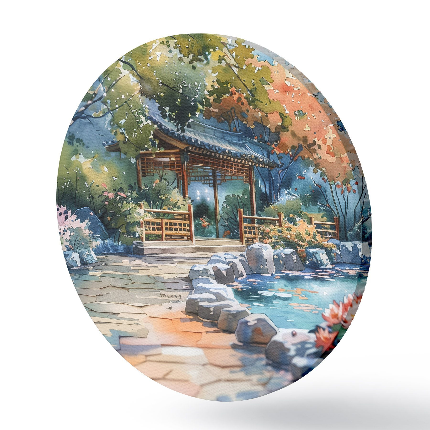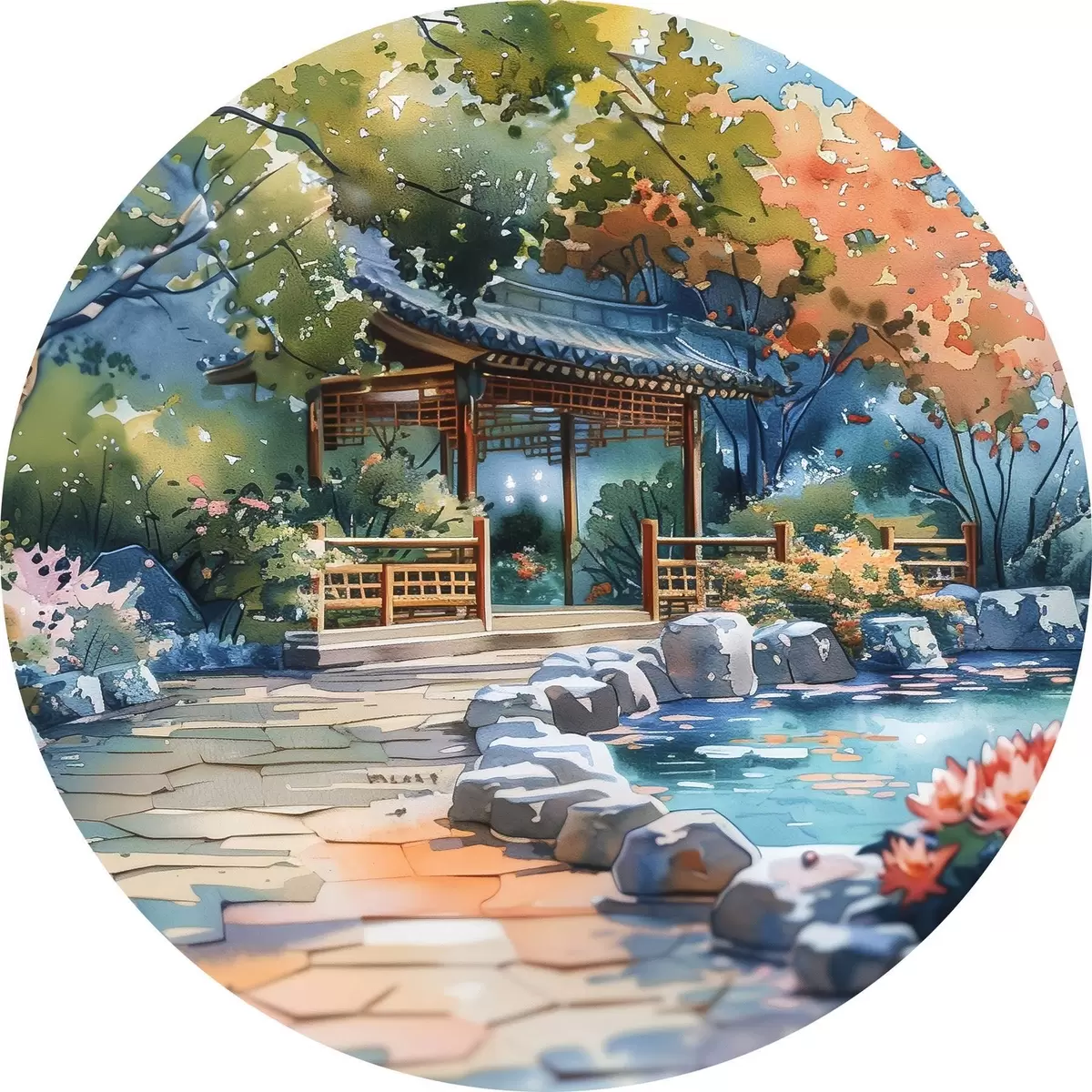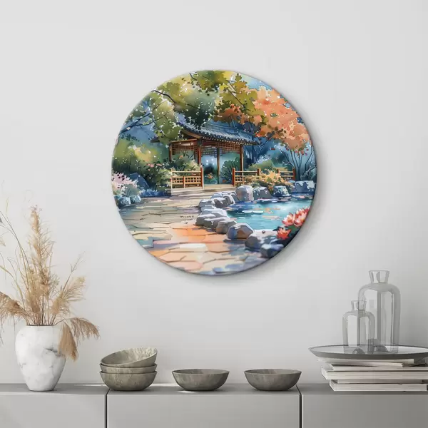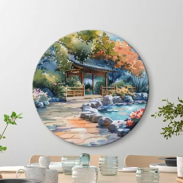 Nuotrauka Rytietiškas parkas su žydinčiais medžiais ir gėlėmis, tvenkinys su lotosais Nr r39776